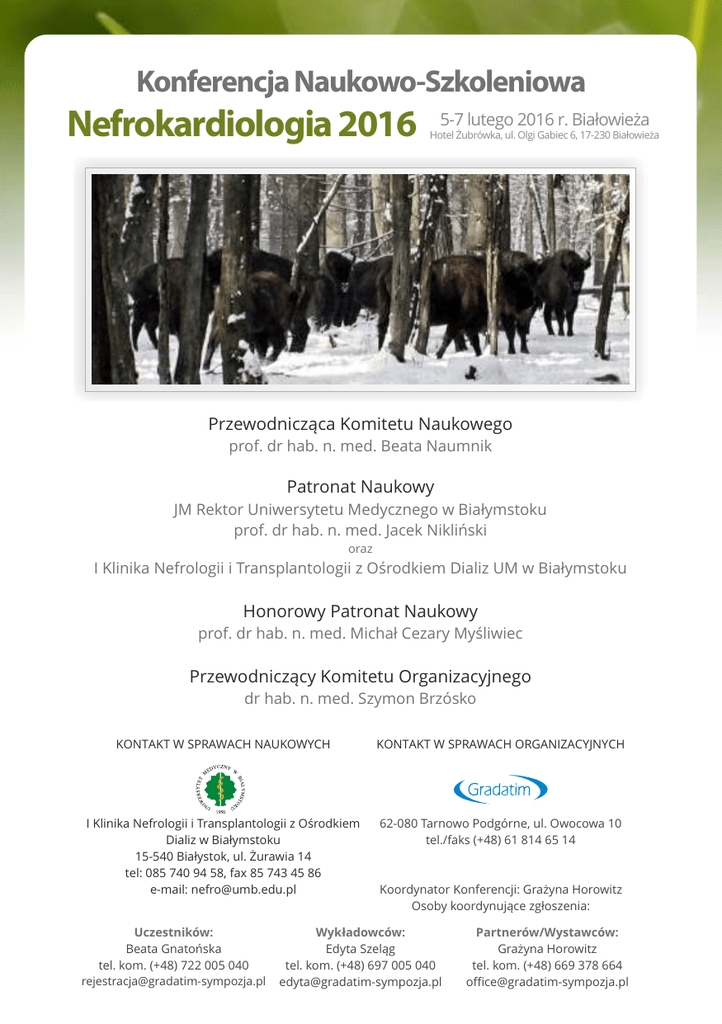 Konferencja Naukowo-Szkoleniowa Nefrokardiologia 2016 5-7 lutego 2016 r. Białowieża Hotel Żubrówka, ul. Olgi Gabiec 6, 17-230 Białowieża Przewodnicząca Komitetu Naukowego prof. dr hab. n. med. Beata Naumnik Patronat Naukowy JM Rektor Uniwersytetu Medycznego w Białymstoku prof. dr hab. n. med. Jacek Nikliński oraz I Klinika Nefrologii i Transplantologii z Ośrodkiem Dializ UM w Białymstoku Honorowy Patronat Naukowy prof. dr hab. n. med. Michał Cezary Myśliwiec Przewodniczący Komitetu Organizacyjnego dr hab. n. med. Szymon Brzósko KONTAKT W SPRAWACH NAUKOWYCH KONTAKT W SPRAWACH ORGANIZACYJNYCH I Klinika Nefrologii i Transplantologii z Ośrodkiem Dializ w Białymstoku 15-540 Białystok, ul. Żurawia 14 tel: 085 740 94 58, fax 85 743 45 86 e-mail: [email protected] 62-080 Tarnowo Podgórne, ul. Owocowa 10 tel./faks (+48) 61 814 65 14 Uczestników: Beata Gnatońska tel. kom. (+48) 722 005 040 [email protected] Koordynator Konferencji: Grażyna Horowitz Osoby koordynujące zgłoszenia: Wykładowców: Edyta Szeląg tel. kom. (+48) 697 005 040 [email protected] Partnerów/Wystawców: Grażyna Horowitz tel. kom. (+48) 669 378 664 [email protected] Konferencja Naukowo-Szkoleniowa Nefrokardiologia 2016 5-7 lutego 2016 r. Białowieża Hotel Żubrówka, ul. Olgi Gabiec 6, 17-230 Białowieża WYKŁAD INAUGURACYJNY „Otyłość jako czynnik sprawczy nadciśnienia tętniczego i przewlekłej choroby nerek” prof. dr hab. n. med. Andrzej Więcek Kierownik Katedry i Kliniki Nefrologii, Endokrynologii i Chorób Przemiany Materii SUM Prezydent Europejskiego Towarzystwa Nefrologicznego (ERA-EDTA - European Renal Association - European Dialysis and Transplant Association) TEMATY PRZEWODNIE 1. Nowe spojrzenie na nadciśnienie tętnicze 2. Choroba wieńcowa u chorego z PChN – odmienności kliniczne 3. Pacjent kardiologiczny z ostrym uszkodzeniem nerek 4. Powikłania infekcyjne u chorych z PChN leczonych immunosupresyjnie 5. Serce i nerki w chorobach układowych - planowana jest Sesja plakatowa ukierunkowana na ciekawe przypadki kliniczne oraz praktyczny kurs zakładania cewników permanentnych REJESTRACJA Rejestracji prosimy dokonywać wyłącznie poprzez formularz rejestracyjny znajdujący się na stronie www.nefrokardiologia.com do dnia 14.01.2016 r. (decyduje kolejność zgłoszeń z powodu ograniczonej liczby miejsc) OPŁATA Opłata rejestracyjna 450 PLN obejmuje: - materiały konferencyjne - identyfikator - przerwy kawowe, obiady, kolacje - certyfikat uczestnictwa Płatność przelewem do 21.01.2016 r. na rachunek: Gradatim Grażyna Horowitz ul. Owocowa 10, 62-080 Tarnowo Podgórne ING Bank Śląski 56 1050 1533 1000 0090 6672 9857 ZAKWATEROWANIE Organizator nie pośredniczy w rezerwacji miejsc noclegowych. PUNKTY EDUKACYJNE Na podstawie Rozporządzenia Ministra Zdrowia z dnia 06.10.2006 roku w sprawie dopełnienia obowiązku doskonalenia zawodowego lekarzy i lekarzy dentystów, Uczestnicy Konferencji otrzymują punkty edukacyjne.