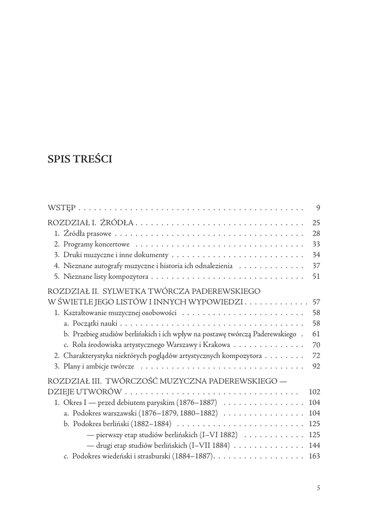 SPIS TREŚCI WSTĘP . . . . . . . . . . . . . . . . . . . . . . . . . . . . . . . . . . . . . . . . . . . . 9 ROZDZIAŁ I. ŹRÓDŁA. . . . . . . . . . . . . . . . . . . . . . . . . . . . . . . . . . 25 1. Źródła prasowe. . . . . . . . . . . . . . . . . . . . . . . . . . . . . . . . . . . . . . 28 2. Programy koncertowe . . . . . . . . . . . . . . . . . . . . . . . . . . . . . . . . . . 33 3. Druki muzyczne i inne dokumenty . . . . . . . . . . . . . . . . . . . . . . . . . . . 34 4. Nieznane autografy muzyczne i historia ich odnalezienia . . . . . . . . . . . . . . 37 5. Nieznane listy kompozytora . . . . . . . . . . . . . . . . . . . . . . . . . . . . . . . 51 ROZDZIAŁ II. SYLWETKA TWÓRCZA PADEREWSKIEGO . W ŚWIETLE JEGO LISTÓW I INNYCH WYPOWIEDZI. . . . . . . . . . . . . 57 1. Kształtowanie muzycznej osobowości . . . . . . . . . . . . . . . . . . . . . . . . . 58 a. Początki nauki . . . . . . . . . . . . . . . . . . . . . . . . . . . . . . . . . . . . . 58 b. Przebieg studiów berlińskich i ich wpływ na postawę twórczą Paderewskiego . . 61 c. Rola środowiska artystycznego Warszawy i Krakowa . . . . . . . . . . . . . . . 70 2. Charakterystyka niektórych poglądów artystycznych kompozytora . . . . . . . . . 72 3. Plany i ambicje twórcze . . . . . . . . . . . . . . . . . . . . . . . . . . . . . . . . . 92 ROZDZIAŁ III. TWÓRCZOŚĆ MUZYCZNA PADEREWSKIEGO — DZIEJE UTWORÓW . . . . . . . . . . . . . . . . . . . . . . . . . . . . . . . . . . . 102 1. Okres I — przed debiutem paryskim (1876–1887) . . . . . . . . . . . . . . . . . 104 a. Podokres warszawski (1876–1879, 1880–1882) . . . . . . . . . . . . . . . . . 104 b. Podokres berliński (1882–1884) . . . . . . . . . . . . . . . . . . . . . . . . . . 125 — pierwszy etap studiów berlińskich (I–VI 1882) . . . . . . . . . . . . . 125 — drugi etap studiów berlińskich (I–VII 1884). . . . . . . . . . . . . . . 144 c. Podokres wiedeński i strasburski (1884–1887). . . . . . . . . . . . . . . . . . . 163 Spis treści 2. Okres II — po debiucie paryskim (1888–1917) . . . . . . . . . . . . . . . . . . . 194 a. Drugi podokres wiedeński oraz paryski (1888–1897) . . . . . . . . . . . . . . 194 b. Podokres szwajcarski (1901–1917) . . . . . . . . . . . . . . . . . . . . . . . . . 204 ROZDZIAŁ IV. DEDYKACJE UTWORÓW . . . . . . . . . . . . . . . . . . . . . 218 1. Dedykacje i ich rodzaje . . . . . . . . . . . . . . . . . . . . . . . . . . . . . . . . . . 220 2. Kategorie dedykacji Paderewskiego, ich geneza i bohaterowie . . . . . . . . . . . . 221 a. Dedykacje mające związek z powstaniem utworu . . . . . . . . . . . . . . . . . 222 b. Dedykacje o charakterze kurtuazyjnym i okolicznościowym. . . . . . . . . . . 226 c. Dedykacje dla potencjalnych wykonawców utworu . . . . . . . . . . . . . . . . 239 d. Dedykacje dla osób nieznanych i niewzmiankowanych w listach . . . . . . . . 247 3. Bohaterowie dedykacji Paderewskiego w relacji kompozytora . . . . . . . . . . . . 252 a. Pedagodzy . . . . . . . . . . . . . . . . . . . . . . . . . . . . . . . . . . . . . . . 254 b. Przyjaciele, znajomi, znani artyści. . . . . . . . . . . . . . . . . . . . . . . . . . 267 c. Muzy i damy serca kompozytora . . . . . . . . . . . . . . . . . . . . . . . . . . 281 Helena Górska — wielka miłość i muza kompozytora. . . . . . . . . . . 282 Anette Jesipowa — cicerone kariery pianistycznej artysty. . . . . . . . . . 293 Rumuńskie arystokratki — wielbicielki Paderewskiego . . . . . . . . . . . 296 4. Próba wyznaczenia cech osobowości kompozytora (na przykładzie postaw i zachowań w relacjach interpersonalnych). . . . . . . . . . . . . . . . . . . . . . . . . 305 a. Model „osobowości twórczej” wg Edwarda Nęcki . . . . . . . . . . . . . . . . . 307 b. Cechy „osobowości twórczej” Paderewskiego . . . . . . . . . . . . . . . . . . . . 308 c. Przykłady postaw i zachowań kompozytora . . . . . . . . . . . . . . . . . . . . 310 Postawa wobec młodzieńczych autorytetów (ojca, pedagogów). . . . . . 310 Postawa wobec kolegów, sławnych kompozytorów i pianistów . . . . . . . 313 Postawa wobec kobiet. . . . . . . . . . . . . . . . . . . . . . . . . . . . . . 317 d. Niektóre cechy osobowości kompozytora (w świetle jego listów) . . . . . . . . 319 ROZDZIAŁ V. SPOŁECZNE FUNKCJONOWANIE KOMPOZYCJI . PADEREWSKIEGO. . . . . . . . . . . . . . . . . . . . . . . . . . . . . . . . . . . . . 328 1. Aktywność kompozytora w propagowaniu własnych dzieł . . . . . . . . . . . . . . 331 a. Prawykonania utworów i pierwsze recenzje . . . . . . . . . . . . . . . . . . . . 331 Prawykonania kompozycji Paderewskiego (w układzie chronologicznym; prezentacja źródeł). . . . . . . . . . . . . . . . . . . . . . . . . . . . . 331 Krótka charakterystyka recenzji utworów Paderewskiego. . . . . . . . . . 370 Recenzje prasowe a dalsze funkcjonowanie utworów Paderewskiego. . . . 371 Komentarze prasowe na temat wykonawstwa kompozytora . . . . . . . . 376 b. Koncerty kompozytorskie Paderewskiego . . . . . . . . . . . . . . . . . . . . . 383 Pierwszy koncert kompozytorski (Berlin 1883 r.) . . . . . . . . . . . . . . 383 Drugi koncert kompozytorski (Warszawa 1885 r.). . . . . . . . . . . . . . 386 c. Kontakty twórcy z wydawcami . . . . . . . . . . . . . . . . . . . . . . . . . . . 392 Spis treści 2. Uwarunkowania kulturowo-społeczne wykonań utworów Paderewskiego. . . . . 398 a. Postawa kompozytora-wykonawcy („służba” wobec publiczności) . . . . . . . . 400 b. Publiczność Paderewskiego . . . . . . . . . . . . . . . . . . . . . . . . . . . . . 404 c. Agenci koncertowi i reklama. . . . . . . . . . . . . . . . . . . . . . . . . . . . . 409 d. Recenzenci polscy. . . . . . . . . . . . . . . . . . . . . . . . . . . . . . . . . . . 413 3. Przejawy popularności utworów Paderewskiego . . . . . . . . . . . . . . . . . . . . 424 a. Wczesne utwory w repertuarze sławnych artystów . . . . . . . . . . . . . . . . 424 b. Głosy 