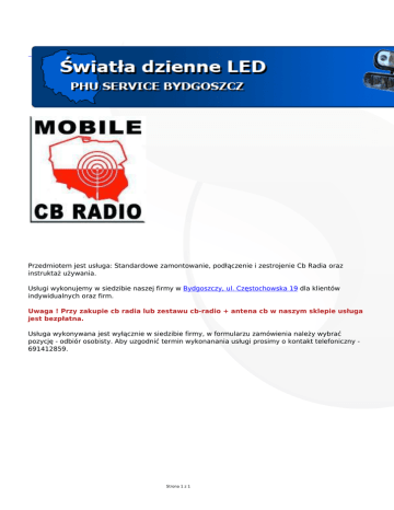 Przedmiotem jest usługa: Standardowe zamontowanie, podłączenie i zestrojenie Cb Radia oraz instruktaż używania. Usługi wykonujemy w siedzibie naszej firmy w Bydgoszczy, ul. Częstochowska 19 dla klientów indywidualnych oraz firm. Uwaga ! Przy zakupie cb radia lub zestawu cb-radio + antena cb w naszym sklepie usługa jest bezpłatna. Usługa wykonywana jest wyłącznie w siedzibie firmy, w formularzu zamówienia należy wybrać pozycję - odbiór osobisty. Aby uzgodnić termin wykonanania usługi prosimy o kontakt telefoniczny 691412859. Strona 1 z 1
