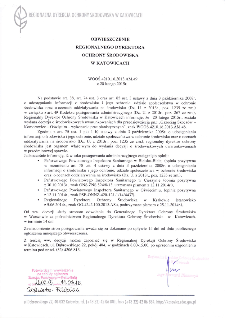 ",\§N:§ ..§r "§ \\ \ ":,\ \ OBWIESZCZENIE REGIONALNEGO DYREKTORA oCHRoNy ŚnonoWISKA W KATOWICACH WooŚ.42 1 0 .1 6.201 3. AM.49 z 20 lutego 20I5r. Na podstawie art. 38, art,74 ust. 3 oraz art. 85 ust. 3 ustawy z dnia 3 października 2008r. o udostępnianiu informacji o środowiskui jego ochronie, udziale społeczeństwa w ochronie środowiska oraz oocenach oddziaływania na środowisko (Dz. U. z 20I3r., poz, 1235 ze zm.) w związku zart.49 Kodeksu postępowania administracyjnego (Dz. U. z 2013r., poz. 267 ze zm.), Regionalny Dyrektor Ochrony Srodowiska w Katowicach informuje, że 20 lutego 20I5r., została wydana decyzja o środowiskowych uwarunkowaniach dla przedsięwzięcia pn.: ,,Gazociąg Skoczów Komorowice - Oświęcim - wykonanie prac planistycznych", znak WOOS.4210.1ó.2013.AM.48. Zgodnie z art. 75 ust. 1 pkt 1 b) ustawy z dnia 3 października 2008r. o udostępnianiu informacji o środowisku i jego ochronie, udziale społeczeństwa w ochronie środowiska oraz o ocenach oddziaływania na środowisko (Dz, U. z 2013r,,poz. 1235 ze zm.), regionalny dyrektor ochrony środowiska jest organem właściwymdo wydania decyzji o środowiskowych uwarunkowaniach w przedmiotowej sprawie. Jednocześnieinformuję, iz w toku postępowania administracyjnego zasięgnięto opinii: . Państwowego Powiatowego Inspektora Sanitarnego w Bielsku-Białej (opinia pozytyw,na w rozumieniu art. 78 ust. 4 ustawy z dnia 3 października 2008r. o udostępnianiu informacji o środowisku i jego ochronie, udziale społeczeństwa w ochronie środowiska oraz o ocenach oddziaływania na środowisko (Dz, U. z ż0l3r., poz. 1235 ze zm,), . Państwowego Powiatowego Inspektora Sanitarnego w Cieszynie (opinia pozytywna z 30.I0.20l3r., znak ONS ZNS 524 l 8 l 13, utrzy mana pismem z 1ż.I L20I 4r.), . Państwowego Powiatowego Inspektora Sanitarnego w Oświęcimiu,(opinia pozytywna z I 2.I I .20l 4r ., znak PSE-ONNZ -420 -1 2I -7 l I 4 l 4437), . Regionalnego Dyrektora Ochrony Środowiska z 5.06.20I4r., znak Oo-.4242.100.2013.ASu, Od ww. decyzji słuzy stronom odwołanie do w Warszawie za w terminie 14 dni. w Krakowie (stanowisko podtrzymane pismem z25.IL2014r.), Generalnego Dyrektora Ochrony Srodowiska w Katowicach, pośrednictwem Regionalnego Dyrektora Ochrony Srodowiska Zawiadomienie stron postępowania uważa się za dokonane po upływie 14 dni od dnia publicznego ogłoszenia niniej szego obw ieszczenia. Z treściąww. decyzji można zapoznac się w Regionalnej Dyrekcji Ochrony Srodowiska w Katowicach, ul. Dąbrowskiego 22, pokój 404, w godzinach 8.00-15.00, po uprzednim uzgodnieniu terminu pod nr tel. (32) 4206 8I3. Poiwierrj ra rlr i,1,1.,Wi eszen * na t;Łrliq,,,-,iic;,.,eń t Starostvrl Poi"iaiol,,:i.llj -r r.36ot,l5,," C,tu*:+ę- v,, ?ielsku-8ialei ,',."4 4,,,9 g,iE rłw?CĄ . |n