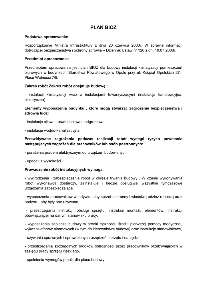 PLAN BIOZ Podstawa opracowania: Rozporządzenie Ministra Infrastruktury z dnia 23 czerwca 2003r. W sprawie informacji dotyczącej bezpieczeństwa i ochrony zdrowia – Dziennik Ustaw nr 120 z dn. 10.07.2003r. Przedmiot opracowania: Przedmiotem opracowania jest plan BIOZ dla budowy instalacji klimatyzacji pomieszczeń biurowych w budynkach Starostwa Powiatowego w Opolu przy ul. Książąt Opolskich 27 i Placu Wolności 7/8. Zakres robót Zakres robót obejmuje budowę : - instalacji klimatyzacji wraz z instalacjami towarzyszącymi (instalacja kanalizacyjna, elektryczna) Elementy wyposażenia budynku , które mogą stwarzać zagrożenie bezpieczeństwa i zdrowia ludzi - instalacje siłowe , oświetleniowe i odgromowe - instalacje wodno-kanalizacyjna Przewidywane zagrożenia podczas realizacji robót wystąpi ryzyko powstania następujących zagrożeń dla pracowników lub osób postronnych: - porażenia prądem elektrycznym od urządzeń budowlanych - upadek z wysokości Prowadzenie robót instalacyjnych wymaga: - wygrodzenia i zabezpieczenia robót w okresie trwania budowy . W czasie wykonywania robót wykonawca dostarczy, zainstaluje i będzie obsługiwał wszystkie tymczasowe urządzenia zabezpieczające. - wyposażenia pracowników w indywidualny sprzęt ochronny i właściwą odzież roboczą oraz nadzoru, aby były one używane, - przestrzegania instrukcji obsługi sprzętu, instrukcji montażu elementów, instrukcji obowiązującej na danym stanowisku pracy, - wyposażenia zaplecza budowy w środki łączności, środki pierwszej pomocy medycznej, wykaz telefonów alarmowych (w tym do kierownictwa budowy) oraz instrukcje stanowiskowe, - używania sprawnych i sprawdzonych urządzeń, sprzętu i narzędzi, - przestrzegania szczególnych środków ostrożności przez pracowników przebywających w zasięgu pracy sprzętu ciężkiego, - spełnienia wymogów p.poż. dla placu budowy, - zapewnienia należytego nadzoru nad realizacją robót, - ochrona środowiska w trakcie wykonywania robót - stosowanie przepisów i norm dotyczących ochrony środowiska na terenie i wokół budowy dotyczących nadmiaru hałasu, wibracji i zanieczyszczeń cieków wodnych pyłami i środkami toksycznymi Ochrona własności publicznej i prywatnej, przez ochronę instalacji obiektu. Wykonawca zapewni właściwe oznakowanie i zabezpieczenie przed uszkodzeniem tych instalacji i urządzeń w czasie trwania budowy. Bezpieczeństwo i higiena pracy Podczas realizacji robót Wykonawca będzie przestrzegać przepisów dotyczących bezpieczeństwa i higieny pracy w szczególności: - personel nie będzie wykonywał pracy w warunkach niebezpiecznych i szkodliwych dla zdrowia oraz nie spełniających odpowiednich wymagań sanitarnych - zapewnienie i utrzymanie wszelkich urządzeń zabezpieczających, socjalnych oraz sprzętu i odpowiedniej odzieży dla ochrony życia i zdrowia osób zatrudnionych na budowie - prace ziemne w pobliżu czynnych urządzeń elektroenergetycznych należy prowadzić dopiero po ich wyłączeniu Zagrożenia występujące przy robotach elektrycznych. Roboty powinny być prowadzone na podstawie projektu z zachowaniem szczególnej ostrożności. Sposób prowadzenia instruktażu pracowników: Przed przystąpieniem do realizacji robót upoważniona osoba z kierownictwa budowy winna przeszkolić pod względem BHP robotników i operatorów sprzętu na stanowisku pracy ze specjalnym zwróceniem uwagi na zasady wykonywania robót szczególnie niebezpiecznych, zasady postępowania w przypadku występowania zagrożenia oraz konieczności stosowania środków ochrony indywidualnej, zabezpieczających przed skutkami zagrożeń. Ważne jest omówienie podstawowych, najczęściej występujących bezpośrednich przyczyn wypadków na budowach o podobnym charakterze (np. błędy w organizacji pracy, nieprawidłowy nadzór, ryzykowne zachowania pracowników), a także przyczyn pośrednich (np. pośpiech, chęć zaoszczędzenia na kosztach sprzętu lub materiałów). Szkolenie w dziedzinie bezpieczeństwa i higieny pracy dla pracowników zatrudnionych na stanowiskach robotniczych przeprowadza się jako: - szkolenie wstępne - szkolenie okresowe Szkolenia te przeprowadzane są w oparciu o programy poszczególnych rodzajów szkolenia. Szkolenia wstępne, ogólne (instruktaż ogólny) przechodzą wszyscy nowo zatrudnieni pracownicy przed dopuszczeniem do wykonywania pracy. Obejmuje ono zapoznanie pracowników z podstawowymi przepisami bhp i regulaminach pracy, zasadami obowiązującymi w danym zakładzie pracy oraz zasadami udzielania pierwszej pomocy. Szkolenie okresowe w zakresie bhp dla pracowników zatrudnionych na stanowiskach robotniczych, powinny być przeprowadzane w formie instruktażu nie rzadziej niż raz na trzy lata, a na stanowiskach pracy, na których występują szczególne zagrożenia dla zdrowia lub życia oraz zagrożenia wypadkowe, nie rzadziej niż raz w roku. Pracownicy zatrudnieni na stanowiskach operatorów żurawi, maszyn budowlanych i innych maszyn o napędzie silnikowym powinni posiadać wymagane kwalifikacje. Na placu budowy powinny być udostępnione pracownikom do stałego korzystania, aktualne instrukcje bhp dotyczące: - wykonywania prac związanych z zagrożeniami wypadkowymi lub zagrożeniami zdrowia pracowników - obsługi maszyn i innych urządzeń technicznych - postępowania z materiałami szkodliwymi dla zdrowia i niebezpiecznymi - udzielania pierwszej pomocy Nie wolno dopuścić pracownika do pracy, do której wykonywania nie posiada wymaganych kwalifikacji lub potrzebnych umiejętności, a także dostatecznej znajomości przepisów oraz zasad BHP. Środki techniczne i organizacyjne zapobiegające niebezpieczeństwem Bezpośredni nadzór nad bezpieczeństwem i higieną pracy na stanowiskach pracy sprawują odpowiedni kierownik budowy (kierownik robót) oraz mistrz budowlany, stosownie do zakresu obowiązków. Nieprzestrzeganie przepisów bhp na placu budowy prowadzi do powstani