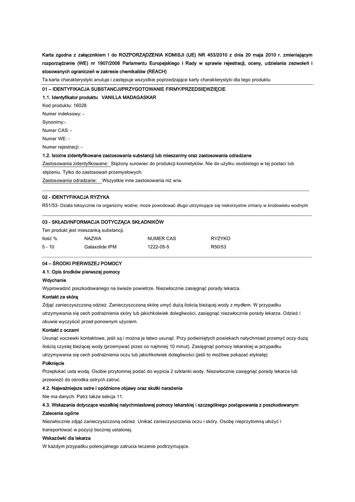 Karta zgodna z za cznikiem I do ROZPORZ DZENIA KOMISJI (UE) NR 453/2010 z dnia 20 maja 2010 r. zmieniaj cym rozporz dzenie (WE) nr 1907/2006 Parlamentu Europejskiego i Rady w sprawie rejestracji, oceny, udzielania zezwole i stosowanych ogranicze w zakresie chemikaliów (REACH) Ta karta charakterystyki anuluje i zast puje wszystkie poprzedzaj ce karty charakterystyki dla tego produktu 01 – IDENTYFIKACJA SUBSTANCJI/PRZYGOTOWANIE FIRMY/PRZEDSI WZI CIE 1.1. Identyfikator produktu VANILLA MADAGASKAR Kod produktu: 16028 Numer indeksowy: Synonimy:Numer CAS: Numer WE: Numer rejestracji: 1.2. Istotne zidentyfikowane zastosowania substancji lub mieszaniny oraz zastosowania odradzane Zastosowania zidentyfikowane: St st ony surowiec do produkcji kosmetyków. Nie do u ytku osobistego w tej postaci lub eniu. Tylko do zastosowa przemys owych. Zastosowania odradzane: Wszystkie inne zastosowania ni w/w. ________________________________________________________________________________________________________________ 02 - IDENTYFIKACJA RYZYKA R51/53- Dzia a toksycznie na organizmy wodne; mo e powodowa d ugo utrzymuj ce si niekorzystne zmiany w rodowisku wodnym _________________________________________________________________________________________________________________ 03 - SK AD/INFORMACJA DOTYCZ CA SK ADNIKÓW Ten produkt jest mieszank substancji. Ilo % 5 - 10 NAZWA NUMER CAS RYZYKO Galaxolide IPM 1222-05-5 R50/53 _________________________________________________________________________________________________________________ 04 – RODKI PIERWSZEJ POMOCY 4.1. Opis rodków pierwszej pomocy Wdychanie Wyprowadzi poszkodowanego na wie e powietrze. Niezw ocznie zasi gn porady lekarza. Kontakt ze skór Zdj zanieczyszczon odzie . Zanieczyszczon skór umy du ilo ci bie cej wody z myd em. W przypadku utrzymywania si cech podra nienia skóry lub jakichkolwiek dolegliwo ci, zasi gn niezw ocznie porady lekarza. Odzie i obuwie wyczy ci przed ponownym u yciem. Kontakt z oczami Usun soczewki kontaktowe, je li s i mo na je atwo usun ilo ci czystej bie . Przy podwini tych powiekach natychmiast przemy oczy du cej wody (przemywa przez co najmniej 10 minut). Zasi gn pomocy lekarskiej w przypadku utrzymywania si cech podra nienia oczu lub jakichkolwiek dolegliwo ci (je li to mo liwe pokaza etykiet ). Po kni cie Przep uka usta wod . Osobie przytomnej poda do wypicia 2 szklanki wody. Niezw ocznie zasi gn przewie porady lekarza lub do o rodka ostrych zatru . 4.2. Najwa niejsze ostre i opó nione objawy oraz skutki nara enia Nie ma danych. Patrz tak e sekcja 11. 4.3. Wskazania dotycz ce wszelkiej natychmiastowej pomocy lekarskiej i szczególnego post powania z poszkodowanym Zalecenia ogólne Niezw ocznie zdj zanieczyszczon odzie . Unika zanieczyszczenia oczu i skóry. Osob nieprzytomn u transportowa w pozycji bocznej ustalonej. Wskazówki dla lekarza W ka dym przypadku potencjalnego zatrucia leczenie podtrzymuj ce. i 05 – POST POWANIE W PRZYPADKU PO ARU 5.1. rodki ga nicze Odpowiednie rodki ga nicze: Suche proszki ga nicze, ditlenek w gla, alkoholoodporna piana ga nicza, rozpylona woda. Zagro one po arem pojemniki ch odzi wiod . Niew ciwe rodki ga nicze: W zale no ci od otoczenia. 5.2. Szczególne zagro enia zwi zane z substancj lub mieszanin Nie wdycha dymów i gazów wytwarzaj cych si podczas po aru. Patrz tak e sekcja 10. 5.3. Informacje dla stra y po arnej W zale no ci od nasilenia po aru nosi aparaty oddechowe z niezale nym ród em powietrza oraz rodki ochrony (sprz t ochronny). Zu yte rodki ga nicze zebra i usun zgodnie z obowi zuj cymi przepisami ________________________________________________________________________________________________________________ 06 – POST POWANIE W PRZYPADKU NIEZMIERZONEGO UWOLNIENIA DO RODOWISKA 6.1. Indywidualne rodki ostro no ci, wyposa enie ochronne i procedury w sytuacjach awaryjnych Dla osób nienale cych do personelu udzielaj cego pomocy Zabroni dost pu osobom postronnym do miejsca ska enia. Dla osób udzielaj cych pomocy Nosi zalecane rodki ochrony indywidualnej (patrz sekcja 8).Nie wdycha par. Unika zanieczyszczenia skóry. Nie pali tytoniu. Usun ród a otwartego p omienia i inne potencjalne ród a zap onu, np. iskrz ce urz dzenia elektryczne. Umy cale cia o po usuni ciu wycieku. Zapewni odpowiedni wentylacj w miejscu pracy, gdzie nast pi wyciek produktu. 6.2. rodki ostro no ci w zakresie ochrony rodowiska Nie dopuszcza do przedostawania si produktu do gleby, kanalizacji, rowów, cieków wodnych. Zawiadomi odpowiednie s by w przypadku zanieczyszczenia rodowiska. 6.3. Metody i materia y zapobiegaj ce rozprzestrzenianiu si ska enia i s ce do usuwania ska enia Wycieki produktu obwa owa , aby nie dopu ci do jego rozprzestrzeniania si , zasypa oboj tnym materia em poch aniaj cym ciecze, np. piaskiem, ziemi , ziemi okrzemkow i zebra mechanicznie do oznakowanych pojemników na odpady. Odpady usuwa zgodnie z zaleceniami z sekcji 13. Zapewni odpowiedni wentylacj . Uwaga: opisano przypadki samozap onu szmat nas czonych podobnymi produktami. 6.4. Odniesienia do innych sekcji Sprz t ochronny i odzie - patrz sekcja 8. Unieszkodliwianie odpadu - patrz sekcja 13. ________________________________________________________________________________________________________________ O7 – PRZECHOWYWANIE I POST POWANIE Zaleca si zwrócenie uwagi na rodki ostro no ci podane na pojemniku. -Post powanie: Unika kontaktu z oczami i skór . Zak ada odpowiednie r kawiczki (najlepiej z naturalnej gumy) oraz odpowiedni ochronn . Obowi zuje zakaz palenia. Unika odzie bezpo redniego ognia/ p omieni lub innych potencjalnych róde zap onu (np. urz dze elektrycznych). Je li nie jest to konieczne, nie poddawa nieuzasadnionemu dzia aniu wysokich temperatur w trakcie ycia. Nie wstrzykiwa czy smarowa skóry. Wskazane jest dok adne mycie ca ego cia a. Zapewni odpowiednia, adekwatna wentylacja w miejscach produkcji. - Przechowywanie: Przechowywa w zamkni tych pojemnikach z dala od róde ciep a, powietrza lub wiat a, or