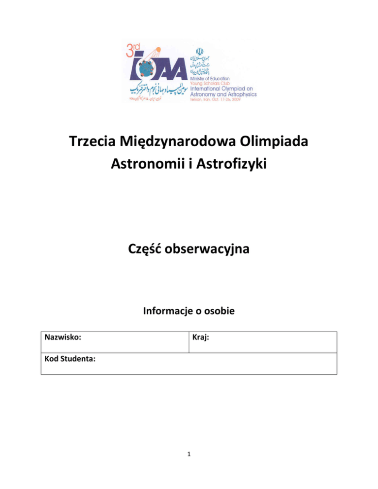 Trzecia Międzynarodowa Olimpiada Astronomii i Astrofizyki Częśd obserwacyjna Informacje o osobie Nazwisko: Kraj: Kod Studenta: 1 Przeczytaj uważnie tę instrukcję: 1. Każdy uczestnik otrzymuje od organizatorów komplet zadao, podkład do notowania, długopis, linijkę i oświetlenie do zamocowania na głowie. 2. Ta częśd konkursu składa się z dwóch części: i) Dwa pytania “Okiem nieuzbrojonym”. Masz 12 minut na odpowiedź na obydwa. ii) Jedno pytanie “Obserwacje teleskopowe”. Na każdą częśd przypada określony czas, który jest zaznaczony na arkuszu. 3. Każdy uczestnik będzie doprowadzony przez asystenta do stanowiska obserwcyjnego z wyznaczonego pomieszczenia. Asystenci zbierają arkusze pytao i odpowiedzi. 4. Nie zapomnij wypełnid pola na każdym arkuszu odpowiedzi z Nazwą Kraju oraz Kodu Studenta. 5. Masz 2 minuty na przyzwyczajenie się do otoczenia i ciemności tuż przed rozpoczęciem eliminacji. 6. Egzaminator sygnalizuje rozpoczęcie i zakooczenie każdej części zawodów. 7. Każde zadanie posiada właściwą wskazówkę, która może byd pomocna w rozwiązaniu. 2 Trzecia Międzynarodowa Olimpiada Astronomii i Astrofizyki Częśd obserwacyjna Okiem nieuzbrojonym Czas: 12 minut 3 Masz 12 minut aby odpowiedzied na pytania z części Okiem nieuzbrojonym (Pytanie 1 i Pytanie 2) Pytanie 1 1.1: Na Rysunku 1 (pole o rozmiarach ≅ 100° × 70°) przedstawiono fragment nieba w dniu 22 października 2009 r. o godz. 21:00 czsu urzędowego. W gwiazdozbiorach Perseusza i Andromedy brakuje czterech jasnych gwiazd. Znajdź brakujące gwiazdy patrząc na niebo. Następnie zaznacz krzyżem pozycję każdej z brakujących gwiazd w tych gwiazdozbiorach na mapie (Rysunek 1). Do oznaczenia krzyża używaj numerów z tabeli 1-1. (40 Punktów) Table 1-1 Numer 1 2 3 4 5 6 7 8 9 10 11 Nazwa Mirfak Alpheratz Menkib Algol Almach Mirach Atik 4 Ozn. Bayera Alpha Persei Alpha Andromeda Epsilon Persei Xi Persei Gamma Persei Beta Persei Gamma Andromeda Delta Andromeda 51 Andromeda Beta Andromeda Zeta Persei Nazwisko: Kod Studenta: Kraj: Pytanie 1 - Rysunek 1 5 Pytanie 2 2.1: Na Rysunku 2 przedstawiono fragment nieba zawierający gwiazdozbiór Cefeusza w dniu 22 października 2009 r. o godz 22:00 czasu urzędowego. Pięd jasnych gwiazd z gwiazdozbioru Cefeusza są oznaczone cyframi (1, 2, … , 5) oraz podano ich nazwy. Oszacuj odległośd kątową (w stopniach) pomiędzy parami gwiazd z tabeli 2-1 i uzupełnij tabelę swoimi odpowiedziami. (40 Punktów) Tabela 2-1 Odległośd kątowa Odległośd kątowa (w stopniach) Pary gwiazd 1 (Errai ) and 2 (Alfirk ) 1 (Errai ) and 3 (Alderamin) 2.2: Korzystając z Tabeli 2-2 i Rysunku 2 oszacuj widomą jasnośd gwiazdową dla gwiazd 2 (Alfirak ) oraz 3 (Alderamin) i uzupełnij Tabelę 2-3. (40 Punktów) Tabela 2-2 Nazwa Polaris Altais Segin Widoma jasnośd gwiazdowa 1.95 3.05 3.34 Wszystkie z tych gwiazd zaznaczono na Rysunku 2 Tabela 2-3 Numer gwiazdy 2 3 Szacowanie jasności Nazwa Alfirk Alderamin 6 Widoma jasnośd gwiazdowa Pytanie 2 - Rysunek 2 7 Trzecia Międzynarodowa Olimpiada Astronomii i Astrofizyki Częśd obserwacyjna Obserwacje teleskopowe Czas: 13 minut Uwaga: Masz tylko 13 minut aby odpowiedzied na wszystkie części pytania 8 Nazwisko: Kod Studenta: Kraj: Kod Egzaminatora: Pytanie 3 Przed rozpoczęciem zanotuj: Teleskop jest wycelowany przez Egzaminatora na gwiazdę Caph ( Cas). Proszę odnotowad wartości odczytane z podziałek kątowych przed zmianą pozycji teleskopu (będzie to przydatne w 3.2). 3.1: Wybierz jedną z 4 przedstawionych poniżej gwiazd; wpisz do Tabeli 3-1 nazwę wybranej gwiazdy i skieruj na nią teleskop. Następnie zawiadom Egzaminatora w celu sprawdzenia. (40 Punktów) 1234- Deneb (Alpha Cygni) Alfirk (Beta Cephei) Algol (Beta Persei) Capella (Alpha Aurigae) (Masz 6 minut na odpowiedź 3.1) Tabela 3-1 Nazwa wybranej gwiazdy 9 Nazwisko: Kod Studenta: Kraj: 3.2: Teleskop był ustawiony na gwiazdę Caph w gwiazdozbiorze Kasjopeji (RA: 0h:9.7m ; Dec: 59°:12’). Korzystając z zegara w pobliżu teleskopu odnotuj czas urzędowy (w fotmacie HH:MM:SS) i wpisz w odpowiednie pole Tabeli 3-2. Używając podziałki kątowej przy montażu teleskopu oszacuj deklinację i kąt godzinny (licząc od południa) obiektu, który wybrałeś w pierwszej części pytania. Następnie uzupełnij Tabelę 3-2. (40 Punktów) (Masz 7 minut na odpowiedź 3.2) Tabela 3-2 Nazwa i współrzędne wybranej gwiazdy Nazwa wybranej gwiazdy Kąt godzinny (hh:mm) Deklinacja (°:’) 10 Czas urzędowy: