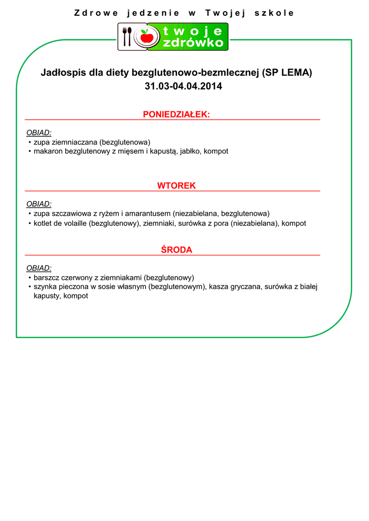 Zdrowe jedzenie w Twojej szkole Jadłospis dla diety bezglutenowo-bezmlecznej (SP LEMA) 31.03-04.04.2014 PONIEDZIAŁEK: OBIAD: • zupa ziemniaczana (bezglutenowa) • makaron bezglutenowy z mięsem i kapustą, jabłko, kompot WTOREK OBIAD: • zupa szczawiowa z ryżem i amarantusem (niezabielana, bezglutenowa) • kotlet de volaille (bezglutenowy), ziemniaki, surówka z pora (niezabielana), kompot ŚRODA OBIAD: • barszcz czerwony z ziemniakami (bezglutenowy) • szynka pieczona w sosie własnym (bezglutenowym), kasza gryczana, surówka z białej kapusty, kompot Zdrowe jedzenie w Twojej szkole Jadłospis dla diety bezglutenowo-bezmlecznej (SP LEMA) 31.03-04.04.2014 CZWARTEK OBIAD: • zupa fasolowa z ziemniakami (bezglutenowa) • makaron kukurydziany z jabłkami, mus truskawkowy z sezamem i amarantusem, kompot PIĄTEK OBIAD: • zupa koperkowa z ryżem (niezabielana, bezglutenowa) • ryba z warzywami po grecku (bezglutenowa), ziemniaki, kompot