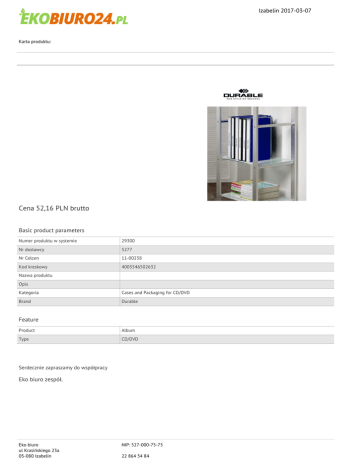 Izabelin 2017-03-07 Karta produktu: Cena 52,16 PLN brutto Basic product parameters Numer produktu w systemie 29300 Nr dostawcy 5277 Nr Celcen 11-00238 Kod kreskowy 4005546502632 Nazwa produktu Opis Kategoria Cases and Packaging for CD/DVD Brand Durable Feature Product Album Type CD/DVD Serdecznie zapraszamy do współpracy Eko biuro zespół. Eko biuro ul Krasińskiego 23a 05-080 Izabelin NIP: 527-000-75-75 22 864 54 84