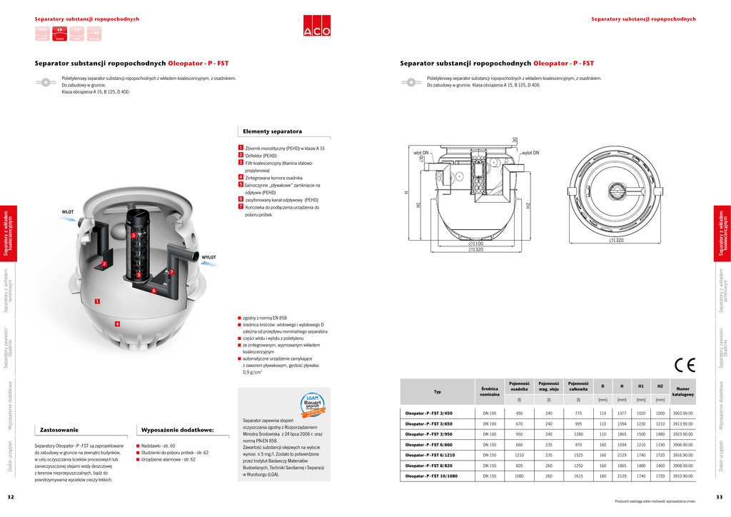 Separatory substancji ropopochodnych Separatory substancji ropopochodnych Separator substancji ropopochodnych Oleopator - P - FST Separator substancji ropopochodnych Oleopator - P - FST Polietylenowy separator substancji ropopochodnych z wkładem koalescencyjnym, z osadnikiem. Do zabudowy w gruncie. Klasa obciążenia A 15, B 125, D 400. Polietylenowy separator substancji ropopochodnych z wkładem koalescencyjnym, z osadnikiem. Do zabudowy w gruncie. Klasa obciążenia A 15, B 125, D 400. 30 Elementy separatora 1 Zbiornik monolityczny (PEHD) w klasie A 15 wlot DN wylot DN [D 2 Deflektor (PEHD) 3 Filtr koalescencyjny (tkanina stalowo- propylenowa) WLOT H1 H2 Separatory z wkładem koalescencyjnym Separatory z wkładem koalecsencyjnym odpływie (PEHD) 6 zasyfonowany kanał odpływowy (PEHD) 7 Końcówka do podłączenia urządzenia do H 4 Zintegrowana komora osadnika 5 Samoczynne „pływakowe” zamknięcie na poboru próbek 3 [1320 [1100 [1320 WYLOT Separatory z wkładem lamelowym Separatory z wkładem lamelowym 2 7 5 6 1 OO zgodny z normą EN 858 4 32 Separatory zawiesin/ Osadniki OO ze zintegrowanym, wyjmowanym wkładem koalescencyjnym OO automatyczne urządzenie zamykające z zaworem pływakowym, gęstość pływaka: 0,9 g/cm3 Typ Zastosowanie Separatory Oleopator - P - FST są zaprojektowane do zabudowy w gruncie na zewnątrz budynków, w celu oczyszczania ścieków procesowych lub zanieczyszczonej olejami wody deszczowej z terenów nieprzepuszczalnych, bądź do powstrzymywania wycieków cieczy lekkich. Wyposażenie dodatkowe: OO Nadstawki - str. 60 OO Studzienki do poboru próbek - str. 62 OO Urządzenie alarmowe - str. 62 Separator zapewnia stopień oczyszczania zgodny z Rozporządzeniem Ministra Środowiska z 24 lipca 2006 r. oraz normą PN-EN 858. Zawartość substancji olejowych na wylocie wynosi ≤ 5 mg/l. Zostało to potwierdzone przez Instytut Badawczy Materiałów Budowlanych, Techniki Sanitarnej i Separacji w Wurzburgu (LGA). Średnica nominalna Pojemność osadnika Pojemność mag. oleju Pojemność całkowita D H H1 H2 [l] [l] [l] [mm] [mm] [mm] [mm] Numer katalogowy Oleopator - P - FST 3/450 DN 100 450 240 775 110 1377 1020 1000 3903.90.00 Oleopator - P - FST 3/650 DN 100 670 240 995 110 1594 1230 1210 3913.90.00 Oleopator - P - FST 3/950 DN 100 950 240 1280 110 1865 1500 1480 3923.90.00 Oleopator - P - FST 6/660 DN 150 660 235 970 160 1594 1210 1190 3906.90.00 Oleopator - P - FST 6/1210 DN 150 1210 235 1525 160 2129 1740 1720 3916.90.00 Oleopator - P - FST 8/820 DN 150 820 260 1250 160 1865 1480 1460 3908.90.00 Oleopator - P - FST 10/1080 DN 150 1080 260 1615 160 2129 1740 1720 3910.90.00 Producent zastrzega sobie możliwość wprowadzenia zmian. Wyposażenie dodatkowe zależna od przepływu nominalnego separatora OO części wlotu i wylotu z polietylenu Dobór urządzeń Dodór urządzeń Wyposażenie dodatkowe Separatory zawiesin/ Osadniki OO średnica króćców: wlotowego i wylotowego D 33