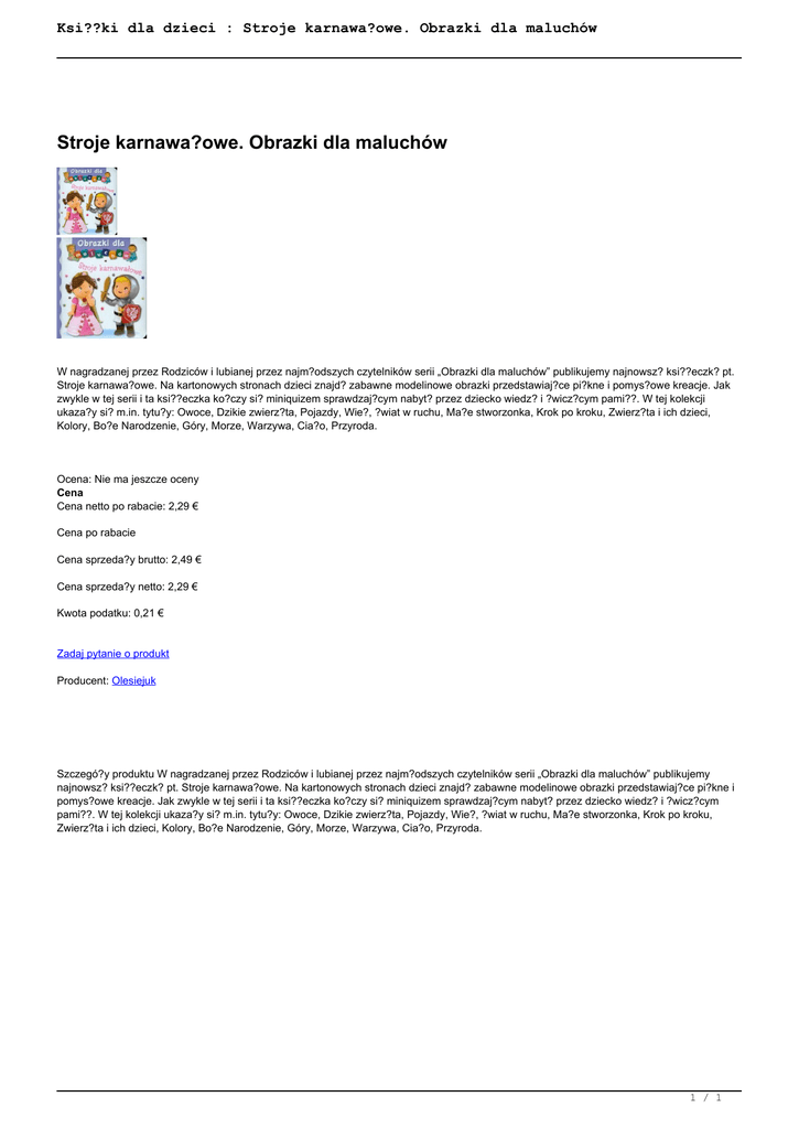Ksi??ki dla dzieci : Stroje karnawa?owe. Obrazki dla maluchów Stroje karnawa?owe. Obrazki dla maluchów W nagradzanej przez Rodziców i lubianej przez najm?odszych czytelników serii „Obrazki dla maluchów” publikujemy najnowsz? ksi??eczk? pt. Stroje karnawa?owe. Na kartonowych stronach dzieci znajd? zabawne modelinowe obrazki przedstawiaj?ce pi?kne i pomys?owe kreacje. Jak zwykle w tej serii i ta ksi??eczka ko?czy si? miniquizem sprawdzaj?cym nabyt? przez dziecko wiedz? i ?wicz?cym pami??. W tej kolekcji ukaza?y si? m.in. tytu?y: Owoce, Dzikie zwierz?ta, Pojazdy, Wie?, ?wiat w ruchu, Ma?e stworzonka, Krok po kroku, Zwierz?ta i ich dzieci, Kolory, Bo?e Narodzenie, Góry, Morze, Warzywa, Cia?o, Przyroda. Ocena: Nie ma jeszcze oceny Cena Cena netto po rabacie: 2,29 € Cena po rabacie Cena sprzeda?y brutto: 2,49 € Cena sprzeda?y netto: 2,29 € Kwota podatku: 0,21 € Zadaj pytanie o produkt Producent: Olesiejuk Szczegó?y produktu W nagradzanej przez Rodziców i lubianej przez najm?odszych czytelników serii „Obrazki dla maluchów” publikujemy najnowsz? ksi??eczk? pt. Stroje karnawa?owe. Na kartonowych stronach dzieci znajd? zabawne modelinowe obrazki przedstawiaj?ce pi?kne i pomys?owe kreacje. Jak zwykle w tej serii i ta ksi??eczka ko?czy si? miniquizem sprawdzaj?cym nabyt? przez dziecko wiedz? i ?wicz?cym pami??. W tej kolekcji ukaza?y si? m.in. tytu?y: Owoce, Dzikie zwierz?ta, Pojazdy, Wie?, ?wiat w ruchu, Ma?e stworzonka, Krok po kroku, Zwierz?ta i ich dzieci, Kolory, Bo?e Narodzenie, Góry, Morze, Warzywa, Cia?o, Przyroda. 1 / 1 Powered by TCPDF (www.tcpdf.org)