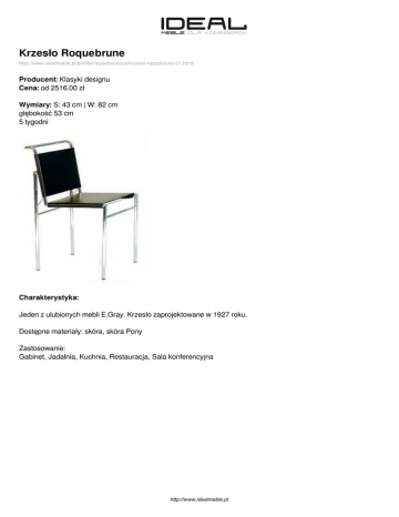 Krzesło Roquebrune http://www.idealmeble.pl/pl/offer/style/bauhaus/krzeslo-roquebrune-01.html/ Producent: Klasyki designu Cena: od 2516.00 zł Wymiary: S: 43 cm | W: 82 cm głębokość 53 cm 5 tygodni Charakterystyka: Jeden z ulubionych mebli E.Gray. Krzesło zaprojektowane w 1927 roku. Dostępne materiały: skóra, skóra Pony Zastosowanie: Gabinet, Jadalnia, Kuchnia, Restauracja, Sala konferencyjna http://www.idealmeble.pl http://www.idealmeble.pl Zdjęcia produktu: http://www.idealmeble.pl Powered by TCPDF (www.tcpdf.org)