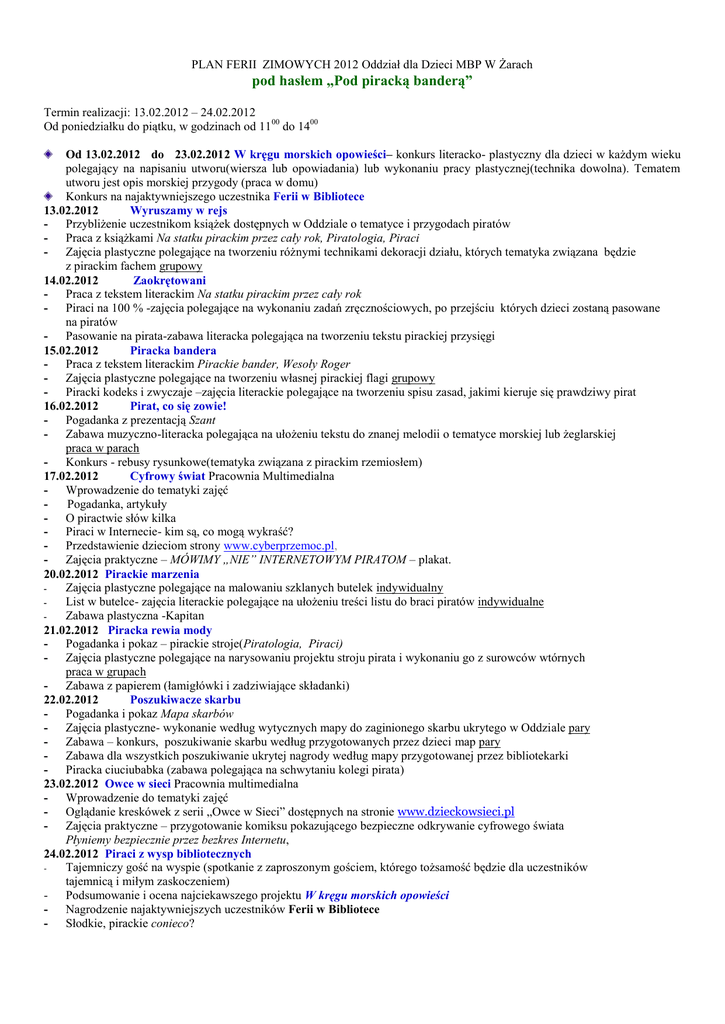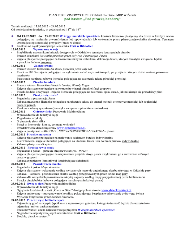 PLAN FERII ZIMOWYCH 2012 Oddział dla Dzieci MBP W Żarach pod hasłem „Pod piracką banderą” Termin realizacji: 13.02.2012 – 24.02.2012 Od poniedziałku do piątku, w godzinach od 11 00 do 1400 Od 13.02.2012 do 23.02.2012 W kręgu morskich opowieści– konkurs literacko- plastyczny dla dzieci w każdym wieku polegający na napisaniu utworu(wiersza lub opowiadania) lub wykonaniu pracy plastycznej(technika dowolna). Tematem utworu jest opis morskiej przygody (praca w domu) Konkurs na najaktywniejszego uczestnika Ferii w Bibliotece 13.02.2012 Wyruszamy w rejs - Przybliżenie uczestnikom książek dostępnych w Oddziale o tematyce i przygodach piratów - Praca z książkami Na statku pirackim przez cały rok, Piratologia, Piraci - Zajęcia plastyczne polegające na tworzeniu różnymi technikami dekoracji działu, których tematyka związana będzie z pirackim fachem grupowy 14.02.2012 Zaokrętowani - Praca z tekstem literackim Na statku pirackim przez cały rok - Piraci na 100 % -zajęcia polegające na wykonaniu zadań zręcznościowych, po przejściu których dzieci zostaną pasowane na piratów - Pasowanie na pirata-zabawa literacka polegająca na tworzeniu tekstu pirackiej przysięgi 15.02.2012 Piracka bandera - Praca z tekstem literackim Pirackie bander, Wesoły Roger - Zajęcia plastyczne polegające na tworzeniu własnej pirackiej flagi grupowy - Piracki kodeks i zwyczaje –zajęcia literackie polegające na tworzeniu spisu zasad, jakimi kieruje się prawdziwy pirat 16.02.2012 Pirat, co się zowie! - Pogadanka z prezentacją Szant - Zabawa muzyczno-literacka polegająca na ułożeniu tekstu do znanej melodii o tematyce morskiej lub żeglarskiej praca w parach - Konkurs - rebusy rysunkowe(tematyka związana z pirackim rzemiosłem) 17.02.2012 Cyfrowy świat Pracownia Multimedialna - Wprowadzenie do tematyki zajęć Pogadanka, artykuły - O piractwie słów kilka - Piraci w Internecie- kim są, co mogą wykraść? - Przedstawienie dzieciom strony www.cyberprzemoc.pl, - Zajęcia praktyczne – MÓWIMY „NIE” INTERNETOWYM PIRATOM – plakat. 20.02.2012 Pirackie marzenia Zajęcia plastyczne polegające na malowaniu szklanych butelek indywidualny List w butelce- zajęcia literackie polegające na ułożeniu treści listu do braci piratów indywidualne Zabawa plastyczna -Kapitan 21.02.2012 Piracka rewia mody - Pogadanka i pokaz – pirackie stroje(Piratologia, Piraci) - Zajęcia plastyczne polegające na narysowaniu projektu stroju pirata i wykonaniu go z surowców wtórnych praca w grupach - Zabawa z papierem (łamigłówki i zadziwiające składanki) 22.02.2012 Poszukiwacze skarbu - Pogadanka i pokaz Mapa skarbów - Zajęcia plastyczne- wykonanie według wytycznych mapy do zaginionego skarbu ukrytego w Oddziale pary - Zabawa – konkurs, poszukiwanie skarbu według przygotowanych przez dzieci map pary - Zabawa dla wszystkich poszukiwanie ukrytej nagrody według mapy przygotowanej przez bibliotekarki - Piracka ciuciubabka (zabawa polegająca na schwytaniu kolegi pirata) 23.02.2012 Owce w sieci Pracownia multimedialna - Wprowadzenie do tematyki zajęć - Oglądanie kreskówek z serii „Owce w Sieci” dostępnych na stronie www.dzieckowsieci.pl - Zajęcia praktyczne – przygotowanie komiksu pokazującego bezpieczne odkrywanie cyfrowego świata Płyniemy bezpiecznie przez bezkres Internetu, 24.02.2012 Piraci z wysp bibliotecznych Tajemniczy gość na wyspie (spotkanie z zaproszonym gościem, którego tożsamość będzie dla uczestników tajemnicą i miłym zaskoczeniem) - Podsumowanie i ocena najciekawszego projektu W kręgu morskich opowieści - Nagrodzenie najaktywniejszych uczestników Ferii w Bibliotece - Słodkie, pirackie conieco?