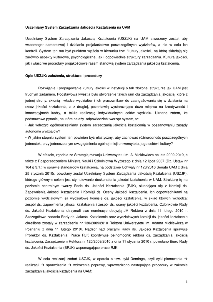 Uczelniany System Zarządzania Jakością Kształcenia na UAM Uczelniany System Zarządzania Jakością Kształcenia (USZJK) na UAM stworzony został, aby wspomagał samorozwój i działania projakościowe poszczególnych wydziałów, a nie w celu ich kontroli. System ten ma być punktem wyjścia w kierunku tzw. ‘kultury jakości’, na którą składają się zarówno aspekty kulturowe, psychologiczne, jak i odpowiednie struktury zarządzania. Kultura jakości, jak i właściwe procedury projakościowe razem stanowią system zarządzania jakością kształcenia. Opis USZJK: założenia, struktura i procedury Rozwijanie i propagowanie kultury jakości w instytucji o tak złożonej strukturze jak UAM jest trudnym zadaniem. Podstawową kwestią było stworzenie takich ram dla zarządzania jakością, które z jednej strony, skłonią władze wydziałów i ich pracowników do zaangażowania się w działania na rzecz jakości kształcenia, a z drugiej, pozostawią wystarczająco dużo miejsca na kreatywność i innowacyjność kadry, a także realizację indywidualnych celów wydziału. Uznano zatem, że podstawowe pytania, na które należy odpowiedzieć tworząc system, to: • Jak wdrożyć ogólnouczelniany system zarządzania jakością kształcenia w poszanowaniu zasady autonomii wydziałów? • W jakim stopniu system ten powinien być elastyczny, aby zachować różnorodność poszczególnych jednostek, przy jednoczesnym uwzględnieniu ogólnej misji uniwersytetu, jego celów i kultury? W efekcie, zgodnie ze Strategią rozwoju Uniwersytetu im. A. Mickiewicza na lata 2009-2019, a także z Rozporządzeniem Ministra Nauki i Szkolnictwa Wyższego z dnia 12 lipca 2007 (Dz. Ustaw nr 164 § 3.1.) w sprawie standardów kształcenia, na podstawie Uchwały nr 126/2010 Senatu UAM z dnia 25 stycznia 2010r. powołany został Uczelniany System Zarządzania Jakością Kształcenia (USZJK), którego głównym celem jest stymulowanie doskonalenia jakości kształcenia w UAM. Strukturę tę na poziomie centralnym tworzy Rada ds. Jakości Kształcenia (RJK), składająca się z Komisji ds. Zapewnienia Jakości Kształcenia i Komisji ds. Oceny Jakości Kształcenia. Ich odpowiednikami na poziomie wydziałowym są wydziałowe komisje ds. jakości kształcenia, w skład których wchodzą: zespół ds. zapewnienia jakości kształcenia i zespół ds. oceny jakości kształcenia. Członkowie Rady ds. Jakości Kształcenia otrzymali swe nominacje decyzją JM Rektora z dnia 11 lutego 2010 r. Szczegółowe zadania Rady ds. Jakości Kształcenia oraz wydziałowych komisji ds. jakości kształcenia określone zostały w zarządzeniu nr 130/2009/2010 Rektora Uniwersytetu im. Adama Mickiewicza w Poznaniu z dnia 11 lutego 2010r. Nadzór nad pracami Rady ds. Jakości Kształcenia sprawuje Prorektor ds. Kształcenia. Prace RJK koordynuje pełnomocnik rektora ds. zarządzania jakością kształcenia. Zarządzeniem Rektora nr 120/2009/2010 z dnia 11 stycznia 2010 r. powołano Biuro Rady ds. Jakości Kształcenia (BRJK) wspomagające prace RJK. W celu realizacji zadań USZJK, w oparciu o tzw. cykl Deminga, czyli cykl planowania realizacji sprawdzenia wdrożenia poprawy, wprowadzono następujące procedury w zakresie zarządzania jakością kształcenia na UAM: 1 Badanie stanu aktualnego /badanie wdrożenia zmian: 1) Ankiety studenckie, pracowników naukowodydaktycznych i administracji (w każdym roku) 2) Wydziałowe arkusze oceny dotyczące zaplanowanych działań i ew. nowych elementów (co dwa lata) Wdrożenie zmian/udoskonaleń: 1) Działania wydziałowe (w każdym roku) 2) Działania centralne (w każdym roku) Planowanie kolejnych zmian lub udoskonaleń i publikowanie planów: 1) Rekomendacje RJK i kalendarz działań (w każdym roku) 2) Rekomendacje WZOJK* i kalendarz działań (w każdym roku) *wydziałowe zespoły ds. oceny jakości kształcenia Podkreślić należy, iż analiza wydziałowych arkuszy oceny oraz wyników ankiet przez członków RJK oraz wydziałowe komisje ds. jakości kształcenia jest procesem o charakterze autorefleksyjnym i wspierającym, a nie oceniającym i porównawczym. Wyniki tych analiz wraz z raportami z poszczególnych badań publikowane są na ogólnodostępnych wydziałowych i uniwersyteckich stronach internetowych poświęconych jakości kształcenia. Opis pierwszego cyklu działań projakościowych Pierwszy cykl działań miał za zadanie określić mocne i słabe strony kształcenia na UAM. W tym celu: - przeprowadzono I edycję ogólnouniwersyteckiej ankiety studenckiej oceniającej jakość kształcenia na UAM za pośrednictwem Internetu w systemie USOS. Badaniu ankietowemu towarzyszyła szeroka akcja promocyjna (plakaty, ulotki) prowadzona przy współpracy z samorządem studenckim. - Rada ds. Jakości Kształcenia przy współpracy ze środowiskiem akademickim, w tym studentami oraz zgodnie z misją i celami UAM, w oparciu o „Standardy i wskazówki dotyczące zapewnienia jakości kształcenia w Europejskim Obszarze Szkolnictwa Wyższego (2005)” opracowała jednolity dla wszystkich wydziałów „Arkusz oceny stanu wyjściowego jakości kształcenia”. Wypełnione przez wydziałowe zespoły ds. oceny jakości kształcenia arkusze zostały opracowane w zbiorczej formie dla wszystkich wydziałów UAM. 2 Całemu procesowi towarzyszyły szkolenia dla kadry naukowo–dydaktycznej UAM w zakresie zasad funkcjonowania Uczelnianego Systemu Zarządzania Jakością Kształcenia, metodologii samooceny i techniki wypełniania arkuszy. Uczestników szkoleń zapoznano także z europejskimi procedurami zapewniania jakości kształcenia, ramami kwalifikacji dla obszarów nauk: humanistycznych, przyrodniczych i ścisłych i budową programów studiów w oparciu o efekty kształcenia określone w Krajowych Ramach Kwalifikacji. Łącznie zorganizowano 4 seminaria informacyjno-szkoleniowe oraz 2 konferencje z udziałem ekspertów zewnętrznych. Wyniki pierwszego cyklu działań projakościo