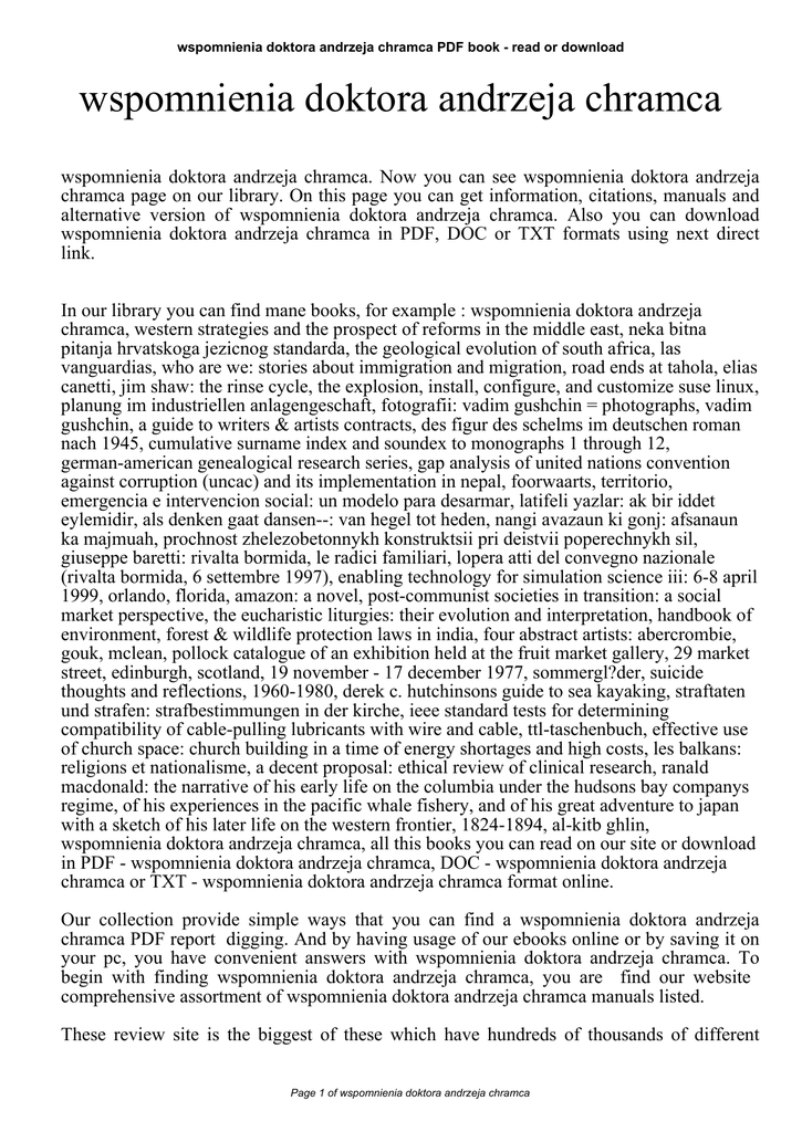 wspomnienia doktora andrzeja chramca PDF book - read or download wspomnienia doktora andrzeja chramca wspomnienia doktora andrzeja chramca. Now you can see wspomnienia doktora andrzeja chramca page on our library. On this page you can get information, citations, manuals and alternative version of wspomnienia doktora andrzeja chramca. Also you can download wspomnienia doktora andrzeja chramca in PDF, DOC or TXT formats using next direct link. In our library you can find mane books, for example : wspomnienia doktora andrzeja chramca, western strategies and the prospect of reforms in the middle east, neka bitna pitanja hrvatskoga jezicnog standarda, the geological evolution of south africa, las vanguardias, who are we: stories about immigration and migration, road ends at tahola, elias canetti, jim shaw: the rinse cycle, the explosion, install, configure, and customize suse linux, planung im industriellen anlagengeschaft, fotografii: vadim gushchin = photographs, vadim gushchin, a guide to writers & artists contracts, des figur des schelms im deutschen roman nach 1945, cumulative surname index and soundex to monographs 1 through 12, german-american genealogical research series, gap analysis of united nations convention against corruption (uncac) and its implementation in nepal, foorwaarts, territorio, emergencia e intervencion social: un modelo para desarmar, latifeli yazlar: ak bir iddet eylemidir, als denken gaat dansen--: van hegel tot heden, nangi avazaun ki gonj: afsanaun ka majmuah, prochnost zhelezobetonnykh konstruktsii pri deistvii poperechnykh sil, giuseppe baretti: rivalta bormida, le radici familiari, lopera atti del convegno nazionale (rivalta bormida, 6 settembre 1997), enabling technology for simulation science iii: 6-8 april 1999, orlando, florida, amazon: a novel, post-communist societies in transition: a social market perspective, the eucharistic liturgies: their evolution and interpretation, handbook of environment, forest & wildlife protection laws in india, four abstract artists: abercrombie, gouk, mclean, pollock catalogue of an exhibition held at the fruit market gallery, 29 market street, edinburgh, scotland, 19 november - 17 december 1977, sommergl?der, suicide thoughts and reflections, 1960-1980, derek c. hutchinsons guide to sea kayaking, straftaten und strafen: strafbestimmungen in der kirche, ieee standard tests for determining compatibility of cable-pulling lubricants with wire and cable, ttl-taschenbuch, effective use of church space: church building in a time of energy shortages and high costs, les balkans: religions et nationalisme, a decent proposal: ethical review of clinical research, ranald macdonald: the narrative of his early life on the columbia under the hudsons bay companys regime, of his experiences in the pacific whale fishery, and of his great adventure to japan with a sketch of his later life on the western frontier, 1824-1894, al-kitb ghlin, wspomnienia doktora andrzeja chramca, all this books you can read on our site or download in PDF - wspomnienia doktora andrzeja chramca, DOC - wspomnienia doktora andrzeja chramca or TXT - wspomnienia doktora andrzeja chramca format online. Our collection provide simple ways that you can find a wspomnienia doktora andrzeja chramca PDF report digging. And by having usage of our ebooks online or by saving it on your pc, you have convenient answers with wspomnienia doktora andrzeja chramca. To begin with finding wspomnienia doktora andrzeja chramca, you are find our website comprehensive assortment of wspomnienia doktora andrzeja chramca manuals listed. These review site is the biggest of these which have hundreds of thousands of different Page 1 of wspomnienia doktora andrzeja chramca wspomnienia doktora andrzeja chramca PDF book - read or download literally products represented. So as to there are particular sites catered to different product also categories or types, brands or niches related to wspomnienia doktora andrzeja chramca. So depending on just what you are searching, you shall be able to choose ebooks wspomnienia doktora andrzeja chramca to fit your own needs, wspomnienia doktora andrzeja chramca. Page 2 of wspomnienia doktora andrzeja chramca