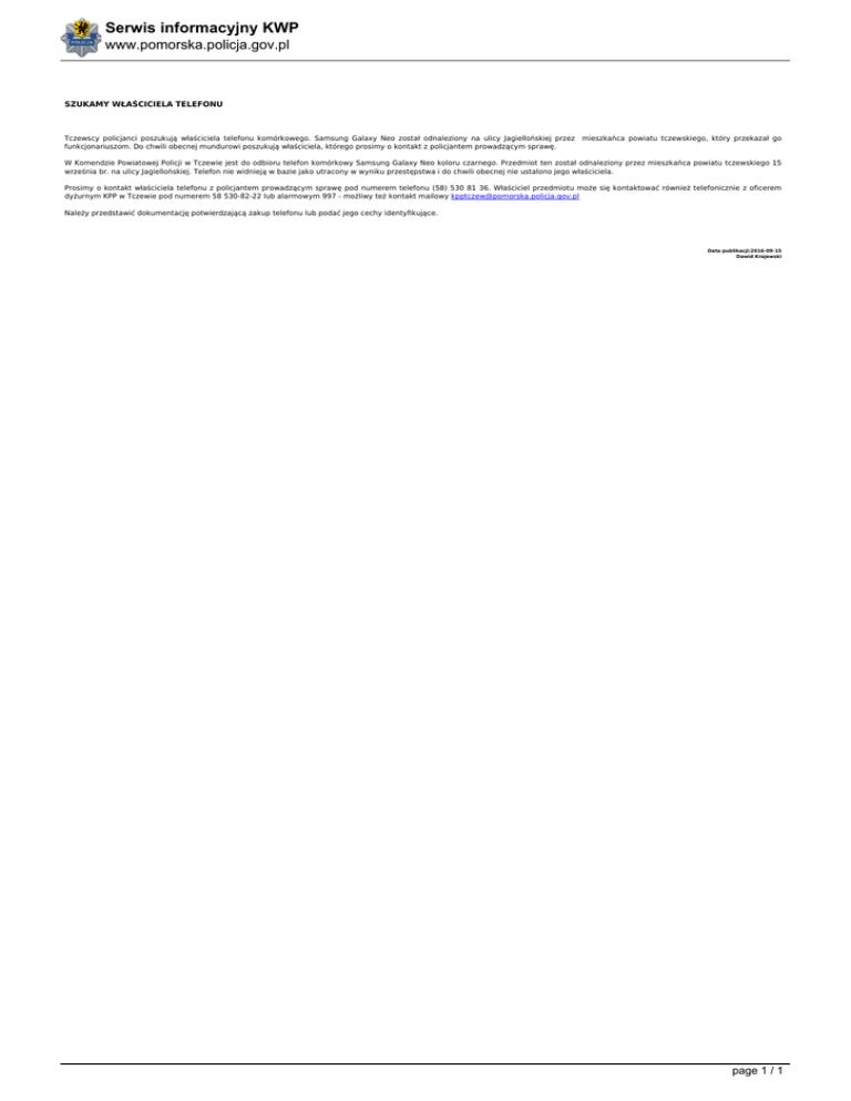 Serwis informacyjny KWP www.pomorska.policja.gov.pl SZUKAMY WŁAŚCICIELA TELEFONU Tczewscy policjanci poszukują właściciela telefonu komórkowego. Samsung Galaxy Neo został odnaleziony na ulicy Jagiellońskiej przez funkcjonariuszom. Do chwili obecnej mundurowi poszukują właściciela, którego prosimy o kontakt z policjantem prowadzącym sprawę. mieszkańca powiatu tczewskiego, który przekazał go W Komendzie Powiatowej Policji w Tczewie jest do odbioru telefon komórkowy Samsung Galaxy Neo koloru czarnego. Przedmiot ten został odnaleziony przez mieszkańca powiatu tczewskiego 15 września br. na ulicy Jagiellońskiej. Telefon nie widnieją w bazie jako utracony w wyniku przestępstwa i do chwili obecnej nie ustalono jego właściciela. Prosimy o kontakt właściciela telefonu z policjantem prowadzącym sprawę pod numerem telefonu (58) 530 81 36. Właściciel przedmiotu może się kontaktować również telefonicznie z oficerem dyżurnym KPP w Tczewie pod numerem 58 530-82-22 lub alarmowym 997 - możliwy też kontakt mailowy [email protected] Należy przedstawić dokumentację potwierdzającą zakup telefonu lub podać jego cechy identyfikujące. Data publikacji:2016-09-15 Dawid Krajewski page 1 / 1 Powered by TCPDF (www.tcpdf.org)