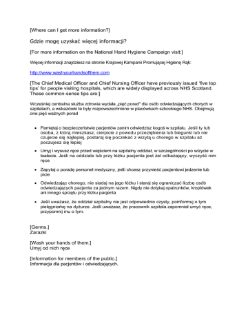 [Where can I get more information?] Gdzie mogę uzyskać więcej informacji? [For more information on the National Hand Hygiene Campaign visit:] Więcej informacji znajdziesz na stronie Krajowej Kampanii Promującej Higienę Rąk: http://www.washyourhandsofthem.com [The Chief Medical Officer and Chief Nursing Officer have previously issued ‘five top tips’ for people visiting hospitals, which are widely displayed across NHS Scotland. These common-sense tips are:] Wcześniej centralna służba zdrowia wydała „pięć porad" dla osób odwiedzających chorych w szpitalach, a wskazówki te były rozpowszechnione w placówkach szkockiego NHS. Obejmują one pięć ważnych porad • Pamiętaj o bezpieczeństwie pacjentów zanim odwiedzisz kogoś w szpitalu. Jeśli ty lub osoba, z którą mieszkasz, cierpicie z powodu przeziębienia lub biegunki lub nie czujecie się najlepiej, postaraj się poczekać z wizytą u chorego w szpitalu aż poczujesz się lepiej • Umyj i wysusz ręce przed wejściem na szpitalny oddział, w szczególności po wizycie w toalecie. Jeśli na oddziale lub przy łóżku pacjenta jest żel odkażający, wyczyść nim ręce • Zapytaj o poradę personel medyczny, jeśli chcesz przynieść pacjentowi jedzenie lub picie • Odwiedzając chorego, nie siadaj na jego łóżku i staraj się ograniczać liczbę osób odwiedzających pacjenta za jednym razem. Nigdy nie dotykaj opatrunków, kroplówek ani innego sprzętu przy łóżku pacjenta • Jeśli uważasz, że oddział szpitalny nie jest odpowiednio czysty, poinformuj o tym pielęgniarkę na dyżurze. Jeśli uważasz, że pracownik szpitala zapomniał umyć ręce, przypomnij mu o tym. [Germs.] Zarazki [Wash your hands of them.] Umyj od nich ręce [Information for members of the public.] Informacja dla pacjentów i odwiedzających. [Page 2] [Why is washing your hands important?] Czemu mycie rąk jest ważne? [The most common way germs are spread is by people’s hands.] Zarazki najczęściej przenoszą się na dłoniach. [Germs are often harmless but they can also cause illnesses such as colds and tummy bugs, as well as more serious illnesses such as E. coli and flu.] Często nie są szkodliwe, ale mogą także powodować choroby, takie jak przeziębienie i problemy żołądkowe, a także poważniejsze zachorowania, np. zarażenie bakterią E. coli i grypę. [Hand washing is the single most important thing you can do to help to reduce the spread of infections. Washing your hands properly with soap and warm water can help protect you, your family, children and others.] Mycie rąk to najważniejsza czynność, dzięki której zredukujesz rozprzestrzenianie się infekcji. Mycie rąk mydłem i ciepłą wodą może ochronić ciebie, twoją rodzinę, dzieci i inne osoby. [When should I wash my hands?] Kiedy należy myć ręce? [You should make regular and thorough hand washing part of your daily routine, especially:] Dokładne i regularne mycie rąk powinno być codzienną rutyną, w szczególności: • Przed jedzeniem lub dotykaniem produktów spożywczych • Po skorzystaniu z toalety • Po wydmuchaniu nosa, kasłaniu lub kichaniu • Po dotykaniu zwierząt lub ich odchodów • Po dotykaniu śmieci • Po zmianie pieluchy • Przed i po dotykaniu osoby chorej lub rannej • Przed i po wizycie na szpitalnym oddziale (pamiętaj, że dostępne są środki odkażające z alkoholem) [Don’t forget – encourage children to wash their hands at these times too.] Pamiętaj, aby w takich sytuacjach zachęcać dzieci do mycia rąk [How do I wash my hands properly?] W jaki sposób należy myć ręce? [It takes at least fifteen seconds to wash your hands properly – this is about how long it takes to sing ‘Happy Birthday to You’ twice through!] Prawidłowe mycie rąk zajmuje co najmniej piętnaście sekund – to mniej więcej tyle, ile potrzeba na dwukrotne zaśpiewanie komuś “Sto lat”! [Encourage children to wash their hands by showing them how to do it, and by setting them a good example.] Zachęcaj dzieci do mycia rąk pokazując im jak, to robić i dając dobry przykład. 1 Zwilż ręce wodą i nałóż wystarczająco dużo mydła na całe dłonie 2 Pocieraj dłonie jedną o drugą 3 Pocieraj prawą ręką o wierzch lewej i pomiędzy palcami, a potem na odwrót 4 Następnie pocieraj dłonie od wewnętrznej strony, jednocześnie czyszcząc przestrzenie pomiędzy palcami 5 Wierzch palców umyj dłońmi zakładając rękę na rękę 6 Kciuk pocieraj ruchem rotacyjnym drugą ręką 7 Spód dłoni umyj pocierając ją palcami drugiej ręki 8 Opłucz dłonie wodą 9 Osusz je dokładnie ręcznikiem 10 Kroki od 2 do 7 powinny zająć co najmniej 15 sekund …...i twoje dłonie są bezpieczne [What else can I do to help prevent the spread of infection?] W jaki sposób mogę jeszcze zapobiec rozprzestrzenianiu infekcji? • Zakrywaj nos jednorazową chusteczką, gdy go wycierasz lub wydmuchujesz, kichasz bądź kaszlesz • Wyrzucaj zużyte chusteczki do najbliższego kosza • Myj ręce mydłem i wodą po kasłaniu, kichaniu lub korzystaniu z chusteczek higienicznych.