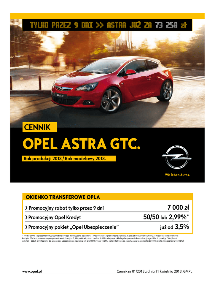 TYLKO PRZEZ 9 DNI >> ASTRA JUZ ZA 73 250 zl Cennik OPEL ASTRA GTC. Rok produkcji 2013 / Rok modelowy 2013. OKIENKO TRANSFEROWE OPLA Promocyjny rabat tylko przez 9 dni Promocyjny Opel Kredyt Promocyjny pakiet „Opel Ubezpieczenie” 7 000 zł 50/50 lub 2,99%* już od 3,5% * Kredyt 2,99% - reprezentatywny przykład dla nowego modelu; cena pojazdu 47 139 zł; wysokość wpłaty własnej wynosi 0 zł; czas obowiązywania umowy 24 miesiące; całkowita kwota kredytu: 50 416 zł; zmienna stopa oprocentowania kredytu: 2,99%; całkowity koszt kredytu: 8 633zł (obejmuje: składkę ubezpieczenia komunikacyjnego 1 886 zł, prowizję 756 zł; koszt odsetek 1 585 zł; przystąpienie do grupowego ubezpieczenia na życie 2 521 zł); RRSO wynosi 18,51%; całkowita kwota do zapłaty przez konsumenta: 59 049zł; kwota miesięcznej raty: 2 167 zł. www.opel.pl Cennik nr 01/2013 z dnia 11 kwietnia 2013, GMPL Cennik – Opel Astra GTC Rok produkcji 2013, rok modelowy 2013 Ceny promocyjne Enjoy Sport 1.4 Turbo 120 KM* M6 73 250 78 950 1.4 Turbo 140 KM* M6 75 250 80 950 1.4 Turbo 140 KM A6 80 250 85 950 1.6 Turbo 180 KM M6 80 250 85 950 1.6 Turbo 170 KM Start/Stop M6 82 450 88 150 1.6 Turbo 170 KM A6 86 450 91 950 1.7 CDTI 110 KM Start/Stop M6 81 850 87 550 1.7 CDTI 130 KM Start/Stop M6 84 250 89 950 2.0 CDTI 165 KM Start/Stop M6 89 550 95 250 2.0 CDTI 165 KM A6 93 350 99 050 Ceny promocyjne nie łączą się z innymi promocjami niż Opel Kredyt. Dokładny opis całej oferty promocyjnej znajduje się na stronie www.opel.pl w sekcji promocje lub dostępny jest u Autoryzowanego Dystrybutora marki Opel. Ceny promocyjne dotyczą klientów indywidualnych. Klientów flotowych w sprawie zapytań ofertowych prosimy o kontakt z wybranym Autoryzowanym Dystrybutorem marki Opel. Ceny katalogowe Enjoy Sport 1.4 Turbo 120 KM* M6 80 250 85 950 1.4 Turbo 140 KM* M6 82 250 87 950 1.4 Turbo 140 KM A6 87 250 92 950 1.6 Turbo 180 KM M6 87 250 92 950 1.6 Turbo 170 KM Start/Stop M6 89 450 95 150 1.6 Turbo 170 KM A6 93 450 98 950 1.7 CDTI 110 KM Start/Stop M6 88 850 94 550 1.7 CDTI 130 KM Start/Stop M6 91 250 96 950 2.0 CDTI 165 KM Start/Stop M6 96 550 102 250 2.0 CDTI 165 KM A6 100 350 106 050 * silnik dostępny z systemem Start/Stop – dopłata 1 200 zł Cennik Opla Astry GTC, rok produkcji 2013, rok modelowy 2013, nr 01/2013 z dnia 11 kwietnia 2013 1/4 Wyposażenie standardowe Tapicerka materiałowa Silvanus, czarna Felgi strukturalne 17", stalowe Klimatyzacja sterowana ręcznie Kierownica pokryta skórą z przyciskami sterowania Układ stabilizacji toru jazdy ESP z kontrolą trakcji TCS i ABS Obniżone zawieszenie sportowe Widoczna końcówka układu wydechowego (niedostępna z silnikami 1.4 Turbo 120 KM, 1.7 CDTI) Przednie i boczne poduszki powietrzne dla kierowcy i pasażera, kurtynowe poduszki dachowe System przypominania o zapięciu pasów na przednich siedzeniach Elektrycznie sterowane przednie szyby Elektrycznie sterowane i podgrzewane lusterka zewnętrzne w kolorze nadwozia Światła do jazdy dziennej (z tradycyjnymi żarówkami) Regulacja wysokości fotela kierowcy Tylne siedzenia dzielone w proporcji 40/60. Kieszenie z tyłu oparć foteli kierowcy i pasażera Kolumna kierownicy regulowana w pionie i poziomie Zaczepy Isofix w oparciach tylnych zewnętrznych siedzeń Radioodtwarzacz CD/MP3 400 z 6 głośnikami i złączem AUX-in Komputer pokładowy Tempomat z ogranicznikiem prędkości Tapicerka materiałowa Imola/Atlantis, czarna, z ergonomicznymi sportowymi fotelami przednimi Klimatyzacja sterowana elektronicznie dwustrefowa Czujniki parkowania, przód i tył Reflektory przeciwmgielne Felgi aluminiowe 18" Chromowane zewnętrzne listwy dookoła okien bocznych Układ wspomagania ruszania na pochyłościach (w Enjoy standard tylko z automatyczną skrzynią biegów) Konsola centralna z przesuwanym podłokietnikiem i zamykanym schowkiem Dodatkowe podświetlenie wnętrza w drzwiach przednich i konsoli środkowej Fotele przednie z regulacją długości siedziska i aktywnymi zagłówkami. Fotel kierowcy regulowany w 6 kierunkach z elektryczną regulacją podparcia lędźwiowego . Fotel pasażera regulowany w czterech kierunkach. (dostępny tylko z wybranymi tapicerkami) Aktywne zagłówki foteli przednich Kierownica pokryta perforowaną skórą z przyciskami sterowania Enjoy Sport S S S S S S S S S S S S S S S S S S S 350 1 500/P 1 700/P 850/P 3 000 ― P/S 500/P ― ― ― ― S S S S S S S S S S S S S S S S S S S S S S S S SR1 1 600 S AYS P ― S S 1 950 600/P 700/P 4 500 600/P P 1 000/P 500/P 1 950 600/P 700/P 4 500 600/P P 1 000/P 500/P 5 200/P 5 200/P 4 600 6 200 300/P 3 500 1 600 3 200 300/P 3 500 ― 0 ― 4 650 ― 5 650 1 000/P ― ― 1 000/P 700 P 1 000 1 000 1 000/S 8 000 50 250/P 1 000/S 6 500 50 250/P 2 600/P 2 600/P 4 100 4 100 500/P 2 700 900 500/P 2 700 900 TAHH PWT C67 N34 + UC3 FX3 XJ2 E3C AYC UH0/UH1 AEF/AXG DWE T3N AH3 A64+EA1/EA2 N37 AHN UZZ/UYN+UW6 U68 K33 TAJE CJ2 UD5 T3U MDE KB5 DBU C9B+C9D N35 Wyposażenie dodatkowe NADWOZIE Lakier metaliczny / perłowy / opalizujący Elektrycznie składane lusterka boczne DWF Tylny spojler dachowy T43 Panoramiczna szyba przednia. Zawiera: podsufitkę w kolorze czarnym AKY Przyciemniane szyby tylne AKO Światła do jazdy dziennej w technologii LED T3S Światła tylne w technologii LED UGE Spryskiwacze reflektorów CE4 Reflektory bi-ksenonowe AFL ze spryskiwaczami, automatycznym sterowaniem światłami drogowymi, światłami A8Z LED do jazdy dziennej. Zawierają: Pakiet Dobrej Widoczności. Felgi aluminiowe 19" RT8 Felgi aluminiowe 20" RQ9/RQA/RTH Zapasowe kolo dojazdowe, stalowe 17" RUA Zawieszenie FlexRide F45 WNĘTRZE Tapicerka Imola/Morrocana, czarna lub czerwona TAHL/TAHK Tapicerka skórzana perforowana z elementami ze sztucznej skóry, czarna, z ergonomicznymi i podgrzewanymi przednimi fotelami sportowymi AGR, podłokietnikiem tylnym z otworem na długie TADC przedmioty Tapicerka Dinamica/Nappa Soft, zamsz łączony ze skórą naturalną i skórą sztuczną, c