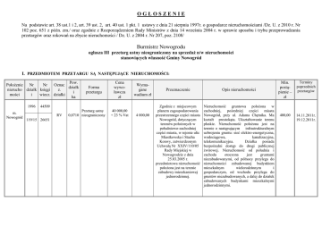 OGŁOSZENIE Na podstawie art. 38 ust.1 i 2, art. 39 ust. 2, art. 40 ust. 1 pkt. 1 ustawy z dnia 21 sierpnia 1997r. o gospodarce nieruchomościami /Dz. U. z 2010 r. Nr 102 poz. 651 z późn. zm./ oraz zgodnie z Rozporządzeniem Rady Ministrów z dnia 14 września 2004 r. w sprawie sposobu i trybu przeprowadzania przetargów oraz rokowań na zbycie nieruchomości / Dz. U. z 2004 r. Nr 207, poz. 2108/ Burmistrz Nowogrodu ogłasza III przetarg ustny nieograniczony na sprzedaż n/w nieruchomości stanowiących własność Gminy Nowogród I. PRZEDMIOTEM PRZETARGU SĄ NASTĘPUJĄCE NIERUCHOMOŚCI: Pow. Położenie Nr Nr Oznac działk nierucho działk księgi z. i mości i wiecz. działki ha 1996 m. Nowogród Forma przetargu Cena wywoławcza zł Wymagane wadium zł 44509 RV 119/15 26651 Przetarg ustny 0,0710 nieograniczony 40 000,00 + 23 % Vat 4 000,00 Przeznaczenie Opis nieruchomości Zgodnie z miejscowym planem zagospodarowania przestrzennego części miasta Nowogród, dotyczącym terenów położonych w południowo-zachodniej części miasta, w rejonie ulic Miastkowska i Stacha Konwy, zatwierdzonym Uchwałą Nr XXIV/110/05 Rady Miejskiej w Nowogrodzie z dnia 25.03.2005 r. przedmiotowa nieruchomość położona jest na terenie zabudowy mieszkaniowej jednorodzinnej. Nieruchomość gruntowa położona w zachodniej, pośredniej części miasta Nowogród, przy ul. Adama Chętnika. Ma kształt prostokąta. Ukształtowanie terenu płaskie. Nieruchomość położona jest na terenie o następującym infrastrukturalnym uzbrojeniu gruntu: sieć elektro-energetyczna, wodociągowa, kanalizacyjna, telekomunikacyjna. Działka posiada bezpośredni dostęp do drogi publicznej żwirowej. Nieruchomość od południa i zachodu otoczona jest gruntami niezabudowanymi, od północy przylega do nieruchomości zabudowanej budynkiem mieszkalnym wielorodzinnym i gospodarczym, od wschodu przylega do gruntów niezabudowanych, a dalej do działek zabudowanych budynkami mieszkalnymi jednorodzinnymi. Min. postąpienie – zł Terminy poprzednich przetargów 400,00 14.11.2011r. 19.12.2011r. m. Nowogród m. Nowogród 1995 1980 44509 44509 RV RV 0,1965 0,0931 Przetarg ustny nieograniczony Przetarg ustny nieograniczony 110 000,00 + 23 % Vat 50 000,00 + 23 % Vat 11 000,00 5 000,00 Zgodnie z miejscowym planem zagospodarowania przestrzennego części miasta Nowogród, dotyczącym terenów położonych w południowo-zachodniej części miasta, w rejonie ulic Miastkowska i Stacha Konwy, zatwierdzonym Uchwałą Nr XXIV/110/05 Rady Miejskiej w Nowogrodzie z dnia 25.03.2005 r. przedmiotowa nieruchomość położona jest na terenie zabudowy usługowej-usługi dla ludności z wykluczeniem działalności uciążliwej. Nieruchomość gruntowa położona w zachodniej, pośredniej części miasta Nowogród, przy ul. Adama Chętnika. Posiada kształt zbliżony do kwadratu. Ukształtowanie terenu płaskie. Nieruchomość położona jest na terenie o następującym infrastrukturalnym uzbrojeniu gruntu: sieć elektro-energetyczna, wodociągowa, kanalizacyjna, telekomunikacyjna. Działka posiada bezpośredni dostęp do drogi publicznej żwirowej. Nieruchomość od południa i zachodu otoczona jest gruntami niezabudowanymi, od północy przylega do nieruchomości zabudowanej budynkiem mieszkalnym wielorodzinnym i gospodarczym, od wschodu przylega do gruntów niezabudowanych, a dalej do działek zabudowanych budynkami mieszkalnymi jednorodzinnymi. 1 100,00 14.11.2011r. 19.12.2011r. Zgodnie z miejscowym planem zagospodarowania przestrzennego części miasta Nowogród, dotyczącym terenów położonych w południowo-zachodniej części miasta, w rejonie ulic Miastkowska i Stacha Konwy, zatwierdzonym Uchwałą Nr XXIV/110/05 Rady Miejskiej w Nowogrodzie z dnia 25.03.2005 r. przedmiotowa nieruchomość położona jest na terenie zabudowy mieszkaniowej jednorodzinnej. Nieruchomość gruntowa położona w zachodniej, pośredniej części miasta Nowogród, przy ul. Stacha Konwy. Ma kształt zbliżony do prostokąta ze ściętym bokiem. Ukształtowanie terenu płaskie. Nieruchomość położona jest na terenie o następującym infrastrukturalnym uzbrojeniu gruntu: sieć elektro-energetyczna, wodociągowa, kanalizacyjna, telekomunikacyjna. Działka posiada bezpośredni dostęp do drogi publicznej żwirowej. Nieruchomość od południa i zachodu otoczona jest gruntami niezabudowanymi, od północy przylega do ul. Stacha Konwy, a dalej do terenów zabudowy mieszkaniowej jednorodzinnej. Od wschodu przylega do nieruchomości zabudowanej budynkiem mieszkalnym wielorodzinnym i gospodarczym. 500,00 14.11.2011r. 19.12.2011r. m. Nowogród m. Nowogród 1987 1913 44509 44509 RV RVI RIVb Przetarg ustny 0,1104 nieograniczony Przetarg ustny 0,1493 nieograniczony 53 000,00 + 23 % Vat 75 000,00 + 23 % Vat 5 300,00 7 500,00 Zgodnie z miejscowym planem zagospodarowania przestrzennego części miasta Nowogród, dotyczącym terenów położonych w południowo-zachodniej części miasta, w rejonie ulic Miastkowska i Stacha Konwy, zatwierdzonym Uchwałą Nr XXIV/110/05 Rady Miejskiej w Nowogrodzie z dnia 25.03.2005 r. przedmiotowa nieruchomość położona jest na terenie zabudowy mieszkaniowej jednorodzinnej. Zgodnie z miejscowym planem zagospodarowania przestrzennego części miasta Nowogród, dotyczącym terenów położonych w południowo-zachodniej części miasta, w rejonie ulic Miastkowska i Stacha Konwy, zatwierdzonym Uchwałą Nr XXIV/110/05 Rady Miejskiej w Nowogrodzie z dnia 25.03.2005 r. przedmiotowa nieruchomość położona jest na terenie zabudowy mieszkaniowej jednorodzinnej. Nieruchomość gruntowa położona w zachodniej, peryferyjnej części miasta Nowogród, w pobliżu ul. Sosnowej. Ma kształt dwóch połączonych ze sobą figur: prostokąta i trójkąta. Ukształtowanie terenu płaskie. Nieruchomość położona jest na terenie o następującym infrastrukturalnym uzbrojeniu gruntu: sieć elektro-energetyczna, wodociągowa, kanalizacyjna, telekomunikacyjna.