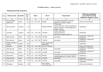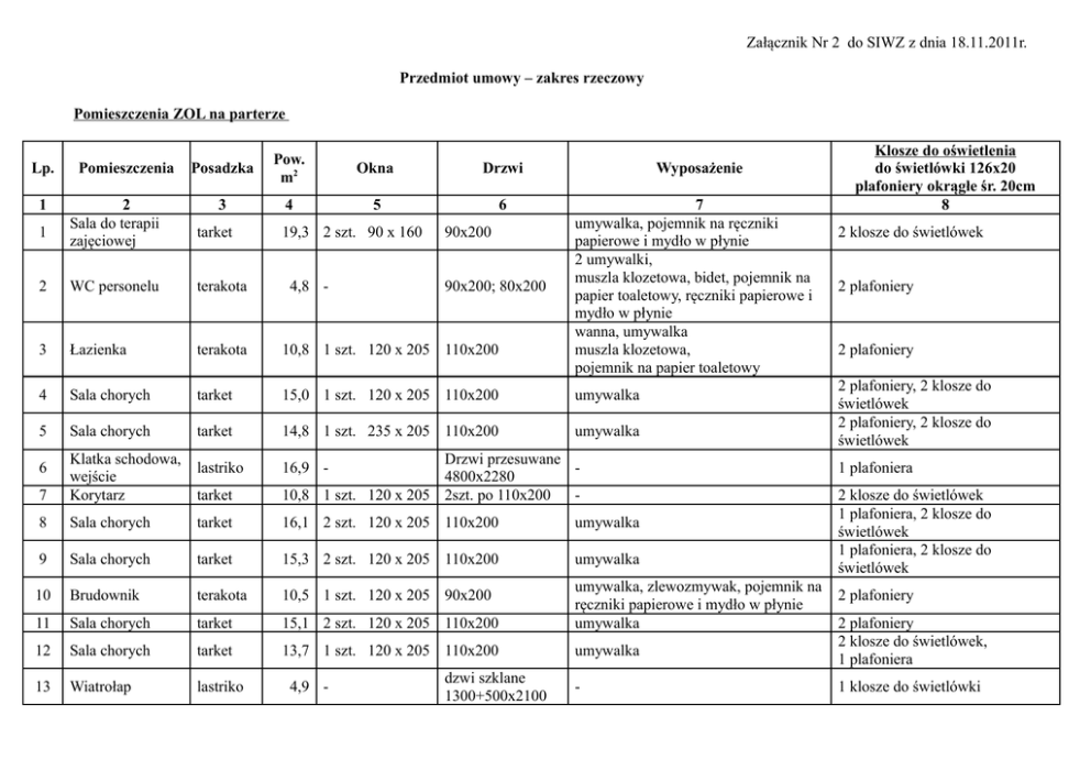 Załącznik Nr 2 do SIWZ z dnia 18.11.2011r. Przedmiot umowy – zakres rzeczowy Pomieszczenia ZOL na parterze Lp. 1 1 Pomieszczenia 2 Sala do terapii zajęciowej Posadzka Pow. m2 Okna Drzwi 3 4 5 6 tarket 19,3 2 szt. 90 x 160 WC personelu terakota 3 Łazienka terakota 10,8 1 szt. 120 x 205 110x200 4 Sala chorych tarket 15,0 1 szt. 120 x 205 110x200 umywalka 5 Sala chorych tarket 14,8 1 szt. 235 x 205 110x200 umywalka lastriko 16,9 - 7 8 90x200; 80x200 7 umywalka, pojemnik na ręczniki papierowe i mydło w płynie 2 umywalki, muszla klozetowa, bidet, pojemnik na papier toaletowy, ręczniki papierowe i mydło w płynie wanna, umywalka muszla klozetowa, pojemnik na papier toaletowy 2 Klatka schodowa, wejście Korytarz 4,8 - 90x200 Wyposażenie tarket Drzwi przesuwane 4800x2280 10,8 1 szt. 120 x 205 2szt. po 110x200 - Sala chorych tarket 16,1 2 szt. 120 x 205 110x200 umywalka 9 Sala chorych tarket 15,3 2 szt. 120 x 205 110x200 umywalka 10 Brudownik terakota 10,5 1 szt. 120 x 205 90x200 11 Sala chorych tarket 15,1 2 szt. 120 x 205 110x200 umywalka, zlewozmywak, pojemnik na ręczniki papierowe i mydło w płynie umywalka 12 Sala chorych tarket 13,7 1 szt. 120 x 205 110x200 umywalka 13 Wiatrołap lastriko 6 4,9 - dzwi szklane 1300+500x2100 - Klosze do oświetlenia do świetlówki 126x20 plafoniery okrągłe śr. 20cm 8 2 klosze do świetlówek 2 plafoniery 2 plafoniery 2 plafoniery, 2 klosze do świetlówek 2 plafoniery, 2 klosze do świetlówek 1 plafoniera 2 klosze do świetlówek 1 plafoniera, 2 klosze do świetlówek 1 plafoniera, 2 klosze do świetlówek 2 plafoniery 2 plafoniery 2 klosze do świetlówek, 1 plafoniera 1 klosze do świetlówki 1 2 3 4 5 6 7 14 Korytarz tarket 98,1 1 szt. 100 x 149 15 Sala chorych tarket 32,8 1szt. 110x200 umywalka 16 Sala chorych tarket 19,4 1 szt. 235 x 205 1szt. 110x200 umywalka 17 Sala chorych tarket 19,0 1 szt. 230 x 205 1szt. 110x200 umywalka 18 Sala chorych tarket 20,0 1 szt. 230 x 205 umywalka 120 x 205; 234 x 205 - 1szt. 110x200 umywalka, muszla klozetowa, kabina prysznicowa ściany wykafelkowane (bez drzwi), pojemnik na papier toaletowy 2 pisuary, muszla klozetowa, pojemnik na papier toaletowey umywalka, muszla klozetowa, 2 kabiny prysznicowe ściany wykafelkowane (bez drzwi), pojemnik na papier toaletowy 2 umywalki, 2 muszle klozetowe, 2 pojemniki na papier toaletowy umywalka, pojemnik na ręczniki papierowe i mydło w płynie umywalka, pojemnik na ręczniki papierowe i mydło w płynie, zlewozmywak 19 Łazienka terakota 2szt. 100x200; 12,9 2 szt. 120 x 205 90x200 20 WC męski terakota 10,9 - 21 Łazienka terakota 9,1 1 szt. 120 x 205 1szt. 90x200 22 WC damski terakota 9,9 - 23 Dyżurka pielęgniarska tarket 11,8 - 24 Gabinet zabiegowy terakota 15,3 1 szt. 345 x 205 1szt. 110x200 tarket 11,0 1 szt. 116 x 205 1szt. 90x200 - tarket 4,4 116 x 205; 31,4 234 x 205 1szt. 80x200 - 1szt. 110x200 - 2szt. 90x200; 80x200 1szt. 100x200 2szt. 80x200 - 26 Pokój pielęgniarek Magazyn pościeli 27 Świetlica tarket 28 Sala chorych tarket 21,2 1 szt. 234 x 205 1szt. 110x200 1 umywalka 29 Sala chorych tarket 23,6 2 szt. 116 x 205 1szt. 110x200 1 umywalka 25 8 9 plafonier, 8 kloszy do świetlówek 1 plafoniera, 4 klosze do świetlówek 1 plafoniera, 2 klosze do świetlówek 1 plafoniera, 2 klosze do świetlówek 1 plafoniera, 2 klosze do świetlówek 3 plafoniery 2 plafoniery 3 plafoniery 2 plafoniery 1 klosz do świetlówki 1 plafoniera, 2 klosze do świetlówek 1 plafoniera, 2 klosze do świetlówek 1 klosz do świetlówki 1 plafoniera, 4 klosze do świetlówek 1 plafoniera, 2 klosze do świetlówek 1 plafoniera, 2 klosze do świetlówek 1 2 3 4 30 Pro morte terakota 31 Przedsionek przy windzie terakota 5,9 - 32 Winda wnętrze tarket 3,0 - 5 6 21,1 1 szt. 170 x 170 1szt. 90x200 drzwi 200 x 210 szklane drzwi do windy 133x216; ściany stalowe szer. 120 dł. 250 wys. 216; 7 8 1 umywalka, pojemnik na ręczniki papierowe 2 klosze do świetlówek - 1 plafoniera - Pomieszczenia ZOL na I piętrze Lp. Pomieszczenia Posadzka Pow. m2 Okna (cm) Drzwi Wyposażenie 1 2 3 4 5 6 7 umywalka, pojemnik na ręczniki papierowe i mydło w płynie umywalka, muszla klozetowa, pojemnik na ręczniki papierowe i mydło w płynie umywalka, pojemnik na ręczniki papierowe i mydło w płynie zlewozmywak, pojemnik na ręczniki papierowe i mydło w płynie 31,1 2 szt. 120 x 205 1szt. 110x200 Klosze do oświetlenia do świetlówek 126x20 plafoniery średnica 20cm 8 1 Gab. rehabilitacji tarket 2 WC personelu terakota 3 Sala chorych tarket 15,5 1 szt. 120 x 205 1szt. 100x200 4 Pokój socjalny terakota 15,9 1 szt. 120 x 205 1szt. 110x200 5 Klatka schodowa lastriko 18,4 - drzwi szklane 180 x 215 - 3 klosze do świetlówek 6 Łazienka terakota 11,5 1 szt. 120 x 205 2szt. po 100x200 2 umywalki, kabina prysznicowa ściany wykafelkowane 2 plafoniery 7 Sala chorych tarket 16,6 2 szt. 120 x 205 1szt. 110x200 umywalka 8 Sala chorych tarket 16,4 2 szt. 120 x 205 1szt. 110x200 umywalka 9 Łazienka terakota 9,4 1 szt. 120 x 205 1szt. 110x200 10 WC damski terakota 3,0 - 1szt. 90x200 11 WC męski terakota 6,6 1 szt. 120 x 205 2szt. 90x200; 1szt. 80x200 12 Brudownik terakota 8,5 1 szt. 120 x 205 2szt. po 90x200 wanna, muszla klozetowa, pojemnik na papier toaletowy umywalka, muszla klozetowa, pojemnik na papier toaletowy umywalka, muszla klozetowa, pisuar, pojemnik na papier toaletowy umywalka, pojemnik na ręczniki papierowe i mydło w płynie 13 Sala chorych tarket 14,6 1 szt. 120 x 205 1szt. 110x200 umywalka 14 Sala chorych tarket 32,9 120 x 205; 238 x 205 1szt. 110x200 umywalka 1szt. 90x200 12 4 klosze do świetlówek 3 plafoniery 2 klosze do świetlówek 2 klosze do świetlówek 2 klosze do świetlówek 1 plafoniera 2 klosze do świetlówek 1 plafoniera 2 klosze do świetlówek 2 plafoniery 3 plafoniery 2 plafoniery 2 klosze do świetlówek 1 plafoniery 4 klosze do świetlówek 1 plafoniera 1 2 3 4 5 6 7 8 2 klosze do świetlówek 1 plafoniera 2 klosze do świetlówek 1 plafoniera 2 klosze do świetlówek 1