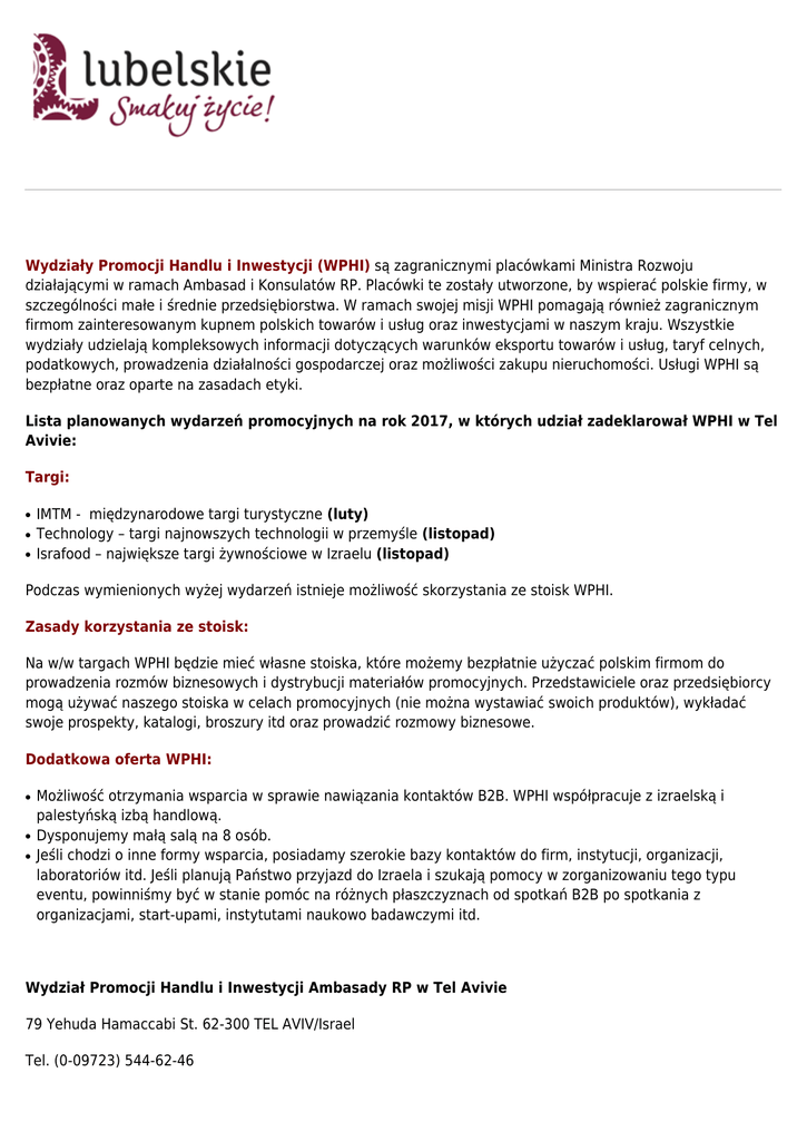 Wydziały Promocji Handlu i Inwestycji (WPHI) są zagranicznymi placówkami Ministra Rozwoju działającymi w ramach Ambasad i Konsulatów RP. Placówki te zostały utworzone, by wspierać polskie firmy, w szczególności małe i średnie przedsiębiorstwa. W ramach swojej misji WPHI pomagają również zagranicznym firmom zainteresowanym kupnem polskich towarów i usług oraz inwestycjami w naszym kraju. Wszystkie wydziały udzielają kompleksowych informacji dotyczących warunków eksportu towarów i usług, taryf celnych, podatkowych, prowadzenia działalności gospodarczej oraz możliwości zakupu nieruchomości. Usługi WPHI są bezpłatne oraz oparte na zasadach etyki. Lista planowanych wydarzeń promocyjnych na rok 2017, w których udział zadeklarował WPHI w Tel Avivie: Targi: ● ● ● IMTM - międzynarodowe targi turystyczne (luty) Technology – targi najnowszych technologii w przemyśle (listopad) Israfood – największe targi żywnościowe w Izraelu (listopad) Podczas wymienionych wyżej wydarzeń istnieje możliwość skorzystania ze stoisk WPHI. Zasady korzystania ze stoisk: Na w/w targach WPHI będzie mieć własne stoiska, które możemy bezpłatnie użyczać polskim firmom do prowadzenia rozmów biznesowych i dystrybucji materiałów promocyjnych. Przedstawiciele oraz przedsiębiorcy mogą używać naszego stoiska w celach promocyjnych (nie można wystawiać swoich produktów), wykładać swoje prospekty, katalogi, broszury itd oraz prowadzić rozmowy biznesowe. Dodatkowa oferta WPHI: ● ● ● Możliwość otrzymania wsparcia w sprawie nawiązania kontaktów B2B. WPHI współpracuje z izraelską i palestyńską izbą handlową. Dysponujemy małą salą na 8 osób. Jeśli chodzi o inne formy wsparcia, posiadamy szerokie bazy kontaktów do firm, instytucji, organizacji, laboratoriów itd. Jeśli planują Państwo przyjazd do Izraela i szukają pomocy w zorganizowaniu tego typu eventu, powinniśmy być w stanie pomóc na różnych płaszczyznach od spotkań B2B po spotkania z organizacjami, start-upami, instytutami naukowo badawczymi itd. Wydział Promocji Handlu i Inwestycji Ambasady RP w Tel Avivie 79 Yehuda Hamaccabi St. 62-300 TEL AVIV/Israel Tel. (0-09723) 544-62-46 Lokalizacja: Rodzaj: WPHI Strona internetowa: http://www.telaviv.trade.gov.pl [1] Drukuj [2] Pobierz PDF [3] Pobierz DOC [4] Źródło: http://www.invest.lubelskie.pl/pl/wydzial-promocji-handlu-i-inwestycji-ambasady-rp-w-tel-avivie Odnośniki [1] http://www.telaviv.trade.gov.pl [2] http://www.invest.lubelskie.pl/pl/print/902 [3] http://www.invest.lubelskie.pl/pl/printpdf/902 [4] http://www.invest.lubelskie.pl/pl/print/902?type=doc
