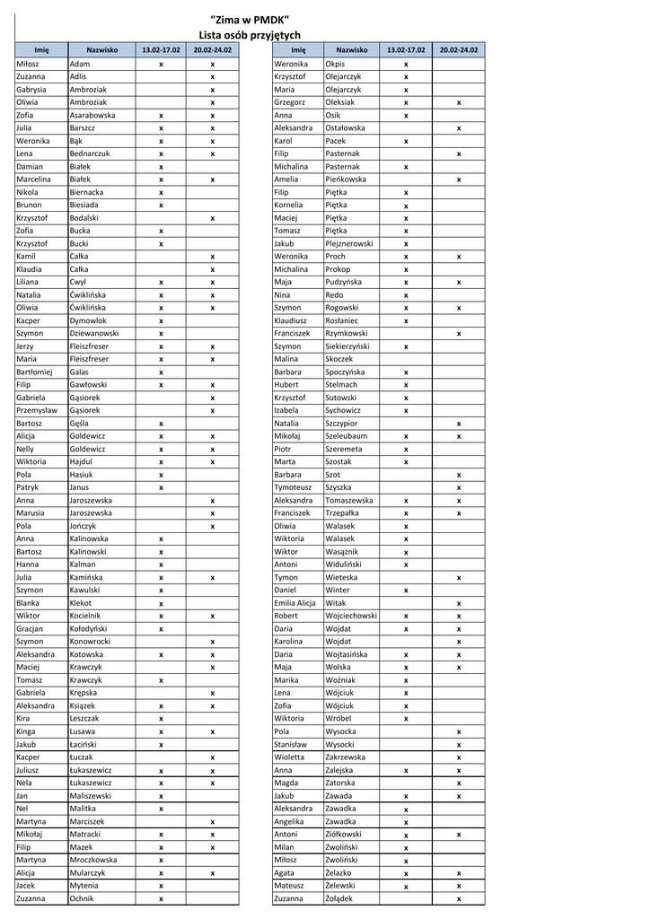 "Zima w PMDK" Lista osób przyjętych Imię Nazwisko 13.02-17.02 20.02-24.02 x x Weronika Okpis x Adlis x Krzysztof Olejarczyk x Ambroziak x Maria Olejarczyk x Oliwia Ambroziak x Grzegorz Oleksiak x Zofia Asarabowska x x Anna Osik x Julia Barszcz x x Aleksandra Ostałowska Weronika Bąk x x Karol Pacek Lena Bednarczuk x x Filip Pasternak Damian Białek x Michalina Pasternak Marcelina Białek x Amelia Pieńkowska Nikola Biernacka x Filip Piętka x Brunon Biesiada x Kornelia Piętka Krzysztof Bodalski Maciej Piętka x x Zofia Bucka x Tomasz Piętka x Krzysztof Bucki x Jakub Plejznerowski x Kamil Całka x Weronika Proch x Klaudia Całka x Michalina Prokop x Liliana Cwyl x x Maja Pudzyńska x Natalia Ćwiklińska x x Nina Redo x Oliwia Ćwiklińska x x Szymon Rogowski x Kacper Dymowlok x Klaudiusz Rosłaniec x Szymon Dziewanowski x Franciszek Rzymkowski Jerzy Fleiszfreser x x Szymon Siekierzyński Maria Fleiszfreser x x Malina Skoczek Bartłomiej Galas x Barbara Spoczyńska x Filip Gawłowski x x Hubert Stelmach x Gabriela Gąsiorek x Krzysztof Sutowski x Przemysław Gąsiorek x Izabela Sychowicz x Bartosz Gęśla x Natalia Szczypior Alicja Goldewicz x x Mikołaj Szeleubaum x Nelly Goldewicz x x Piotr Szeremeta x Wiktoria Hajdul x x Marta Szostak x Pola Hasiuk x Barbara Szot Patryk Janus x Tymoteusz Szyszka Anna Jaroszewska x Aleksandra Tomaszewska x x Marusia Jaroszewska x Franciszek Trzepałka x x Pola Jończyk x Oliwia Walasek x Anna Kalinowska x Wiktoria Walasek x Bartosz Kalinowski x Wiktor Wasążnik Hanna Kalman x Antoni Widuliński x x Julia Kamińska x Tymon Wieteska Szymon Kawulski x Daniel Winter Blanka Klekot Witak Kocielnik x x Emilia Alicja Wiktor Robert Wojciechowski x x Gracjan Kołodyński x Daria Wojdat x x Szymon Konowrocki x Karolina Wojdat Aleksandra Kotowska x Daria Wojtasińska x x Maciej Krawczyk x Maja Wolska x x Tomasz Krawczyk Marika Woźniak x Gabriela Krępska x Lena Wójciuk x Aleksandra Ksiązek x x Zofia Wójciuk x Kira Leszczak x Wiktoria Wróbel x Kinga Lusawa x Pola Wysocka x Jakub Łaciński x Stanisław Wysocki x Kacper Łuczak x Wioletta Zakrzewska Juliusz Łukaszewicz Zalejska Łukaszewicz x x Anna Nela x x Magda Zatorska Jan Maliszewski x Jakub Zawada x Nel Malitka x Aleksandra Zawadka x Martyna Marciszek x Angelika Zawadka x Mikołaj Matracki x x Antoni Ziółkowski x Filip Mazek x x Milan Zwoliński x Martyna Mroczkowska x Miłosz Zwoliński x Alicja Mularczyk x Agata Żelazko x x Jacek Mytenia x Mateusz Żelewski x x Zuzanna Ochnik x Zuzanna Żołądek Miłosz Adam Zuzanna Gabrysia x x x x x x x x Imię Nazwisko 13.02-17.02 20.02-24.02 x x x x x x x x x x x x x x x x x x x x x x x x x x