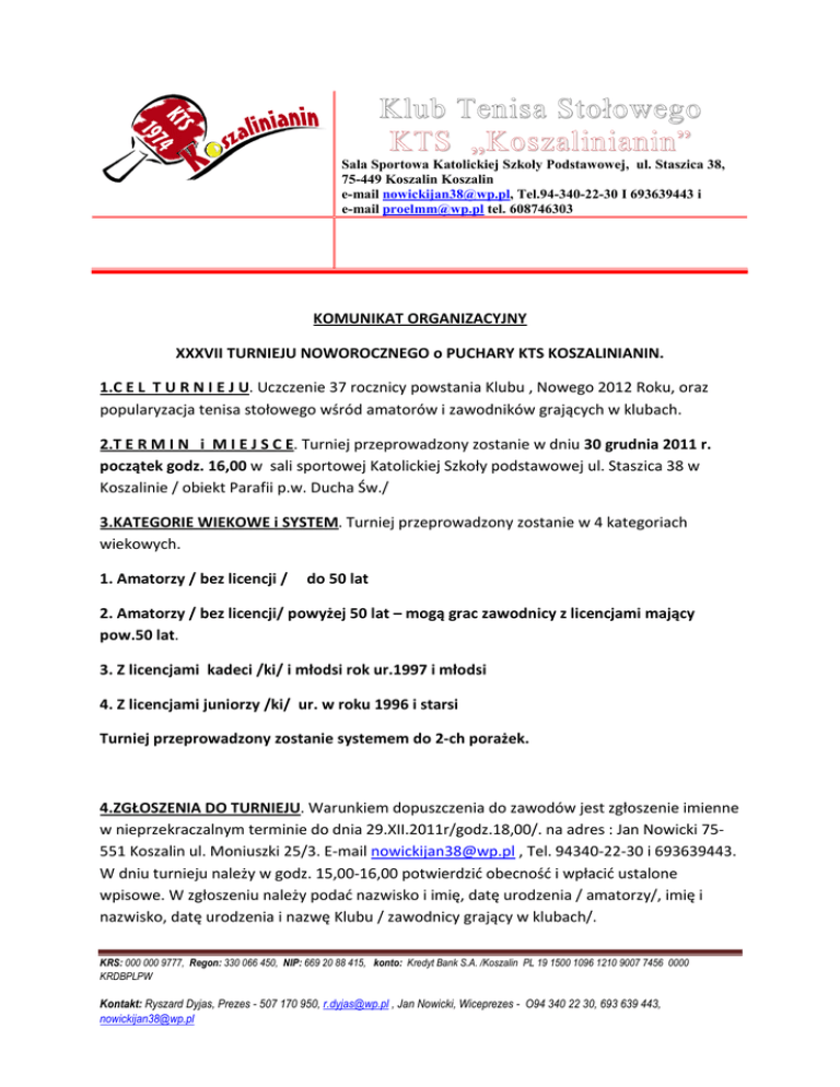 Klub Tenisa Stołowego KTS „Koszalinianin” Sala Sportowa Katolickiej Szkoły Podstawowej, ul. Staszica 38, 75-449 Koszalin Koszalin e-mail [email protected], Tel.94-340-22-30 I 693639443 i e-mail [email protected] tel. 608746303 KOMUNIKAT ORGANIZACYJNY XXXVII TURNIEJU NOWOROCZNEGO o PUCHARY KTS KOSZALINIANIN. 1.C E L T U R N I E J U. Uczczenie 37 rocznicy powstania Klubu , Nowego 2012 Roku, oraz popularyzacja tenisa stołowego wśród amatorów i zawodników grających w klubach. 2.T E R M I N i M I E J S C E. Turniej przeprowadzony zostanie w dniu 30 grudnia 2011 r. początek godz. 16,00 w sali sportowej Katolickiej Szkoły podstawowej ul. Staszica 38 w Koszalinie / obiekt Parafii p.w. Ducha Św./ 3.KATEGORIE WIEKOWE i SYSTEM. Turniej przeprowadzony zostanie w 4 kategoriach wiekowych. 1. Amatorzy / bez licencji / do 50 lat 2. Amatorzy / bez licencji/ powyżej 50 lat – mogą grac zawodnicy z licencjami mający pow.50 lat. 3. Z licencjami kadeci /ki/ i młodsi rok ur.1997 i młodsi 4. Z licencjami juniorzy /ki/ ur. w roku 1996 i starsi Turniej przeprowadzony zostanie systemem do 2-ch porażek. 4.ZGŁOSZENIA DO TURNIEJU. Warunkiem dopuszczenia do zawodów jest zgłoszenie imienne w nieprzekraczalnym terminie do dnia 29.XII.2011r/godz.18,00/. na adres : Jan Nowicki 75551 Koszalin ul. Moniuszki 25/3. E-mail [email protected] , Tel. 94340-22-30 i 693639443. W dniu turnieju należy w godz. 15,00-16,00 potwierdzić obecność i wpłacić ustalone wpisowe. W zgłoszeniu należy podać nazwisko i imię, datę urodzenia / amatorzy/, imię i nazwisko, datę urodzenia i nazwę Klubu / zawodnicy grający w klubach/. KRS: 000 000 9777, Regon: 330 066 450, NIP: 669 20 88 415, konto: Kredyt Bank S.A. /Koszalin PL 19 1500 1096 1210 9007 7456 0000 KRDBPLPW Kontakt: Ryszard Dyjas, Prezes - 507 170 950, [email protected] , Jan Nowicki, Wiceprezes - O94 340 22 30, 693 639 443, [email protected] 5.SPRAWY ORGANIZACYJNE i FINANSOWE. Turniej przeprowadzony zostanie na 6 stołach DONIC i TIBHAR, piłeczkami TIBHAR. Wszystkich uczestników obowiązuje posiadanie ubioru sportowego i własnej rakietki. Organizator nie bierze odpowiedzialności za ewentualne zaginięcie rzeczy wartościowych na terenie obiektu, pozostawionych bez nadzoru. Obsadę sędziowską / Sędzia Gł. I Zastępca/ zabezpiecza organizator, natomiast sędziów liczących wyznacza sędzia gł. spośród grających zawodników /czek/. Koszty organizacyjne pokrywa organizator, pozostałe koszty / dojazd, wpisowe/ zawodnicy, lub jednostki delegujące. - Wpisowe do turnieju wynosi 15,00 zł.dla dorosłych a młodzieży szkolnej 10,00 zł. płatne przed turniejem przy potwierdzaniu obecności. -Rozstawienie zawodników dokonane zostanie w dniu 30.12. o godz. 16,00/ ostateczny termin i godz. zgłoszenia/ na podstawie list rankingowych ZP ZTS po 2-ch WTK kadetów i seniorów / zawodnicy grający w klubach/, oraz wg. rozeznania na podstawie wyników z roku 2010 / amatorzy/. 6.NAGRODY i WYRÓŻNIENIA. - Zwycięzcy poszczególnych grup wiekowych otrzymują pamiątkowe puchary Prezesa KTS KOSZALINIANIN, lub nagrody rzeczowe. - Zdobywcy 3-ch pierwszych miejsc w poszczególnych grupach otrzymują tradycyjne szampany / tylko dla dorosłych/, młodzież otrzyma słodycze oraz pamiątkowe dyplomy. - Dla najmłodszego i najstarszego uczestnika turnieju przewiduje się upominki rzeczowe i dyplomy. Za Organizatora: JAN NOWICKI- Vice Prezes. Otrzymują : - miejscowe media: Głos Koszaliński i Miasto, TV Max, Radio Koszalin - zaproszeni zawodnicy klubów ZP ZTS KRS: 000 000 9777, Regon: 330 066 450, NIP: 669 20 88 415, konto: Kredyt Bank S.A. /Koszalin PL 19 1500 1096 1210 9007 7456 0000 KRDBPLPW Kontakt: Ryszard Dyjas, Prezes - 507 170 950, [email protected] , Jan Nowicki, Wiceprezes - O94 340 22 30, 693 639 443, [email protected]