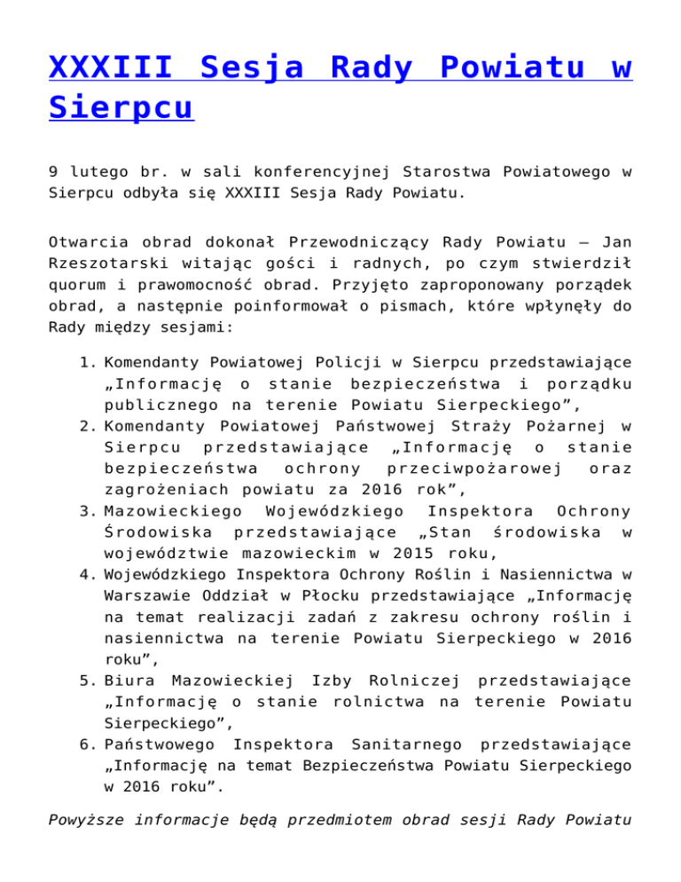 XXXIII Sesja Rady Powiatu w Sierpcu 9 lutego br. w sali konferencyjnej Starostwa Powiatowego w Sierpcu odbyła się XXXIII Sesja Rady Powiatu. Otwarcia obrad dokonał Przewodniczący Rady Powiatu – Jan Rzeszotarski witając gości i radnych, po czym stwierdził quorum i prawomocność obrad. Przyjęto zaproponowany porządek obrad, a następnie poinformował o pismach, które wpłynęły do Rady między sesjami: 1. Komendanty Powiatowej Policji w Sierpcu przedstawiające „Informację o stanie bezpieczeństwa i porządku publicznego na terenie Powiatu Sierpeckiego”, 2. Komendanty Powiatowej Państwowej Straży Pożarnej w Sierpcu przedstawiające bezpieczeństwa ochrony „Informację o stanie przeciwpożarowej oraz zagrożeniach powiatu za 2016 rok”, 3. Mazowieckiego Wojewódzkiego Inspektora Ochrony Środowiska przedstawiające „Stan środowiska województwie mazowieckim w 2015 roku, w 4. Wojewódzkiego Inspektora Ochrony Roślin i Nasiennictwa w Warszawie Oddział w Płocku przedstawiające „Informację na temat realizacji zadań z zakresu ochrony roślin i nasiennictwa na terenie Powiatu Sierpeckiego w 2016 roku”, 5. Biura Mazowieckiej Izby Rolniczej przedstawiające „Informację o stanie rolnictwa na terenie Powiatu Sierpeckiego”, 6. Państwowego Inspektora Sanitarnego przedstawiające „Informację na temat Bezpieczeństwa Powiatu Sierpeckiego w 2016 roku”. Powyższe informacje będą przedmiotem obrad sesji Rady Powiatu w Sierpcu w dniu 30 marca 2017 roku. Ponadto do Biura Rady i Zarządu Powiatu wpłynęło: 1. Stanowisko Rady Powiatu w Otwocku w sprawie poselskiego projektu ustawy o ustroju miasta stołecznego Warszawy. 2. Interpelacja Pana Marcina Błaszczyka dotycząca remontu drogi powiatowej Sikórz – Mochowo pomiędzy miejscowościami Bożewo – Mochowo wraz ze stanowiskiem Zarządu Powiatu w niniejszej sprawie. Podjęto Uchwały: 1. w 2. 3. 4. 5. sprawie projektu dostosowania sieci szkół ponadgimnazjalnych i specjalnych do nowego ustroju szkolnego, wprowadzonego ustawą – Prawo oświatowe oraz ustalenia sieci szkół ponadpodstawowych i specjalnych na terenie Powiatu Sierpeckiego. w sprawie wyrażenia zgody na odstąpienie od obowiązku przetargowego trybu zawierania umów najmu i dzierżawy na czas określony dłuższy niż 3 lata części pomieszczeń w budynku szkoły, internatu oraz na nieruchomości oddanej w trwały zarząd Zespołowi Szkół Nr 1 w Sierpcu. uchwały zmieniającej w sprawie uchwalenia Wieloletniej Prognozy Finansowej Powiatu Sierpeckiego na lata 2017-2034. uchwały zmieniającej uchwałę w sprawie uchwalenia Budżetu Powiatu Sierpeckiego na 2017 rok. podjęcie Apelu Rady Powiatu w Sierpcu w sprawie podjęcia prac nad prawnym uregulowaniem problematyki uciążliwości zapachowej i koncentracji wielkofermowej hodowli. Ponadto Radni zapoznali się z informacją z realizacji Planu pracy Rady Powiatu za rok 2016 oraz ze sprawozdaniem z działalności Komisji Bezpieczeństwa i Porządku Powiatu Sierpeckiego za 2016 rok. Film - Spotkanie Noworoczne Samorządowców Powiatu Sierpeckiego 2017 https://youtu.be/CdrO3PHZRjo Film edukacyjny pn. "112 w kolejce po życie" Uprzejmie informujemy, że do Wojewody Mazowieckiego wpłynęła informacja od Wojewody Kujawsko-Pomorskiego, dotycząca powstania filmu edukacyjnego pn. „112 W KOLEJCE PO ŻYCIE”. https://youtu.be/a1-n8ymfp74 Tematyka ww. filmu ma na celu podniesienie świadomości społecznej w zakresie funkcjonowania numeru alarmowego 112, tak aby numer ten wybierać tylko z określonym przeznaczeniem, gdy zagrożone jest życie, zdrowie lub mienie, ale przede wszystkim ma ograniczyć fałszywe i bezzasadne zgłoszenia. W związku z powyższym, zapraszam Państwa do zapoznania się z przedmiotowym filmem oraz materiałami dotyczącymi tego przedsięwzięcia, które mogą być wykorzystywane podczas zajęć profilaktycznych w szkołach podstawowych, gimnazjalnych, ponadgimnazjalnych i wyższych, a także przez instytucje i placówki realizujące zadania z zakresu edukacji dla bezpieczeństwa. Ponadto informuję, że wszystkie materiały dotyczące przedsięwzięcia znajdują się na stronie internetowej Kujawsko-Pomorskiego Urzędu Wojewódzkiego w zakładce 112: http://www.bydgoszcz.uw.gov.pl/film-edukacyjny-pn-112-w-kolejce-po-zycie. html z których można skorzystać bez ograniczeń. Film Promujący Numer Ratunkowy 112. „W kolejce po życie”. Wszystkie informacje na temat projektu można uzyskać w Wydziale Bezpieczeństwa i Zarządzania Kryzysowego KujawskoPomorskiego Urzędu Wojewódzkiego w Bydgoszczy pod nr tel. 52 3497-393, e-mail: [email protected] lub [email protected]. Z prac Sierpcu Zarządu Powiatu w INFORMACJA O PRACACH ZARZĄDU POWIATU SIERPECKIEGO MIĘDZY SESJAMI RADY POWIATU. W okresie od 19 stycznia 2017r. do 2 lutego 2017r. odbyły się 1 posiedzenie Zarządu Powiatu na którym między innymi rozpatrywano sprawy związane z wykonywaniem zadań wynikających z bieżącej działalności Zarządu Powiatu, powiatowych jednostek organizacyjnych i Starostwa Powiatowego w Sierpcu. Obradowano w składach zapewniających quorum, niezbędne do podejmowania uchwał i rozstrzygnięć. I. Realizacja uchwał Rady Powiatu: W czasie obrad XXXII sesji Rady Powiatu w dniu 26 stycznia 2017r. podjęto trzy uchwały, które zostały objęte zakresem nadzoru Wojewody Mazowieckiego, a także zostały przekazane do właściwych komórek organizacyjnych Urzędu – w celu realizacji. Wszystkie uchwały zostały również opublikowane w Biuletynie Informacji Publicznej Starostwa Powiatowego w Sierpcu, a jedna z nich została przesłana do Dziennika Urzędowego Województwa Mazowieckiego – celem publikacji. II. Opracowanie projektów uchwał i materiałów na XXXIII sesję Rady Powiatu w Sierpcu: Zarząd Powiatu w Sierpcu wystąpił z inicjatywą uchwałodawczą: 1. W ZAKRESIE OŚWIATY: a) w sprawie projektu dostosowania sieci szkół ponadgimnazjalnych i specjalnych do nowego ustroj