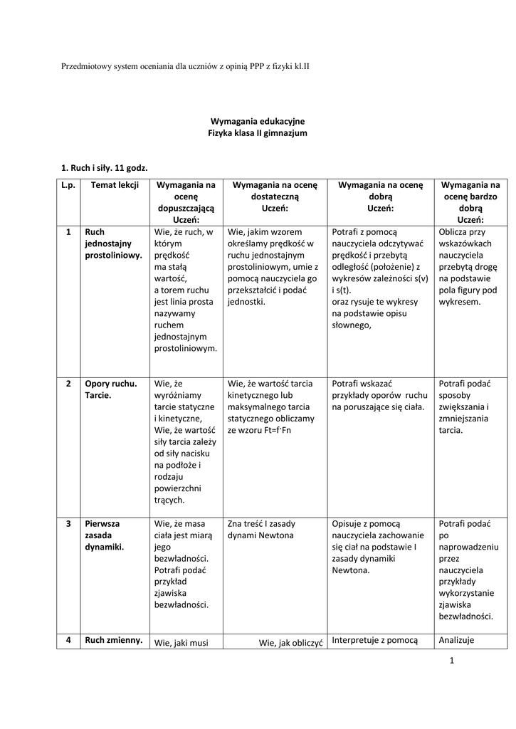 Przedmiotowy system oceniania dla uczniów z opinią PPP z fizyki kl.II Wymagania edukacyjne Fizyka klasa II gimnazjum 1. Ruch i siły. 11 godz. L.p. Temat lekcji 1 Ruch jednostajny prostoliniowy. 2 Opory ruchu. Tarcie. 3 4 Wymagania na ocenę dopuszczającą Uczeń: Wie, że ruch, w którym prędkość ma stałą wartość, a torem ruchu jest linia prosta nazywamy ruchem jednostajnym prostoliniowym. Wymagania na ocenę dostateczną Uczeń: Wymagania na ocenę dobrą Uczeń: Wie, jakim wzorem określamy prędkość w ruchu jednostajnym prostoliniowym, umie z pomocą nauczyciela go przekształcić i podać jednostki. Potrafi z pomocą nauczyciela odczytywać prędkość i przebytą odległość (położenie) z wykresów zależności s(v) i s(t). oraz rysuje te wykresy na podstawie opisu słownego, Wie, że wyróżniamy tarcie statyczne i kinetyczne, Wie, że wartość siły tarcia zależy od siły nacisku na podłoże i rodzaju powierzchni trących. Wie, że wartość tarcia kinetycznego lub maksymalnego tarcia statycznego obliczamy ze wzoru Ft=f·Fn Potrafi wskazać przykłady oporów ruchu na poruszające się ciała. Potrafi podać sposoby zwiększania i zmniejszania tarcia. Pierwsza zasada dynamiki. Wie, że masa ciała jest miarą jego bezwładności. Potrafi podać przykład zjawiska bezwładności. Zna treść I zasady dynami Newtona Opisuje z pomocą nauczyciela zachowanie się ciał na podstawie I zasady dynamiki Newtona. Potrafi podać po naprowadzeniu przez nauczyciela przykłady wykorzystanie zjawiska bezwładności. Ruch zmienny. Wie, jaki musi Wie, jak obliczyć Interpretuje z pomocą Wymagania na ocenę bardzo dobrą Uczeń: Oblicza przy wskazówkach nauczyciela przebytą drogę na podstawie pola figury pod wykresem. Analizuje 1 Przyspieszenie. być spełniony warunek, aby ciało poruszało się ruchem przyspieszonym. Wie, kiedy ciało porusza się ruchem opóźnionym. 5 Druga zasada dynamiki Newtona. 6. Ruch jednostajnie przyspieszony prostoliniowy. Wie, że siła wypadkowa jest przyczyną zmiany wektora prędkości ciała (skutek dynamiczny). Wie, że przyspieszenie jakie uzyskuje ciało pod wpływem działającej na nie siły wypadkowej, jest wprost proporcjonalne do masy ciała. Wie, że ruchem jednostajnie przyspieszonym jest taki ruch, którego torem ruchu jest linia prosta a prędkość rośnie jednostajnie. Wie, po naprowadzeniu przez nauczyciela jak obliczyć prędkość w tym ruchu korzystając z odpowiedniego przyspieszenie ciała korzystając ze wzoru. Zna jednostkę przyspieszenia. Zna wzór pozwalający obliczyć przyspieszenia ciała. Wie, że kierunek i zwrot ciała są zgodne z kierunkiem i zwrotem działającej siły wypadkowej. Podaje z pomocą nauczyciela definicję 1 niutona. Oblicza z pomocą nauczyciela drogę w ruchu jednostajnie przyspieszonym korzystając z odpowiedniego wzoru. Wie, że w ruchu jednostajnie przyspieszonym z prędkością początkową równą zero, w kolejnych, jednakowych przedziałach nauczyciela wzór i jednostkę przyspieszenia. Posługuje się pojęciem przyspieszenia do opisu ruchu o zmiennej prędkości. Na podstawie wyników pomiarów z pomocą nauczyciela rysuje wykres zależności v(t) dla ruchu przyspieszonego i opóźnionego. Opisuje z pomocą nauczyciela zachowanie się ciał na podstawie II zasady dynamiki Newtona. Posługuje się pojęciem przyspieszenia do opisu ruchu prostoliniowego, jednostajnie przyspieszonego. Odróżnia prędkość średnią od chwilowej w ruchu niejednostajnym na podstawie wskazanych przez nauczyciela przykładów. wykresy v(t). Rozwiązuje z pomocą nauczyciela zadania rachunkowe. Stosuje z pomocą nauczyciela do obliczeń związek między masą ciała, przyspieszeniem a siłą. Na podstawie wykresu v(t) rozpoznaje z pomocą nauczyciela rodzaj ruchu. Na podstawie wykresu v(t) oblicza z pomocą nauczyciela przebytą drogę i przyspieszenie. Stosuje do obliczeń poznane wzory. 2 wzoru. 7. Spadek swobodny. Wie, że spadkiem swobodnym nazywamy ruch ciał z prędkością początkową =0, na które działa tylko siła ciężkości. 8. Ruch jednostajnie opóźniony prostoliniowy. 9. Trzecia zasada dynamiki. Wie, że ruchem jednostajnie opóźnionym jest taki ruch, w którym wartość prędkości maleje jednostajnie, a torem ruchu jest linia prosta. Zna treść III zasady dynamiki. Wie, że działające na siebie siły maja ten sam kierunek i wartość a przeciwne zwroty. 10. 11. czasu, ciało przebywa odcinki drogi, które pozostają w takiej proporcji, jak kolejne liczby nieparzyste. Wie, że spadek swobodny jest ruchem jednostajnie przyspieszonym prostoliniowym z przyspieszeniem grawitacyjnym. Wie, że przyspieszenia ciała spadającego swobodnie nie zależy od jego masy. Wie, jak obliczamy wartość prędkości oraz drogę w ruchu opóźnionym. Z pomocą nauczyciela stosuje zasadę zachowania energii mechanicznej. Sporządza z pomocą nauczyciela wykres v(t) dla spadku swobodnego. Na wykresie v(t) rozpoznaje ruch jednostajnie opóźniony. Oblicza z pomocą nauczyciela przyspieszenie na podstawie wykresu v(t). Opisuje z pomocą nauczyciela wzajemne oddziaływania ciał posługując się III zasada dynamiki Newtona. Oblicza z pomocą nauczyciela drogę na podstawie pola figury pod wykresem v(t). Wie, że siły działają na siebie równocześnie i nie równoważą się, ponieważ każda z nich jest przyłożona do innego ciała. Wie, że siły te nazywamy siłami akcji i reakcji. Powtórzenie wiadomości i doskonalenie umiejętności. Sprawdzian wiadomości i umiejętności. Opisuje ze wskazówkami nauczyciela zachowanie się ciał na podstawie zasady korzystając z przykładów z najbliższego otoczenia. 3 2. Drgania i fale mechaniczne. 12 godz. L.p . Temat lekcji Treści konieczne Uczeń: 13. Ruch drgający. Wie, jaki ruch nazywamy ruchem drgającym. Wie, jakie są wielkości do opisu drgań: okres, amplituda, częstotliwość; potrafi je opisać. 14. Drgania swobodne. Wie, kiedy ciało wykonuje d