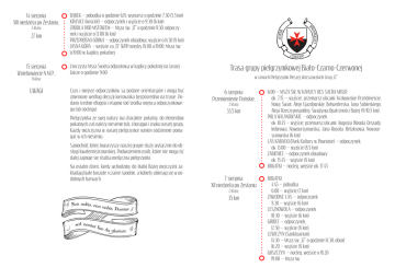 27 km 15 sierpnia Wniebowięcie N.M.P., Uroczysta Msza Święta odpustowa w kaplicy pokutnej na Jasnej Górze o godzinie 9:00 A 2 klasy DĄBEK – pobudka o godzinie 6:15; wymarsz o godzinie 7:30 (5,5 km) KRASICE (kościół) – odpoczynek i wyjście o 9:30 (6 km) ŹRÓDŁA POD MSTOWEM – Msza św. „17” o godzinie 11:30, odpoczynek i wyjście o 13:00 (6 km) PRZEPROŚNA GÓRKA – odpoczynek obiadowy, wyjście o 14:30 (8 km) JASNA GÓRA – wejście za „15” WPP między 18:00 a 19:00; Msza św. o 19:00 w kaplicy pokutnej CZER W ON 14 sierpnia XIII niedziela po Zesłaniu, CZARNO Trasa grupy pielgrzymkowej Biało-Czarno-Czerwonej w ramach Pielgrzymki Pieszej Warszawskich Grup „17” 1 klasy UWAGI Czas i miejsce odpoczynków są podane orientacyjnie i mogą być zmienione według decyzji kierownika bezpośrednio na trasie. Podano średnie długości etapów (od środka miejsca odpoczynkowego lub noclegu). 6 sierpnia Przemienienie Pańskie, 2 klasy 33,5 km Pielgrzymka ze swej natury ma charakter pokutny, do elementów pokutnych zaś należy niesienie tub, chorągwi i znaku naszej grupy. Każdy mężczyzna w naszej pielgrzymce winien codziennie pomagać w ich niesieniu. Samochód, który towarzyszy naszej grupie służy wyłącznie do obsługi kwatermistrzowskiej. Podwożeniem osób, które nie mogą iść dalej zajmuje się służba medyczna pielgrzymki. Na ostatni dzień, kiedy wchodzimy do Matki Bożej mężczyźni zakładają białe koszule i czarne spodnie, a kobiety ubierają się w podobnych barwach. 7 sierpnia XII niedziela po Zesłaniu 2 klasy 35 km Non nobis, non nobis, Do mine sed nomini tuo d a glo ria m 6:00 — MSZA ŚW. W KAPLICY RES SACRA MISER ok. 7:15 — wyjście; przemarsz ulicami: Krakowskie Przedmieście, Nowy Świat, Aleje Ujazdowskie, Belwederska, Jana Sobieskiego, Aleja Rzeczypospolitej, Świątynia Opatrzności Bożej (9/10,5 km) POLA WILANOWSKIE – odpoczynek ok. 10:45 — wyjście; przemarsz ulicami: Augusta Hlonda, Orszady, Imbirowa, Nowoursynowska, Jana Rosoła, Relaksowa, Nowoursynowska (6 km) LAS KABACKI (Park Kultury w Powsinie) – odpoczynek ok. 13:00 — wyjście (8,5 km) ŻABIENIEC – odpoczynek obiadowy ok. 15:45 — wyjście (8 km) BOGATKI – nocleg, wejście ok. 17:45 BOGATKI 4:45 – pobudka 6:00 – wyjście (7 km) ZAWODNE-LAS – odpoczynek 8:30 – wyjście (6 km) LESZNOWOLA – odpoczynek 10:30 – wyjście (6 km) GRÓJEC – odpoczynek, 12:30 – wyjście (8 km) LEWICZYN (Sanktuarium) 14:30 – Msza św. „17” o godzinie 14:30, obiad 16:20 – wyjście (8 km) GOSZCZYN – nocleg, wejście o 18:20 19:00 – Msza św. 8 sierpnia św. Jana Marii Vianney’a, Wyznawcy, 3 klasy 19,5 km 9 sierpnia wigilia św. Wawrzyńca, 3 klasy 26 km 10 sierpnia św. Wawrzyńca, Męczennika, 2 klasy 35 km GOSZCZYN 6:45 – pobudka 7:45 – wyjście (5 km) NOWY PRZYBYSZEW (kaplica) – odpoczynek ok. 9:30 – wyjście (6 km) DĘBNOWOLA – odpoczynek ok. 12:00 – wyjście (7 km) MICHAŁOWICE – wejście o 14:00 15:00 – Msza św. w kościele MICHAŁOWICE 5:00 – pobudka 5:30 – Msza św. w kościele; 6:30 – wyjście (6 km) GOSTOMIA – odpoczynek 8:20– wyjście (4,5 km) NOWE MIASTO NAD PILICĄ – odpoczynek 9:30 – Msza św. „17” ok. 11:45 – wyjście (8,5 km) RÓŻANNA – odpoczynek, 14:45 – wyjście; Droga Krzyżowa (7 km) GAPININ – nocleg, wejście 16:45 GAPININ 4:45 – pobudka 5:00 – Msza św w kościele 6:00 – wyjście (7 km) STUDZIANNA (sanktuarium) 8:00 – Msza św. „17” wymarsz ok. 9:40 – wyjście (6 km) LAS ZA CZARNĄ DROGĄ – odpoczynek 11:30 – wyjście (8 km) KRUSZEWIEC – obiad we wsiach Kolonia i Kruszewiec 14:10 – wyjście (6 km) połowa pielgrzymki – kapliczka na polu za Kruszewcem (po prawej) LAS PRZED JANUSZEWICAMI – odpoczynek 16:40 – wyjście(8 km) ZACHORZÓW – nocleg, wejście o 18:45 11 sierpnia śś. Tyburcjusza i Zuzanny, Męczenników, 4 klasy 31 km 12 sierpnia św. Klary, Dziewicy, 3 klasy 23,5 km 13 sierpnia śś. Hipolita i Kasjana, Męczenników, 4 klasy 35,5 km ZACHORZÓW 5:30 – pobudka 7:00 – wyjście (7,5 km) PARADYŻ (sanktuarium) 8:45 – Msza św. „17” 9:50 – Msza św. w Sanktuarium, wyjście zaraz po Mszy (5 km / 7 km) DŁUŻNIEWICE / ZDYSZEWICE – odpoczynek obiadowy 12:20 / 12:40 – wyjście (7,5 km / 6 km) LAS K/ŁAWKI – odpoczynek 14:45 – wyjście (6 km) LAS K/PAPIERNI – odpoczynek, 16:00 – wyjście wyjście (6,5 km) WĄSOSZ – nocleg, wejście o godzinie 17:30 WĄSOSZ 6:00 – pobudka 6:30 – Msza św. polowa ok. 8:00 – wyjście (7,5 km) WIERZCHLAS – odpoczynek 11:00 – wyjście (7 km) CHAŁUPY – odpoczynek 14:15 – wyjście (9 km) KRZĘTÓW – nocleg, wejście o godzinie 16:30 KRZĘTÓW 4:30 – pobudka 5:45 – Msza św. polowa z formularza za zmarłych 7:15 – wyjście (8 km) LAS PRZED ŁAZOWEM – odpoczynek 9:50 – wyjście (5 km) SILNICA – odpoczynek 11:35 – wyjście (7,5 km) SEKURSKO – odpoczynek obiadowy 14:30 – wyjście (8 km) NOWA WIEŚ – odpoczynek 17:00 – wyjście (7 km) DĄBEK– nocleg, wejście o godzinie 18:35