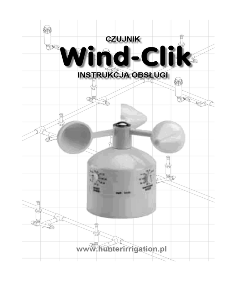 WSTĘP W większości przypadków, gdy zrywa się duży wiatr, Wind-Clik wyłącza obieg tak, że zawory są zamknięte. Dzięki temu wybrany program nie zostaje zatrzymany, a zarazem zawory nie są otwarte i zraszacze nie pracują. Kiedy wiatr ustaje cały system powraca do normalnej pracy. MONTAŻ Obudowa Wind-Clik została skonstruowana tak, aby łatwo można było ją zamontować na rurze średnicy 2“. Długość rury montażowej i sposób jej zamocowania może być różny. Na przykład długa rura może być wbita bezpośrednio w ziemię lub krótka rura może być przymocowana do skraju dachu. Miejsce montażu. Czujnik powinien być zamontowany w takim miejscu, aby ani budynek, ani żadna inna przeszkoda nie przysłaniała wiatru. Nie zawsze jest konieczne montowanie urządzenie wysoko ponad budynkami. Prędkość wiatru zależy od urozmaicenia terenu i dlatego dla systemów nawadniania czujnik wiatru powinien być montowany co najmniej 2 metry nad ziemią. PODŁĄCZANIE DO SYSTEMU NAWADNIANIA Podłączenie do sterownika SRC. Czujnik wiatru podłącza się bezpośrednio do sterownika SRC. Dzięki temu łatwo można obejść czujnik poprzez przestawienie pokrętła w sterowniku w pozycję RUN (BYPASS SENSOR). 1. Poprowadź przewód przez ten sam otwór, którym prowadzisz przewód od zaworów. 2. Jeden kabel podłącz do stycznika oznaczonego RS, a drugi do C (rys. 1). 3. Podłącz kabel wspólny dla wszystkich zaworów do styku RS. Copyright © 2004 Agro-Kultura Wind-Click, Instrukcja obsługi, strona 1 Podłączenie do sterownika ICC. Czujnik wiatru podłącza się bezpośrednio do sterownika ICC. Dzięki temu łatwo możesz obejść czujnik poprzez przełączenie włącznika SENSOR w sterowniku. 1. Wyjmij złączkę obejmującą styki SEN. 2. Poprowadź przewód przez ten sam otwór, którym prowadzisz przewód od zaworów. 3. Jeden kabel podłącz do stycznika oznaczonego SEN, a drugi do drugiego SEN (rys. 2) Podłączenie do innych sterowników. Dwa najczęściej spotykane przypadki omówione są poniżej. Przy niestandardowych sytuacjach skontaktuj się z dystrybutorem, aby uzyskać pomoc. W systemach nawadniających użyj wspólnych przewodów, aby mieć możliwość przerwania obiegu (rys. 3). Przy sterownikach ze specjalnym wejściem dla czujników użyj przewodów zależnie od instrukcji obsługi (rys. 4). USTAWIENIA Duże pokrętło służy do ustawienia maksymalnej prędkości wiatru, powyżej której czujnik przerwie obieg. Na przykład, jeżeli czujnik podłączony jest do sterownika w układzie zaworów “normalnie zamknięty”, na wyświetlaczu sterownika pokazana będzie prędkość wiatru, dla której obieg zostanie przerwany i system przestanie nawadniać. Małe pokrętło służy do ustawienia minimalnej prędkości wiatru, przy której czujnik z powrotem zamknie obieg i system powróci do normalnej pracy. Prędkość minimalna powinna być ustawiona poniżej prędkości maksymalnej, rozłączającej obieg. Jeżeli obie prędkości będą ustawione jednakowo, to czujnik na przemian będzie włączał i wyłączał nawadnianie. Różnica pomiędzy tymi wielkościami określa cykl przerwy sterowania systemem nawadniania. Nie próbuj przekręcić pokręteł poniżej wychyleń minimalnych, jak również powyżej wychyleń maksymalnych. Copyright © 2004 Agro-Kultura Wind-Click, Instrukcja obsługi, strona 2 WSKAZÓWKI PRAKTYCZNE W urządzeniu wbudowany jest tłumik eliminujący efekty spowodowane nagłymi i mocnymi powiewami wiatru. Tak więc urządzenie dostosowuje swoją pracę do prędkości wiatru. Użytkownik powinien dokonać wstępnych ustawień i obserwować zachowanie czujnika. Dopiero na podstawie tych obserwacji można dokonać korekty ustawień. Można również testować zachowanie urządzenia, przekręcając ręką łopatki wiatraka zgodnie z narysowanymi strzałkami. Czujnik wyłączy obieg, gdy łopatki wychylą się od punktu 0 stopni o mniej więcej kąt 90 stopni. Maksymalne wychylenie łopatek może wynieść 180 stopni. Ponowne włączenie nastąpi po ustaniu wiatru i cofnięciu się łopatek do wychylenia poniżej 45 stopni od punktu 0 stopni. Copyright © 2004 Agro-Kultura Wind-Click, Instrukcja obsługi, strona 3