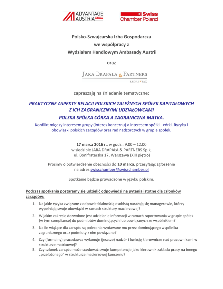 Polsko-Szwajcarska Izba Gospodarcza we współpracy z Wydziałem Handlowym Ambasady Austrii oraz zapraszają na śniadanie tematyczne: PRAKTYCZNE ASPEKTY RELACJI POLSKICH ZALEŻNYCH SPÓŁEK KAPITAŁOWYCH Z ICH ZAGRANICZNYMI UDZIAŁOWCAMI POLSKA SPÓŁKA CÓRKA A ZAGRANICZNA MATKA. Konflikt między interesem grupy (interes koncernu) a interesem spółki - córki. Ryzyka i obowiązki polskich zarządów oraz rad nadzorczych w grupie spółek. 17 marca 2016 r., w godz.: 9.00 – 12.00 w siedzibie JARA DRAPAŁA & PARTNERS Sp.k, ul. Bonifraterska 17, Warszawa (XIII piętro) Prosimy o potwierdzenie obecności do 10 marca, przesyłając zgłoszenie na adres [email protected] Spotkanie będzie prowadzone w języku polskim. Podczas spotkania postaramy się udzielić odpowiedzi na pytania istotne dla członków zarządów: 1. Na jakie ryzyka związane z odpowiedzialnością osobistą narażają się managerowie, którzy wypełniają swoje obowiązki w ramach struktury macierzowej? 2. W jakim zakresie dozwolone jest udzielanie informacji w ramach raportowania w grupie spółek (w tym compliance) do podmiotów dominujących lub powiązanych ze wspólnikiem? 3. Na ile wiążące dla zarządu są polecenia wydawane mu przez dominującego wspólnika zagranicznego oraz podmioty z nim powiązane? 4. Czy (formalny) pracodawca wykonuje (jeszcze) nadzór i funkcję kierownicze nad pracownikami w strukturze matrixowej? 5. Czy członek zarządu może scedować swoje kompetencje jako kierownik zakładu pracy na innego „przełożonego” w strukturze macierzowej koncernu? Program: PRAKTYCZNE ASPEKTY RELACJI POLSKICH ZALEŻNYCH SPÓŁEK KAPITAŁOWYCH Z ICH ZAGRANICZNYMI UDZIAŁOWCAMI (ze szczególnym uwzględnieniem odpowiedzialności członków zarządu polskiej spółki w ramach grupy spółek) Konflikt między interesem grupy (interes koncernu) a interesem spółki - córki. Ryzyka i obowiązki polskich zarządów oraz rad nadzorczych w grupie spółek Struktura macierzowa (Matrix Organisation) – odpowiedzialność członków zarządu I. Problemy prawne i osobista odpowiedzialność członków zarządu działających w Polsce spółek kapitałowych międzynarodowych koncernów. 1. Spółkowo-korporacyjna hierarchia vs. organizacja matrixowa w koncernie 1) Raportowanie 2) Wiążące polecenia z „centrali” 3) Outsourcing 4) Restrukturyzacja działalności operacyjnej 5) Cash pooling 6) Pożyczka (upstream loan) i poręczenia na rzecz spółki - matki i innych spółek koncernu 7) Przystąpienie do długu 8) Zastaw na udziałach II. Osobista i cywilna odpowiedzialność członków organów w organizacji matrixowej 1) Odpowiedzialność „wewnętrzna” wobec wspólnika oraz wobec spółki 2) Odpowiedzialność wobec osób trzecich III. Matrix kontra prawo pracy - lepsze wykorzystanie potencjału pracowników, z pominięciem problemów związanych z „transgranicznym” delegowaniem, przeniesieniem bądź udostępnieniem pracowników i ich know-how. - pracownicy są wprawdzie zatrudnieni u polskiego pracodawcy, ale wykonują pracę (i polecenia) w ramach grup roboczych organizacji macierzowej koncernu w „transgranicznych” zespołach. Warsaw 5095508.1 Prelegenci Zbigniew Jara specjalizuje się w doradztwie w zakresie prawa spółek, nabywania przedsiębiorstw (M&A), prawa handlowego, joint ventures, prawa kartelowego, a także w zakresie rozwoju i finansowania projektów. Swoje doświadczenie zawodowe zdobywał jako niemiecki adwokat (Rechtsanwalt) w latach 1994 - 1996 w Gurland & Lambsdorff we Frankfurcie nad Menem, w 1997 r. w Gleiss Lutz we Frankfurcie nad Menem, a w latach 1998 - 2005 w warszawskim biurze kancelarii Gleiss Lutz jako współzałożyciel i Partner Zarządzający. Od 2005 r. jest Partnerem Założycielem i Partnerem Zarządzającym w kancelarii JARA DRAPAŁA & PARTNERS w Warszawie. Projekty, które realizował dotyczyły wielu transakcji M&A oraz joint venture, m.in. kompleksowego doradztwa prawnego niemieckiemu właścicielowi przy restrukturyzacji, a następnie przy sprzedaży ponad 210 dyskontów (część operacyjna) na rzecz lidera na polskim rynku, kompleksowego doradztwa odnośnie struktury (SPV) i warunków współpracy (joint venture) niemieckiego koncernu z polskimi podmiotami w związku z budową fabryki fundamentów do morskich elektrowni wiatrowych. Doradzał także niemieckiemu koncernowi rolnemu przy restrukturyzacji, a następnie przy połączeniu kilkunastu spółek akcyjnych w Polsce. Autor licznych publikacji z zakresu prawa spółek i prawa handlowego oraz prawa kartelowego,. Redaktor i autor Komentarza do Kodeksu Spółek Handlowych wydawnictwa C.H. Beck w serii Duże Komentarze Becka, Marcin Chomiuk specjalizuje się w doradztwie w zakresie prawa spółek, fuzji i przejęć oraz prawa umów ze szczególnym uwzględnieniem inwestycji infrastrukturalnych. Swoje doświadczenie zawodowe zdobywał w Polsko-Niemieckiej Izbie PrzemysłowoHandlowej w Warszawie (2004 - 2006), gdzie zajmował się doradztwem prawnym i ekonomicznym w zakresie prowadzenia działalności gospodarczej w Polsce i w Niemczech. Od 2007 roku zajmował stanowisko associate, a od 2015 roku jest Partnerem w kancelarii Jara Drapała & Partners. Projekty, które realizował dotyczyły m.in. doradztwa prawnego dla niemieckiego inwestora branżowego w związku z projektem joint venture realizowanym z polskimi partnerami, obejmującym budowę zakładu produkcji fundamentów dla morskich siłowni wiatrowych, doradztwa prawnego dla niemieckiego inwestora branżowego w związku z nabyciem akcji krajowego producenta elektrofiltrów. Doradzał polskiej spółce budowlanej wchodzącej w skład francuskiej grupy kapitałowej w związku z projektem joint venture realizowanym z krajowymi oraz francuskimi partnerami obejmującym budowę kompleksu handlowego w zachodniej Polsce, a także na rzecz głównego projektanta nowego bloku energetycznego Elektrowni Jaworzno III przy negocjowaniu umowy z generalnym wykona