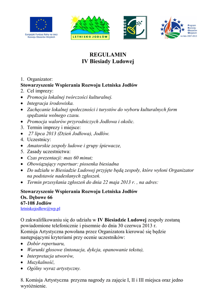 REGULAMIN IV Biesiady Ludowej 1. Organizator: Stowarzyszenie Wspierania Rozwoju Letniska Jodłów 2. Cel imprezy: Promocja lokalnej twórczości kulturalnej. Integracja środowiska. Zachęcanie lokalnej społeczności i turystów do wyboru kulturalnych form spędzania wolnego czasu. Promocja walorów przyrodniczych Jodłowa i okolic. 3. Termin imprezy i miejsce: 27 lipca 2013 (Dzień Jodłowa), Jodłów. 4. Uczestnicy: Amatorskie zespoły ludowe i grupy śpiewacze, 5. Zasady uczestnictwa: Czas prezentacji: max 60 minut; Obowiązujący repertuar: piosenka biesiadna Do udziału w Biesiadzie Ludowej przyjęte będą zespoły, które wyłoni Organizator na podstawie nadesłanych zgłoszeń. Termin przesyłania zgłoszeń do dnia 22 maja 2013 r. , na adres: Stowarzyszenie Wspierania Rozwoju Letniska Jodłów Os. Dębowe 66 67-108 Jodłów [email protected] O zakwalifikowaniu się do udziału w IV Biesiadzie Ludowej zespoły zostaną powiadomione telefonicznie i pisemnie do dnia 30 czerwca 2013 r. Komisja Artystyczna powołana przez Organizatora kierować się będzie następującymi kryteriami przy ocenie uczestników: Dobór repertuaru, Warunki głosowe (intonacja, dykcja, opanowanie tekstu), Interpretacja utworów, Muzykalność, Ogólny wyraz artystyczny. 8. Komisja Artystyczna przyzna nagrody za zajęcie I, II i III miejsca oraz jedno wyróżnienie. 9. Nagrody: I miejsce – nagroda rzeczowa o wartości około 600, 00 zł II miejsce – nagroda rzeczowa o wartości około 450, 00 zł . III miejsce – nagroda rzeczowa o wartości około 350, 00 zł . Wyróżnienie– nagroda rzeczowa o wartości około 200, 00 zł . Organizator zapewnia dojazd i katering dla zaproszonych zespołów. Organizator zastrzega sobie prawo do zmian w regulaminie. Ostateczna interpretacja zapisów regulaminu należy do Organizatora.