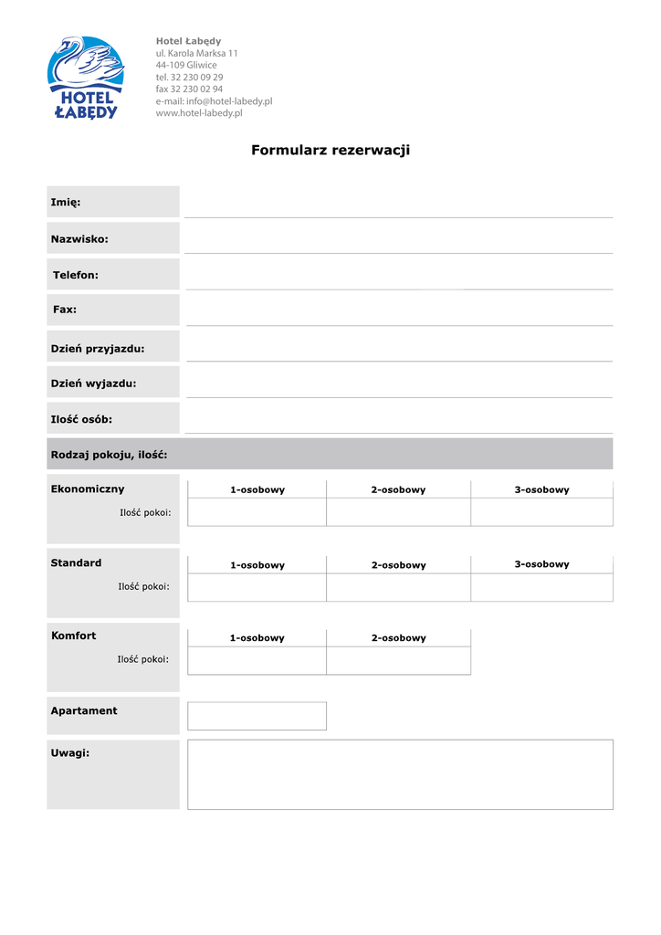Hotel Łabędy ul. Karola Marksa 11 44-109 Gliwice tel. 32 230 09 29 fax 32 230 02 94 e-mail: [email protected] www.hotel-labedy.pl