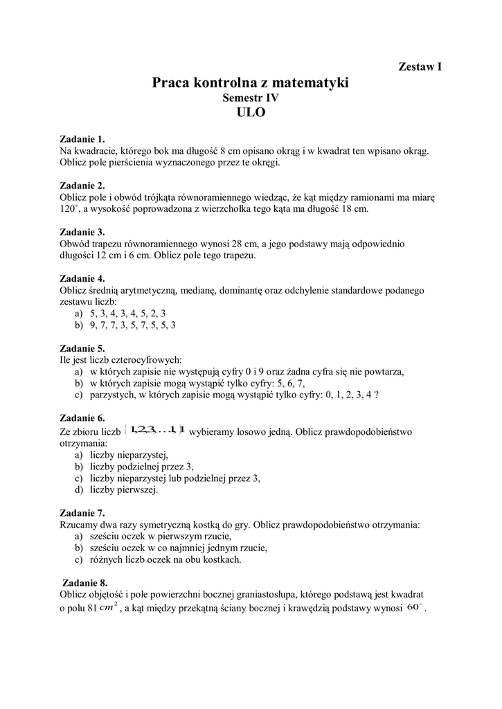 Zestaw I Praca kontrolna z matematyki Semestr IV ULO Zadanie 1. Na kwadracie, którego bok ma długość 8 cm opisano okrąg i w kwadrat ten wpisano okrąg. Oblicz pole pierścienia wyznaczonego przez te okręgi. Zadanie 2. Oblicz pole i obwód trójkąta równoramiennego wiedząc, że kąt między ramionami ma miarę 120˚, a wysokość poprowadzona z wierzchołka tego kąta ma długość 18 cm. Zadanie 3. Obwód trapezu równoramiennego wynosi 28 cm, a jego podstawy mają odpowiednio długości 12 cm i 6 cm. Oblicz pole tego trapezu. Zadanie 4. Oblicz średnią arytmetyczną, medianę, dominantę oraz odchylenie standardowe podanego zestawu liczb: a) 5, 3, 4, 3, 4, 5, 2, 3 b) 9, 7, 7, 3, 5, 7, 5, 5, 3 Zadanie 5. Ile jest liczb czterocyfrowych: a) w których zapisie nie występują cyfry 0 i 9 oraz żadna cyfra się nie powtarza, b) w których zapisie mogą wystąpić tylko cyfry: 5, 6, 7, c) parzystych, w których zapisie mogą wystąpić tylko cyfry: 0, 1, 2, 3, 4 ? Zadanie 6. 11 wybieramy losowo jedną. Oblicz prawdopodobieństwo Ze zbioru liczb 1,2,3,..., otrzymania: a) liczby nieparzystej, b) liczby podzielnej przez 3, c) liczby nieparzystej lub podzielnej przez 3, d) liczby pierwszej. Zadanie 7. Rzucamy dwa razy symetryczną kostką do gry. Oblicz prawdopodobieństwo otrzymania: a) sześciu oczek w pierwszym rzucie, b) sześciu oczek w co najmniej jednym rzucie, c) różnych liczb oczek na obu kostkach. Zadanie 8. Oblicz objętość i pole powierzchni bocznej graniastosłupa, którego podstawą jest kwadrat 2 o polu 81 cm , a kąt między przekątną ściany bocznej i krawędzią podstawy wynosi 60 . Zestaw II Praca kontrolna z matematyki Semestr IV ULO Zadanie 1. Na kwadracie, którego bok ma długość 10 cm opisano okrąg i w kwadrat ten wpisano okrąg. Oblicz pole pierścienia wyznaczonego przez te okręgi. Zadanie 2. Oblicz pole i obwód trójkąta równoramiennego wiedząc, że kąt między ramionami ma miarę 120˚, a ramię ma długość 24 cm. Zadanie 3. Obwód trapezu równoramiennego wynosi 28 cm, a jego podstawy mają odpowiednio długości 12 cm i 6 cm. Oblicz pole tego trapezu. Zadanie 4. Oblicz średnią arytmetyczną, medianę, dominantę oraz odchylenie standardowe podanego zestawu liczb: a) 5, 3, 4, 3, 4, 5, 2, 3 b) 9, 7, 7, 3, 5, 7, 5, 5, 3 Zadanie 5. Ile jest liczb czterocyfrowych: a) w których zapisie nie występują cyfry 0 i 9 oraz żadna cyfra się nie powtarza, b) w których zapisie mogą wystąpić tylko cyfry: 5, 6, 7, c) parzystych, w których zapisie mogą wystąpić tylko cyfry: 0, 1, 2, 3, 4 ? Zadanie 6. ,22 ,23 ,..., 31 Ze zbioru liczb 21 wybieramy losowo jedną. Oblicz prawdopodobieństwo otrzymania: a) liczby nieparzystej, b) liczby podzielnej przez 3, c) liczby nieparzystej lub podzielnej przez 3, d) liczby pierwszej. Zadanie 7. Rzucamy dwa razy symetryczną kostką do gry. Oblicz prawdopodobieństwo otrzymania: a) sześciu oczek w pierwszym rzucie, b) sześciu oczek w co najmniej jednym rzucie, c) różnych liczb oczek na obu kostkach. Zadanie 8. Oblicz objętość i pole powierzchni bocznej graniastosłupa, którego podstawą jest kwadrat 2 o polu 64 cm , a kąt między przekątną ściany bocznej i krawędzią podstawy wynosi 60 .