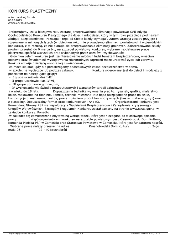 Komenda Miejska Państwowej Straży Pożarnej w Zamościu KONKURS PLASTYCZNY Autor: Andrzej Szozda 03.02.2015. Zmieniony 03.02.2015. Informujemy, że w bieżącym roku zostaną przeprowadzone eliminacje powiatowe XVII edycja Ogólnopolskiego Konkursu Plastycznego dla dzieci i młodzieży, który w tym roku przebiega pod hasłem: „Bezpieczeństwo i rozwaga - tego od Ciebie każdy wymaga". Zatem wracają zasady przyjęte i stosowane w minionych latach (w ubiegłym roku, nie prowadzono eliminacji powiatowych i wojewódzkich konkursu), z ta różnicą, że nie planuje sie przeprowadzania eliminacji gminnych. Zainteresowane szkoły powinni przesłać do 6 marca br., na szczebel powiatowy Konkursu, wybrane najciekawsze prace plastyczne spośród wszystkich prac wykonanych przez uczniów i wychowanków. Głównym celem konkursu jest zainteresowanie młodych ludzi tematem bezpieczeństwa, właściwa postawa oraz świadomość występowania różnorodnych zagrożeń może uratować życie lub zdrowie. Konkurs rozwija dziecięcą wyobraźnię i świadomość, co może się stać, gdy nie przestrzegamy podstawowych zasad bezpieczeństwa w domu, w szkole, na wycieczce lub podczas zabawy. Konkurs skierowany jest do dzieci i młodzieży z podziałem na następujące grupy: - I grupa uczniowie klas I-III, - II grupa uczniowie klas IV-VI, - III grupa uczniowie gimnazjum, - IV wychowankowie świetlic terapeutycznych i warsztatów terapii zajęciowej (w wieku do 18 lat). Dopuszczalna technika wykonania prac to: rysunek, grafika, malarstwo, kolaż, malowanie na tkaninie, komiks, techniki mieszane. Nie będą uwzględniane prace na szkle, kompozycje przestrzenne, rzeźby, prace z użyciem produktów spożywczych (kasze, makarony, ryż) oraz z plasteliny. Dopuszczalny format prac konkursowych: A4; A3. Organizatorami konkursu jest Komendant Główny PSP we współpracy z Wydziałami Bezpieczeństwa i Zarządzania Kryzysowego Urzędów Wojewódzkich. Szczegóły i regulamin Konkursu został zawarty na stronie www.straz.gov.pl w zakładce konkursy. Ponadto w zakładce tej zamieszczono edytowalną wersję tabeli, która jest niezbędna do właściwego opisania pracy. Współorganizatorem konkursu na szczeblu powiatowym jest Krasnobrodzki Dom Kultury, Komenda Miejska PSP w Zamościu oraz Starostwo Powiatowe w Zamościu, które jest fundatorem nagród. Wybrane prace należy przesłać na adres: Krasnobrodzki Dom Kultury ul. 3-go maja 26 22-440 Krasnobród http://kmpspzamosc.eurzad.eu Kreator PDF Utworzono 7 March, 2017, 12:12