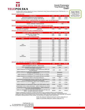 Cennik Promocyjny Twój Rodzinny 100, 13/4851 Niniejszy cennik stanowi załącznik do Umowy o Świadczenie Usług Telekomunikacyjnych przez TelePolska Sp. z o.o. 1 Stawki w PLN za minutę połączenia. OPŁATY MIESIĘCZNE rodzaj opłaty netto VAT brutto abonament telefoniczny (linie analogowe) abonament telefoniczny (dostęp ISDN 2B+D) 32,51 54,91 23% 23% 39,99 67,54 Super Oferta! co miesiąc 100 minut na rozmowy do wszystkich krajowych sieci stacjonarnych. PAKIET BEZPŁATNYCH MINUT (MIESIĘCZNIE NA KAŻDĄ LINIĘ TELEFONICZNĄ) 2 rodzaje połączeń bezpłatne minuty lokalne, strefowe i międzystrefowe 100 OPŁATY ZA POŁĄCZENIA LOKALNE, STREFOWE I MIĘDZYSTREFOWE dni godziny netto VAT brutto 0,18 23% 0,22 rodzaj opłaty (24h/7 dni w tygodniu) netto VAT brutto do sieci: Era, Orange, Plus do innych sieci 0,55 0,73 23% 23% 0,68 0,90 netto VAT brutto 0,55 0,69 1,59 2,99 3,69 3,99 5,99 6,99 0,79 1,19 1,69 1,99 2,69 3,11 4,99 6,99 23% 23% 23% 23% 23% 23% 23% 23% 23% 23% 23% 23% 23% 23% 23% 23% 0,68 0,85 1,96 3,68 4,54 4,91 7,37 8,60 0,97 1,46 2,08 2,45 3,31 3,83 6,14 8,60 netto VAT Brutto całą dobę wszystkie dni tygodnia OPŁATY ZA POŁĄCZENIA DO SIECI KOMÓRKOWYCH OPŁATY ZA POŁĄCZENIA MIĘDZYNARODOWE sieci strefa strefa 1 strefa 2 strefa 3 strefa 4 strefa 5 strefa 6 strefa 7 strefa 8 strefa 1 strefa 2 strefa 3 strefa 4 strefa 5 strefa 6 strefa 7 strefa 8 sieci stacjonarne sieci komórkowe OPŁATY ZA USŁUGI I CZYNNOŚCI DODATKOWE rodzaj usługi wykaz szczegółowy połączeń – billing on-line wykaz szczegółowy połączeń w formie wydruku, CD lub e-mail (opłata miesięczna) opłata miesięczna za każdy posiadany numer telefoniczny MSN (dot. linii ISDN 2B+D) opłata miesięczna za dzierżawę urządzenia zakończenia sieciowego NT (dot. linii ISDN 2B+D) Bezpłatny 5,00 23% 6,15 4,00 23% 4,92 Bezpłatnie opłata miesięczna za dodatkowe 10 numerów DDI (dot. linii ISDN) Bezpłatnie opłata miesięczna za dodatkowe 100 numerów DDI (dot. linii ISDN) jednorazowa opłata za aktywację każdej linii przeniesienie przydzielonego numeru w ramach sieci TelePolska sp. z o.o. na obszarze tej samej strefy numeracyjnej opłata miesięczna za zawieszenie usług w sieci analogowej (płatna z góry) opłata miesięczna za zawieszenie usług w sieci ISDN (płatna z góry) Bezpłatnie 12,00 23% 14,76 10,00 23% 12,30 22,00 23% 27,06 23% 37,52 30,50 prezentacja numeru osoby dzwoniącej – opłata miesięczna (za numer) prezentacja numeru (CLIP) /ruch przychodzący/– opłata miesięczna (za numer) dot.linii analogowych opłata za uszkodzenie lub utratę zakończenia sieciowego NT (dot. linii ISDN) - za każde zakończenie sieciowe Bezpłatnie 2,60 23% 3,20 340,00 23% 418,20 1 Opłaty za połączenia są naliczane za każdą rozpoczętą minutę w wysokości stawki za minutę połączenia. Pakiet minut umożliwia zrealizowanie pierwszych stu minut połączeń lokalnych, strefowych i międzystrefowych bez dodatkowych opłat w trakcie jednego Okresu rozliczeniowego. Pakiet może być wykorzystany przez całą dobę i we wszystkie dni tygodnia. Niewykorzystane minuty z pakietu nie przechodzą na następny Okres rozliczeniowy. 2 Strefy dla połączeń międzynarodowych zawiera załącznik nr 1. Opłaty za pozostałe połączenia zawiera załącznik nr 2. TelePolska Sp. z o.o. Al. Jerozolimskie 123a, 02-017 Warszawa tel. +48 (22) 397 33 33, fax +48 (22) 397 33 99 www.telepolska.pl 1 Cennik Promocyjny Twój Rodzinny 100, 13/4851 ,,Cennik Promocyjny Twój Rodzinny 100” §1 1. Z Cennika Promocyjnego może skorzystać każdy Abonent, który spełni łącznie poniższe warunki: a) zawrze Umowę o świadczenie usług telekomunikacyjnych na czas określony 24 miesiące lub którego Umowa zawarta na czas określony 24 miesięcy ulegnie przedłużeniu na kolejny czas określony 24 miesięcy. b) jest Konsumentem w rozumieniu § 1 Regulaminu świadczenia usług telekomunikacyjnych przez TelePolska Sp. z o.o. z dnia 13 maja 2013 r. (zwanego dalej „Regulaminem”). 1. Cennik Promocyjny obowiązuje przez cały okres obowiązywania Umowy o świadczenie usług telekomunikacyjnych zawartej na czas określony 24 miesięcy lub przedłużonej o kolejny czas określony 24 miesięcy. Abonent może zawrzeć Umowę, której przedmiotem będzie świadczenie usług telekomunikacyjnych na więcej niż jeden numer telefoniczny. §2 2. §3 1. 2. 3. Począwszy od pierwszego Okresu rozliczeniowego, w którym Operator uruchomi usługę abonamentu telefonicznego Abonent będzie otrzymywał pakiet 100 (stu) minut gratis w każdym Okresie rozliczeniowym na każdą linię telefoniczną włączoną do Cennika Promocyjnego Twój Rodzinny 100. Bezpłatne minuty mogą być wykorzystane na połączenia lokalne, strefowe i międzystrefowe wykonywane w dowolnym czasie, w trakcie jednego Okresu rozliczeniowego. Niewykorzystane bezpłatne minuty nie przechodzą na następny Okres rozliczeniowy. Połączenia w ramach pakietu naliczane są minutowo. Począwszy od dnia rozpoczęcia przez Operatora świadczenia usług, Abonent jest uprawniony do korzystania z promocyjnych opłat za: zrealizowane połączenia, abonament, aktywację linii oraz pozostałe opłaty zgodnie z Cennikiem Promocyjnym Twój Rodzinny 100. Wysokość ulg dla Abonenta wynikająca z różnicy opłat zawartych w Cenniku Podstawowym oraz opłat zawartych w Cenniku Promocyjnym Twój Rodzinny 100 jest następująca: WYSOKOŚĆ ULG PRZYZNANYCH ABONENTOWI Cennik Podstawowy Miesięczny abonament telefoniczny (linie analogowe) 77,49 zł brutto 110,70 zł brutto 467,40 zł brutto Miesięczny abonament telefoniczny (dostęp ISDN 2B+D) Jednorazowej aktywacja każdej linii Cennik Promocyjny 39,99 zł brutto 67,54 zł brutto 14,76 zł brutto Ulga w opłacie: 37,50 zł miesięcznie 43,16 zł miesięcznie 452,64 zł jednorazowo 4. Operator udziela Abonentowi, który zawarł Umowę o świadczenie usług telekomunikacyjnych na czas określony 24 miesiące łącznej ulgi w rozumieniu art. 57