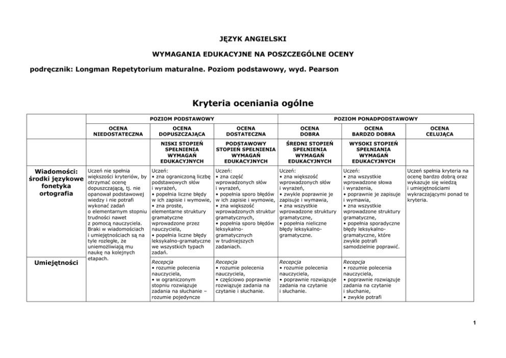 JĘZYK ANGIELSKI WYMAGANIA EDUKACYJNE NA POSZCZEGÓLNE OCENY podręcznik: Longman Repetytorium maturalne. Poziom podstawowy, wyd. Pearson Kryteria oceniania ogólne POZIOM PODSTAWOWY OCENA NIEDOSTATECZNA Wiadomości: środki językowe fonetyka ortografia Umiejętności Uczeń nie spełnia większości kryteriów, by otrzymać ocenę dopuszczającą, tj. nie opanował podstawowej wiedzy i nie potrafi wykonać zadań o elementarnym stopniu trudności nawet z pomocą nauczyciela. Braki w wiadomościach i umiejętnościach są na tyle rozległe, że uniemożliwiają mu naukę na kolejnych etapach. POZIOM PONADPODSTAWOWY OCENA DOPUSZCZAJĄCA OCENA DOSTATECZNA OCENA DOBRA OCENA BARDZO DOBRA NISKI STOPIEŃ SPEŁNIENIA WYMAGAŃ EDUKACYJNYCH PODSTAWOWY STOPIEŃ SPEŁNIENIA WYMAGAŃ EDUKACYJNYCH ŚREDNI STOPIEŃ SPEŁNIENIA WYMAGAŃ EDUKACYJNYCH WYSOKI STOPIEŃ SPEŁNIANIA WYMAGAŃ EDUKACYJNYCH Uczeń: • zna ograniczoną liczbę podstawowych słów i wyrażeń, • popełnia liczne błędy w ich zapisie i wymowie, • zna proste, elementarne struktury gramatyczne wprowadzone przez nauczyciela, • popełnia liczne błędy leksykalno-gramatyczne we wszystkich typach zadań. Uczeń: • zna część wprowadzonych słów i wyrażeń, • popełnia sporo błędów w ich zapisie i wymowie, • zna większość wprowadzonych struktur gramatycznych, • popełnia sporo błędów leksykalnogramatycznych w trudniejszych zadaniach. Uczeń: • zna większość wprowadzonych słów i wyrażeń, • zwykle poprawnie je zapisuje i wymawia, • zna wszystkie wprowadzone struktury gramatyczne, • popełnia nieliczne błędy leksykalnogramatyczne. Uczeń: • zna wszystkie wprowadzone słowa i wyrażenia, • poprawnie je zapisuje i wymawia, • zna wszystkie wprowadzone struktury gramatyczne, • popełnia sporadyczne błędy leksykalnogramatyczne, które zwykle potrafi samodzielnie poprawić. Recepcja • rozumie polecenia nauczyciela, • w ograniczonym stopniu rozwiązuje zadania na słuchanie – rozumie pojedyncze Recepcja • rozumie polecenia nauczyciela, • częściowo poprawnie rozwiązuje zadania na czytanie i słuchanie. Recepcja • rozumie polecenia nauczyciela, • poprawnie rozwiązuje zadania na czytanie i słuchanie. Recepcja • rozumie polecenia nauczyciela, • poprawnie rozwiązuje zadania na czytanie i słuchanie, • zwykle potrafi OCENA CELUJĄCA Uczeń spełnia kryteria na ocenę bardzo dobrą oraz wykazuje się wiedzą i umiejętnościami wykraczającymi ponad te kryteria. 1 słowa, • rozumie ogólny sens przeczytanych tekstów, w ograniczonym stopniu rozwiązuje zadania na czytanie. Produkcja • wypowiedzi ucznia nie są płynne i są bardzo krótkie: wyrazy, zdania pojedyncze, w formie pisemnej dwa, trzy zdania • uczeń przekazuje i uzyskuje niewielką część istotnych informacji, • wypowiedzi są w dużym stopniu nielogiczne i niespójne, • uczeń stosuje niewielki zakres słownictwa i struktur, • popełnia liczne błędy leksykalno-gramatyczne, które mogą zakłócać komunikację. uzasadnić swoje odpowiedzi. Produkcja • wypowiedzi nie są zbyt płynne, ale mają dostateczną długość, • uczeń przekazuje i uzyskuje przynajmniej połowę istotnych informacji, • wypowiedzi są częściowo nielogiczne i niespójne, • uczeń stosuje słownictwo i struktury odpowiednie do formy wypowiedzi, • popełnia sporo błędów leksykalnogramatycznych, które jednak nie zakłócają komunikacji. Produkcja • wypowiedzi ustne i/lub prace pisemne są dość płynne i mają odpowiednią długość, • uczeń przekazuje i uzyskuje wszystkie istotne informacje, • wypowiedzi są logiczne i w miarę spójne, • uczeń stosuje adekwatne do tematu słownictwo i struktury • popełnia nieliczne błędy leksykalnogramatyczne, niezakłócające komunikacji, • stosuje odpowiednią formę i styl. Produkcja • wypowiedzi/ prace pisemne są płynne i mają odpowiednią długość, • uczeń przekazuje i uzyskuje wszystkie wymagane informacje, • wypowiedzi są logiczne i spójne, • uczeń stosuje bogate słownictwo i struktury • popełnia sporadyczne błędy leksykalnogramatyczne • uczeń stosuje odpowiednią formę i styl. 2 1. CZŁOWIEK OCENA DOPUSZCZAJĄCA NISKI STOPIEŃ SPEŁNIENIA WYMAGAŃ EDUKACYJNYCH WIEDZA: znajomość środków językowych UMIEJĘTNOŚCI DOSTATECZNA PODSTAWOWY STOPIEŃ SPEŁNIENIA WYMAGAŃ EDUKACYJNYCH Uczeń zna i stosuje ograniczony zakres środków językowych; głównie środki językowe o wysokim stopniu pospolitości i dotyczące bezpośrednio jego osoby. DOBRA ŚREDNI STOPIEŃ SPEŁNIENIA WYMAGAŃ EDUKACYJNYCH Zna i stosuje większość poznanych wyrazów oraz zwrotów, oprócz środków językowych o wysokim stopniu pospolitości w wypowiedzi występuje kilka precyzyjnych sformułowań. Uczeń zna i stosuje bardzo ograniczony zakres środków językowych w znacznym stopniu uniemożliwiający realizację poleceń bez pomocy nauczyciela lub kolegów. Uczeń w niewielkim stopniu Częściowo poprawnie stosuje W większości poprawnie stosuje stosuje poznane struktury poznane struktury gramatyczne poznane struktury gramatyczne gramatyczne w zadaniach językowych i własnych w zadaniach językowych i własnych w zadaniach językowych. Popełnia wypowiedziach. wypowiedziach. Błędy nie zakłócają liczne błędy. komunikacji. 1. dane osobowe 2. części ciała 3. ubrania i akcesoria 4. słownictwo związane z opisem wyglądu zewnętrznego 5. przymiotniki opisujące charakter i osobowość 6. przymiotniki wyrażające uczucia a przymiotniki opisujące cechy (przymiotniki zakończone na –ing i –ed) 7. składnia czasowników 8. kolejność przymiotników Rozumie w tekście czytanym Rozumie w tekstach czytanych Rozumie większość tekstu i pojedyncze słowa: łatwe, krótkie, i słuchanych słowa o wysokim komunikatów słownych na bazie pospolite. Częściowo poprawnie stopniu pospolitości, łatwości, poznanego słownictwa. rozwiązu
