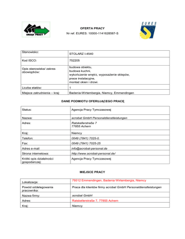 OFERTA PRACY Nr ref. EURES: 10000-1141628567