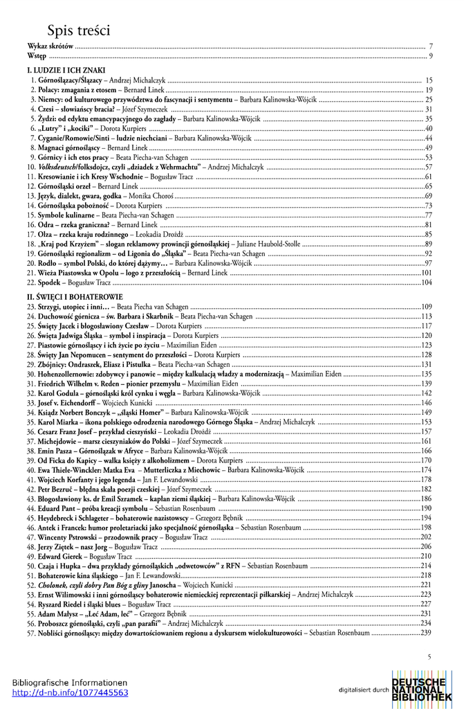Spis treści Wykaz s b ó tó w ........................................................................................................................................................................................................... 7 Wstęp ............................................................................................................................................................................................................................ 9 1· LUDZIE I ICH ZNAKI 1. Gornoslązacy/Slązacy - Andrzej Michalczyk................................................................................................................................................... 15 2. Polacy: zmagania z etosem - Bernard Linek..................................................................................................................................................... 19 3. Niemcy: od kulturowego przywództwa do fascynacji i sentymentu - Barbara Kalinowska-Wojcik............................................................25 4. Czesi - słowiańscy bracia? - Józef ................................................................................................................................................. 31 5. Zydzi: od edyktu emancypacyjnego do zagłady-Barbara K alinow skalojcik............................................................................................ 35 6. „Lutry ,1 , , kociki’, - Dorota Kurpiers ................................................................................................................................................................40 7. Cyganie/Romowie/٥inti - ludzie niechciani - Barbara K alinow skalojcik.................................................................................................. 44 8. Magnaci górnośląscy - Bernard Linek................................................................................................................................................................49 9. uornicy 1 ich etos pracy - Beata Piecha-van Schagen....................................................................................................................................... ว3 10. VolksdeutschlĩohÀoịai czyli „dziadek z Wehrmachtu” - Andrzej Michalczyk........................................................................................... 11· Kresowianie 1 ich Kresy Wschodnie - Bogusiaw Tracz....................................................................................................................................ช 1 12. bornosląski orzeł - Bernard Linek..................................................................................................................................................................... 65 13. Język, dialekt, gwara,godkä - Monika Choros................................................................................................................................................ 69 14. uornosląska pobożność —Dorota Kurpiers ......................................................................................................................................................73 15. Symbole kulinarne - Beata Piecha-van Schagen............................................................................................................................................... 77 16. Odra —rzeka graniczna? - Bernara Linek 17. Olza - rzeka kraju rodzinnego - Leokadia Drożdż.......................................................................................................................................... 85 18. , , Kraj pod Krzyżem,١- slogan reklamom▽ prowincji górnośląskiej - Juliane Haubold-Stolle...................................................................89 19. bornosląski regionalizm - od Ligonia do „Śląska” - Beata Piecha-van Schagen .......................................................................................... 92 20. Rodio - symbol Polski,do której dążymy... - Barbara KalinowskaWójcik.................................................................................................. 97 21. Wieża Piastowska w Opolu —logo z przeszłością —Bernard L inek..............................................................................................................101 22. Spodek - Bogusiaw Tracz................................................................................................................................................................................... 104 11. ŚWIĘCI I B O H A T E R _ E 23. Strzygi,utopiec 1 inni··· - Beata Piecha van Schagen......................................................................................................................................109 24. Duchowosc górnicza - sw. Barbara i Skarbnik - Beata Piecha-van Schagen ................................................................................................ 113 25. Święty Jacek i błogosławiony Czesław - Dorota Kurpiers .............................................................................................................................11 / 26. Święta Jaawiga śląska - symbol 1 inspiracja - Dorota Kurpiers.................................................................................................................... 120 2/. Piastowie gornosl^cynch Zycie po życiu - Maximilian E iden..................................................................................................................... 123 28. Święty Jail Nepomucen —sentyment do przeszłości —Dorota Kurpiers....................................................................................................... 128 29. Zbójnicy: Ondraszek, Eliasz i Pistulka - Beata Piecha-van Schagen..............................................................................................................131 30. Hohenzollernowie ؛zdobywcy i panowie —między kalkulacją władzy a modernizacją - Maximilian Eiden.........................
