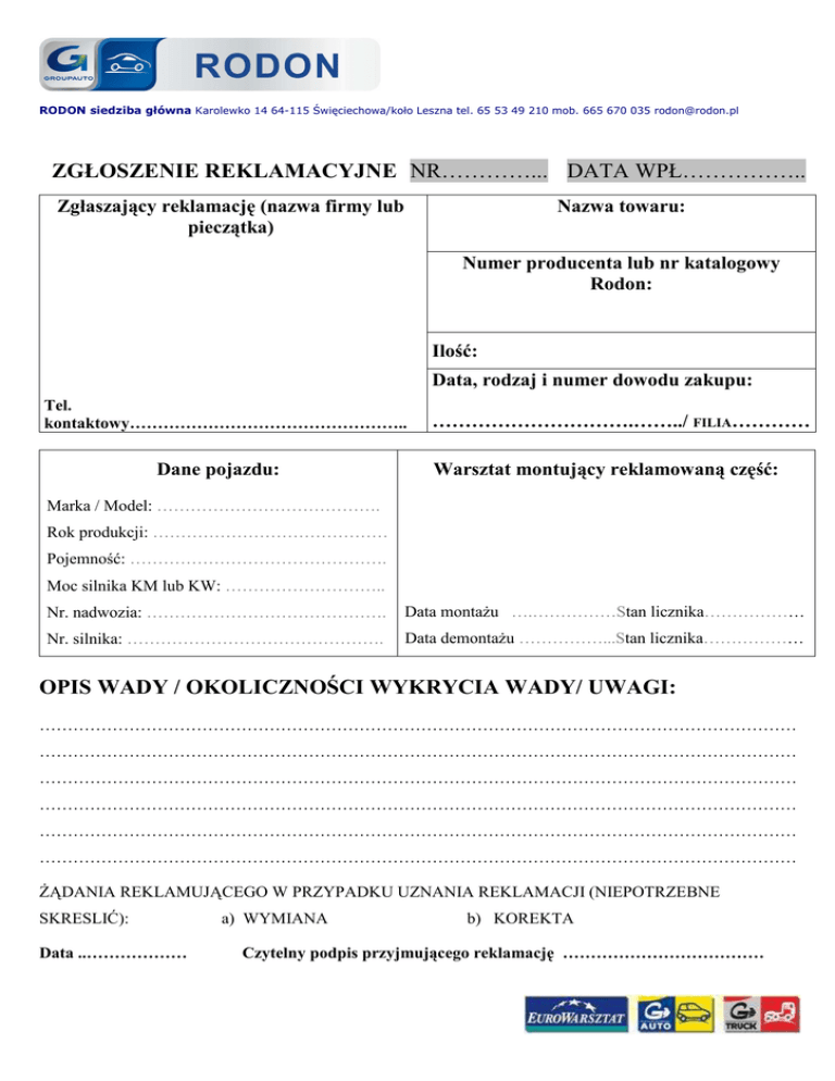 RODON siedziba główna Karolewko 14 64-115 Święciechowa/koło Leszna tel. 65 53 49 210 mob. 665 670 035 [email protected] ZGŁOSZENIE REKLAMACYJNE NR…………... DATA WPŁ…………….. Zgłaszający reklamację (nazwa firmy lub pieczątka) Nazwa towaru: Numer producenta lub nr katalogowy Rodon: Ilość: Data, rodzaj i numer dowodu zakupu: Tel. kontaktowy………………………………………….. Dane pojazdu: ………………………….……../ FILIA………… Warsztat montujący reklamowaną część: Marka / Model: …………………………………. Rok produkcji: …………………………………… Pojemność: ………………………………………. Moc silnika KM lub KW: ……………………….. Nr. nadwozia: ……………………………………. Data montaŜu ….……………Stan licznika……………… Nr. silnika: ………………………………………. Data demontaŜu ……………...Stan licznika……………… OPIS WADY / OKOLICZNOŚCI WYKRYCIA WADY/ UWAGI: ……………………………………………………………………………………………………………………… ……………………………………………………………………………………………………………………… ……………………………………………………………………………………………………………………… ……………………………………………………………………………………………………………………… ……………………………………………………………………………………………………………………… ……………………………………………………………………………………………………………………… śĄDANIA REKLAMUJĄCEGO W PRZYPADKU UZNANIA REKLAMACJI (NIEPOTRZEBNE SKRESLIĆ): Data ..……………… a) WYMIANA b) KOREKTA Czytelny podpis przyjmującego reklamację ………………………………