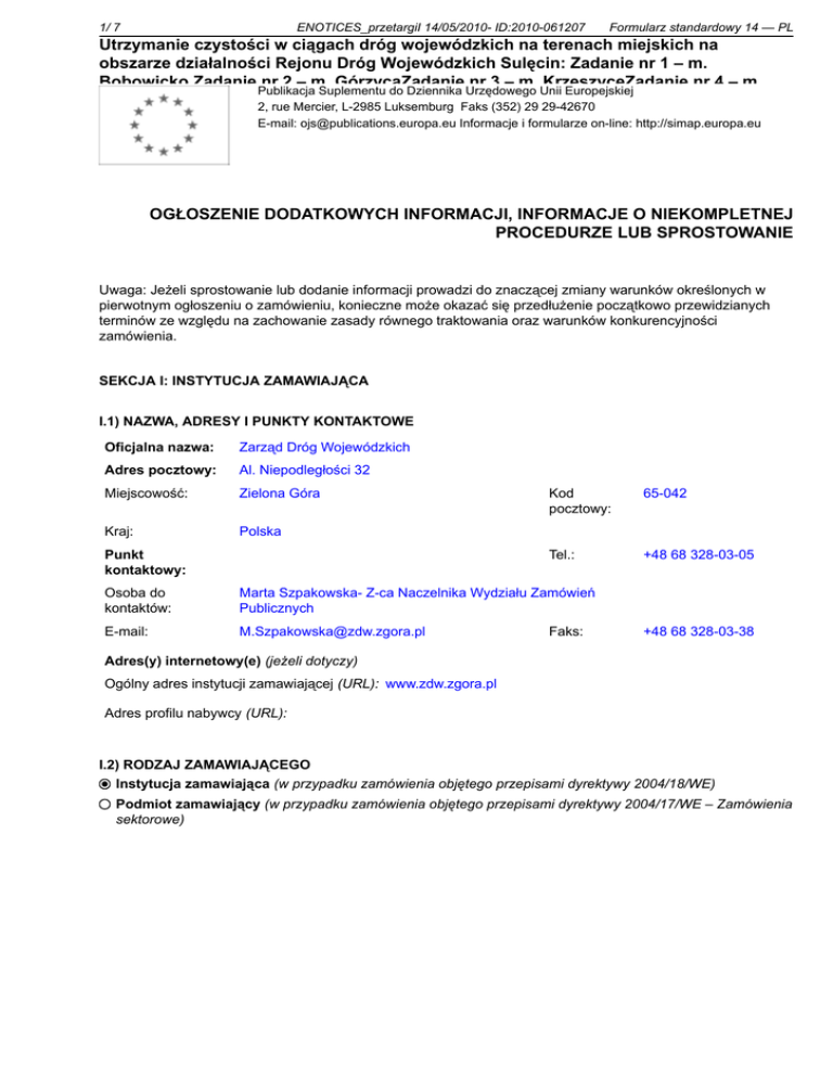1/ 7 ENOTICES_przetargiI 14/05/2010- ID:2010-061207 Formularz standardowy 14 — PL Utrzymanie czystości w ciągach dróg wojewódzkich na terenach miejskich na obszarze działalności Rejonu Dróg Wojewódzkich Sulęcin: Zadanie nr 1 – m. Bobowicko Zadanie nr 2 – m. GórzycaZadanie nr 3 – m. KrzeszyceZadanie nr 4 – m. Publikacja Suplementu do Dziennika Urzędowego Unii Europejskiej LubniewiceZadanie 2, nrrue 5 Mercier, – m. MiędzyrzeczZadanie nr 6Ośno LubuskieZadanie nr 7 L-2985 Luksemburg Faks (352) 29 m. 29-42670 – m. RzepinZadanie E-mail: nr 8 –[email protected] m. SulęcinZadanie Informacje nr 9 – m. Torzymon-line: http://simap.europa.eu i formularze OGŁOSZENIE DODATKOWYCH INFORMACJI, INFORMACJE O NIEKOMPLETNEJ PROCEDURZE LUB SPROSTOWANIE Uwaga: Jeżeli sprostowanie lub dodanie informacji prowadzi do znaczącej zmiany warunków określonych w pierwotnym ogłoszeniu o zamówieniu, konieczne może okazać się przedłużenie początkowo przewidzianych terminów ze względu na zachowanie zasady równego traktowania oraz warunków konkurencyjności zamówienia. SEKCJA I: INSTYTUCJA ZAMAWIAJĄCA I.1) NAZWA, ADRESY I PUNKTY KONTAKTOWE Oficjalna nazwa: Zarząd Dróg Wojewódzkich Adres pocztowy: Al. Niepodległości 32 Miejscowość: Zielona Góra Kraj: Polska Punkt kontaktowy: Kod pocztowy: 65-042 Tel.: +48 68 328-03-05 Osoba do kontaktów: Marta Szpakowska- Z-ca Naczelnika Wydziału Zamówień Publicznych E-mail: [email protected] Faks: +48 68 328-03-38 Adres(y) internetowy(e) (jeżeli dotyczy) Ogólny adres instytucji zamawiającej (URL): www.zdw.zgora.pl Adres profilu nabywcy (URL): I.2) RODZAJ ZAMAWIAJĄCEGO Instytucja zamawiająca (w przypadku zamówienia objętego przepisami dyrektywy 2004/18/WE) Podmiot zamawiający (w przypadku zamówienia objętego przepisami dyrektywy 2004/17/WE – Zamówienia sektorowe) 2/ 7 ENOTICES_przetargiI 14/05/2010- ID:2010-061207 Formularz standardowy 14 — PL Utrzymanie czystości w ciągach dróg wojewódzkich na terenach miejskich na obszarze działalności Rejonu Dróg Wojewódzkich Sulęcin: Zadanie nr 1 – m. Bobowicko Zadanie nr 2 – m. GórzycaZadanie nr 3 – m. KrzeszyceZadanie nr 4 – m. SEKCJA II: PRZEDMIOT ZAMÓWIENIA LubniewiceZadanie nr 5 – m. MiędzyrzeczZadanie nr 6- m. Ośno LubuskieZadanie nr 7 – m. RzepinZadanie nr 8 – m. SulęcinZadanie nr 9 – m. Torzym II.1) OPIS II.1.1) Nazwa nadana zamówieniu przez instytucję zamawiającą (podano w pierwotnym ogłoszeniu) Utrzymanie czystości w ciągach dróg wojewódzkich na terenach miejskich na obszarze działalności Rejonu Dróg Wojewódzkich Sulęcin: Zadanie nr 1 – m. Bobowicko Zadanie nr 2 – m. GórzycaZadanie nr 3 – m. KrzeszyceZadanie nr 4 – m. LubniewiceZadanie nr 5 – m. MiędzyrzeczZadanie nr 6- m. Ośno LubuskieZadanie nr 7 – m. RzepinZadanie nr 8 – m. SulęcinZadanie nr 9 – m. Torzym II.1.2) Krôtki opis (podano w pierwotnym ogłoszeniu) Zadanie nr 1 – miejscowość Bobowicko Utrzymanie w ciągłej czystości nawierzchni poprzez mechaniczne zamiatanie pasa jezdni o szer. 1,0m przy krawężnikach ( obustronnie) jeden raz w miesiącu. Utrzymanie w ciągłej czystości pasa drogowego dróg wojewódzkich poprzez usuwanie papierów, puszek, butelek, liści i innych zanieczyszczeń, jeden raz w tygodniu. Wywóz i utylizacja wszystkich nieczystości pozyskanych w trakcie utrzymania czystości. Utrzymania czystości w pasie zieleni i obrębie drzew przydrożnych poprzez: koszenie traw i chwastów wraz z wygrabieniem liści i wywiezieniem skoszonej trawy. Utrzymanie w czystości osadników studzienek kanalizacji deszczowej poprzez oczyszczanie osadników z piasku, liści i innych zanieczyszczeń Usuwanie chwastów i traw wzdłuż krawężników Zadanie nr 2 – miejscowość Górzyca Utrzymanie w ciągłej czystości nawierzchni poprzez mechaniczne zamiatanie pasa jezdni o szer. 1,0m przy krawężnikach ( obustronnie) jeden raz w miesiącu. Utrzymanie w ciągłej czystości pasa drogowego dróg wojewódzkich poprzez usuwanie papierów, puszek, butelek, liści i innych zanieczyszczeń, jeden raz w tygodniu. Wywóz i utylizacja wszystkich nieczystości pozyskanych w trakcie utrzymania czystości. Utrzymania czystości w pasie zieleni i obrębie drzew przydrożnych poprzez: koszenie traw i chwastów wraz z wygrabieniem liści i wywiezieniem skoszonej trawy. Utrzymanie w czystości osadników studzienek kanalizacji deszczowej poprzez oczyszczanie osadników z piasku, liści i innych zanieczyszczeń Usuwanie chwastów i traw wzdłuż krawężników Zadanie nr 3 – miejscowość Krzeszyce Utrzymanie w ciągłej czystości nawierzchni poprzez mechaniczne zamiatanie pasa jezdni o szer. 1,0m przy krawężnikach ( obustronnie) jeden raz w miesiącu. Utrzymanie w ciągłej czystości pasa drogowego dróg wojewódzkich poprzez usuwanie papierów, puszek, butelek, liści i innych zanieczyszczeń, jeden raz w tygodniu. Wywóz i utylizacja wszystkich nieczystości pozyskanych w trakcie utrzymania czystości. Utrzymania czystości w pasie zieleni i obrębie drzew przydrożnych poprzez: koszenie traw i chwastów wraz z wygrabieniem liści i wywiezieniem skoszonej trawy. Utrzymanie w czystości osadników studzienek kanalizacji deszczowej poprzez oczyszczanie osadników z piasku, liści i innych zanieczyszczeń Usuwanie chwastów i traw wzdłuż krawężników Zadanie nr 4 – miejscowość Lubniewice Utrzymanie w ciągłej czystości nawierzchni poprzez mechaniczne zamiatanie pasa jezdni o szer. 1,0m przy krawężnikach ( obustronnie) dwa razy w miesiącu. Utrzymanie w ciągłej czystości pasa drogowego dróg wojewódzkich poprzez usuwanie papierów, puszek, butelek, liści i innych zanieczyszczeń, jeden raz w tygodniu. Wywóz i utylizacja wszystkich nieczystości pozyskanych w trakcie utrzymania czystości. Utrzymania czystości w pasie zieleni i obrębie drzew przydrożnych poprzez: a) koszenie traw i chwastów wraz z wygrabieniem liści i wywiezien