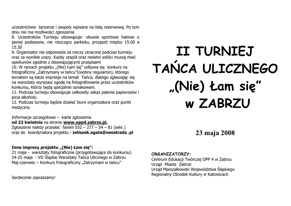 uczestnictwie tancerze i zespoły wpisane na listę rezerwową. Po tym dniu nie ma moŜliwości zgłoszenia 8. Uczestników Turnieju obowiązuje: obuwie sportowe halowe o jasnej podeszwie, nie niszczące parkietu, przyjazd między 15.00 a 15.30 9. Organizator nie odpowiada za rzeczy utracone podczas turnieju oraz za wynikłe urazy. KaŜdy zespół oraz nieletni soliści muszą mieć opiekunów zgodnie z obowiązującymi przepisami 10. W ramach projektu „(Nie) Łam się” odbywa się konkurs na fotograficzny „Zatrzymany w tańcu”(osobny regulamin), którego tematem są takŜe impresje na temat Tańca, dlatego zgłaszając się na warsztaty wyraŜasz zgodę na fotografowanie przez uczestników konkursu, którzy będą specjalnie oznakowani. 11. Podczas turnieju obowiązuje całkowity zakaz palenia papierosów i picia alkoholu 12. Podczas turnieju będzie działać biuro organizatora oraz punkt medyczny Informacje szczegółowe – karta zgłoszenia od 22 kwietnia na stronie www.opp4.zabrze.pl, Zgłoszenie naleŜy przesłać faxem 032 – 277 – 54 – 81 (sekr.) oraz do koordynatora projektu - zeliszek.agata@neostrada .pl Inne imprezy projektu „(Nie) Łam się”: 21 maja - warsztaty fotograficzne (przygotowujące do konkursu) 24-25 maja - VII Śląskie Warsztaty Tańca Ulicznego w Zabrzu Maj-czerwiec – Konkurs Fotograficzny „Zatrzymani w tańcu” Serdecznie zapraszamy! II TURNIEJ TAŃCA ULICZNEGO „(Nie) Łam się” w ZABRZU 23 maja 2008 ORGANIZATORZY: Centrum Edukacji Twórczej OPP 4 w Zabrzu Urząd Miasta Zabrze Urząd Marszałkowski Województwa Śląskiego Regionalny Ośrodek Kultury w Katowicach Regulamin 1. Impreza ma charakter konkursowy, adresowana jest do tanecznych grup młodzieŜowych i solistów z województwa śląskiego - wiek uczestników 13-24 lat 2. Konkurs odbywać się będzie w Sali gimnastycznej Centrum Edukacji w Zabrzu (wejście od ul. De Gaulle’a – obok Domu Muzyki i Tańca w Zabrzu) w godz. 16.oo – 19.oo 3. Turniej rozgrywany będzie w następujących kategoriach: - formacje hip hop – zespoły min. 6 osobowe, przedstawiają choreografię 3-4 min., w której dominują style hip hop (old school, New style, New age) moŜna teŜ włączyć funky jazz, dancehall, house, electric boogie i break dance itd.- muzyka własna - formacje street dance – zespoły min. 6 osobowe, przedstawiają choreografię 2-5 min. w której mogą być zawarte wszystkie style uliczne, a hip hop i jego odmiany nie występują lub nie są dominujące- muzyka własna Kryteria oceny formacji: - oryginalność choreografii i dobór muzyki, - technika wykonania i poziom trudności elementów - wraŜenie artystyczne - solo hip hop – soliści w eliminacjach prezentują się po 4 osoby jednocześnie do muzyki organizatora, jury wybiera 8 lub 4 osoby (w zaleŜności od ilości zgłoszeń) które walczą systemem 1 x 1 aŜ do finału – muzyka organizatora - solo street dance improvisation (po raz pierwszy w Polsce) – adresowany do wszechstronnych tancerzy z duŜym doświadczeniem, odwaŜnych i lubiących wyzwania muzyczne, soliści prezentują się w walkach 1x1, losują przygotowaną przez DJ muzykę w jednym stylu ( Ok. 2 min. ) i prezentują się obaj na zasadzie walki do tej samej muzyki (cały zakres muzyki „ulicznej” –wszystkie odmiany hip hop, funk, house, dancehall, r&b itd.) Kryteria oceny solistów: - osobowość i oryginalność stylu - inwencja w interpretacji muzyki - technika wykonania, poziom trudności elementów - wraŜenie artystyczne - wszechstronność stylowa (solo street dance) 4. Zmagania tancerzy oceniać będzie jury w składzie: Robert Nieznański – Włocławek Sebastian Krupa – Łódź Zofia Dąbrowska – Gliwice Wszyscy to doświadczeni tancerze, choreografowie, nauczyciele tańca – wykładowcy warsztatów tanecznych, które odbędą się w dniach następnych. 5. Wszystkie zespoły i soliści otrzymają pamiątkowe dyplomy, laureaci pierwszych trzech miejsc otrzymują nagrody pienięŜne lub rzeczowe 6. Akredytacja za udział w Turnieju wynosi 5 zł od tancerza (jedna kategoria) lub 8 zł (więcej niŜ jedna kategorie). NaleŜy ją wpłacić do 16 maja 2008 na konto organizatora nr 50 1060 0076 0000 4213 0000 1560 z dopiskiem turniej tańca „(Nie) Łam się” – nazwa zespołu i ilość tancerzy / nazwiska solistów”. Brak wpłaty powoduje skreślenie zgłoszonych wcześniej zespołów i solistów z listy startowej i umieszczenie na niej rezerwowych (o czym wykonawcy zostaną powiadomieni mailowo lub telefonicznie) 7. Liczba uczestników turnieju jest ograniczona czasem. Przyjęcie zgłoszenia zostanie potwierdzone mailem lub telefonicznie po otrzymaniu akredytacji, dnia 19 maja zostaną powiadomieni o