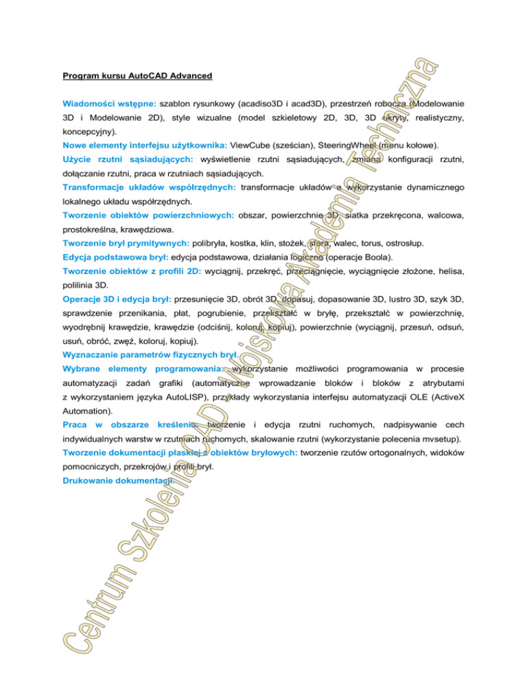 Program kursu AutoCAD Advanced Wiadomości wstępne: szablon rysunkowy (acadiso3D i acad3D), przestrzeń robocza (Modelowanie 3D i Modelowanie 2D), style wizualne (model szkieletowy 2D, 3D, 3D ukryty, realistyczny, koncepcyjny). Nowe elementy interfejsu użytkownika: ViewCube (sześcian), SteeringWheel (menu kołowe). Użycie rzutni sąsiadujących: wyświetlenie rzutni sąsiadujących, zmiana konfiguracji rzutni, dołączanie rzutni, praca w rzutniach sąsiadujących. Transformacje układów współrzędnych: transformacje układów a wykorzystanie dynamicznego lokalnego układu współrzędnych. Tworzenie obiektów powierzchniowych: obszar, powierzchnie 3D, siatka przekręcona, walcowa, prostokreślna, krawędziowa. Tworzenie brył prymitywnych: polibryła, kostka, klin, stożek, sfera, walec, torus, ostrosłup. Edycja podstawowa brył: edycja podstawowa, działania logiczne (operacje Boola). Tworzenie obiektów z profili 2D: wyciągnij, przekręć, przeciągnięcie, wyciągnięcie złożone, helisa, polilinia 3D. Operacje 3D i edycja brył: przesunięcie 3D, obrót 3D, dopasuj, dopasowanie 3D, lustro 3D, szyk 3D, sprawdzenie przenikania, płat, pogrubienie, przekształć w bryłę, przekształć w powierzchnię, wyodrębnij krawędzie, krawędzie (odciśnij, koloruj, kopiuj), powierzchnie (wyciągnij, przesuń, odsuń, usuń, obróć, zwęź, koloruj, kopiuj). Wyznaczanie parametrów fizycznych brył. Wybrane elementy programowania: wykorzystanie możliwości programowania w procesie automatyzacji zadań grafiki (automatyczne wprowadzanie bloków i bloków z atrybutami z wykorzystaniem języka AutoLISP), przykłady wykorzystania interfejsu automatyzacji OLE (ActiveX Automation). Praca w obszarze kreślenia: tworzenie i edycja rzutni ruchomych, nadpisywanie cech indywidualnych warstw w rzutniach ruchomych, skalowanie rzutni (wykorzystanie polecenia mvsetup). Tworzenie dokumentacji płaskiej z obiektów bryłowych: tworzenie rzutów ortogonalnych, widoków pomocniczych, przekrojów i profili brył. Drukowanie dokumentacji.