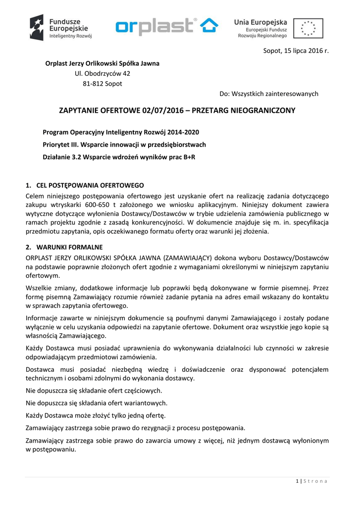 Sopot, 15 lipca 2016 r. Orplast Jerzy Orlikowski Spółka Jawna Ul. Obodrzyców 42 81-812 Sopot Do: Wszystkich zainteresowanych ZAPYTANIE OFERTOWE 02/07/2016 – PRZETARG NIEOGRANICZONY Program Operacyjny Inteligentny Rozwój 2014-2020 Priorytet III. Wsparcie innowacji w przedsiębiorstwach Działanie 3.2 Wsparcie wdrożeń wyników prac B+R 1. CEL POSTĘPOWANIA OFERTOWEGO Celem niniejszego postępowania ofertowego jest uzyskanie ofert na realizację zadania dotyczącego zakupu wtryskarki 600-650 t założonego we wniosku aplikacyjnym. Niniejszy dokument zawiera wytyczne dotyczące wyłonienia Dostawcy/Dostawców w trybie udzielenia zamówienia publicznego w ramach projektu zgodnie z zasadą konkurencyjności. W dokumencie znajduje się m. in. specyfikacja przedmiotu zapytania, opis oczekiwanego formatu oferty oraz warunki jej złożenia. 2. WARUNKI FORMALNE ORPLAST JERZY ORLIKOWSKI SPÓŁKA JAWNA (ZAMAWIAJĄCY) dokona wyboru Dostawcy/Dostawców na podstawie poprawnie złożonych ofert zgodnie z wymaganiami określonymi w niniejszym zapytaniu ofertowym. Wszelkie zmiany, dodatkowe informacje lub poprawki będą dokonywane w formie pisemnej. Przez formę pisemną Zamawiający rozumie również zadanie pytania na adres email wskazany do kontaktu w sprawach zapytania ofertowego. Informacje zawarte w niniejszym dokumencie są poufnymi danymi Zamawiającego i zostały podane wyłącznie w celu uzyskania odpowiedzi na zapytanie ofertowe. Dokument oraz wszystkie jego kopie są własnością Zamawiającego. Każdy Dostawca musi posiadać uprawnienia do wykonywania działalności lub czynności w zakresie odpowiadającym przedmiotowi zamówienia. Dostawca musi posiadać niezbędną wiedzę i doświadczenie oraz dysponować potencjałem technicznym i osobami zdolnymi do wykonania dostawcy. Nie dopuszcza się składanie ofert częściowych. Nie dopuszcza się składania ofert wariantowych. Każdy Dostawca może złożyć tylko jedną ofertę. Zamawiający zastrzega sobie prawo do rezygnacji z procesu postępowania. Zamawiający zastrzega sobie prawo do zawarcia umowy z więcej, niż jednym dostawcą wyłonionym w postępowaniu. 1|S t r o n a Zaoferowana wtryskarka musi być fabrycznie nowe. Oferowana wtryskarka musi posiadać gwarancję na minimum 12 miesięcy od daty dostawy wtryskarki do Zamawiającego. Wszelkie koszty przygotowania i dostarczenia oferty ponosi Oferent. Każdy z Oferentów otrzyma informację o rozstrzygnięciu, wstrzymaniu lub odstąpieniu od postępowania. 3. INFORMACJA NA TEMAT ZAKRESU WYKLUCZENIA W celu uniknięcia konfliktu interesów, w postępowaniu nie mogą brać udziału podmioty powiązane z ORPLAST JERZY ORLIKOWSKI SPÓŁKA JAWNA osobowo lub kapitałowo. Przez powiązania kapitałowe lub osobowe rozumie się wzajemne powiązania między Zamawiającym lub osobami upoważnionymi do zaciągania zobowiązań w imieniu Zamawiającego lub osobami wykonującymi w imieniu Zamawiającego czynności związane z przygotowaniem i przeprowadzeniem procedury wyboru wykonawcy a wykonawcą, polegające w szczególności na: a) uczestniczeniu w spółce jako wspólnik spółki cywilnej lub spółki osobowej, b) posiadaniu co najmniej 10 % udziałów lub akcji, c) pełnieniu funkcji członka organu nadzorczego lub zarządzającego, prokurenta, pełnomocnika, d) pozostawaniu w związku małżeńskim, w stosunku pokrewieństwa lub powinowactwa w linii prostej, pokrewieństwa drugiego stopnia lub powinowactwa drugiego stopnia w linii bocznej lub w stosunku przysposobienia, opieki lub kurateli. Udzielenie zamówienia podmiotowi powiązanemu jest naruszeniem zasady konkrecyjności. 4. FORMAT OFERTY Oferta powinna być sporządzona w języku polskim. Oferta musi zawierać wycenę oraz opis oferowanej wtryskarki zgodny ze specyfikacją wymogów technicznych zapytania. Wycena powinna być dokonana w cenach netto w złotych polskich. Zamawiający dopuszcza składanie ofert również w euro oraz dolarach amerykańskich. Jeśli ceny na ofercie będą wyrażone w innej walucie niż złoty polski to podczas wyboru najkorzystniejszej oferty będą one przeliczane przy zastosowaniu średniego kursu sprzedaży ogłaszanego przez NBP, obowiązującego w ostatnim dniu roboczym poprzedzającym dzień dokonywania wyboru. Oferta musi zostać sporządzona na czytelnie wypełnionym i podpisanym formularzu ofertowym stanowiącym Załącznik nr 1 do niniejszego zapytania. W ofercie należy wskazać okres przyznawanej gwarancji na przedmiot zapytania ofertowego oraz warunki płatności. W ofercie należy wskazać termin ważności oferty (minimum 90 dni) i dane osoby kontaktowej. Oferty złożone po terminie nie będą brane pod uwagę. Do oceny ofert brane będą pod uwagę tylko oferty spełniające w całości wymagania określone w zapytaniu. Zamawiający posiada prawo do odrzucenia oferty, jeśli oferta jest niekompletna lub niezgodna z zapytaniem. 2|S t r o n a 5. TERMIN ORAZ SPOSÓB SKŁADANIA OFERT Oferty prosimy składać pocztą elektroniczną na podany adres e-mail, w pliku zabezpieczonym przed edycją np. PDF lub opcjonalnie w 1 egzemplarzu papierowym do dnia 12-09-2016 r. do godziny 12:00. ORPLAST JERZY ORLIKOWSKI SPÓŁKA JAWNA UL. OBODRZYCÓW 42 81-812 SOPOT [email protected] Dodatkowych wyjaśnień w sprawie postępowania udzielać będzie: Jerzy Orlikowski tel. +48 602 216 869 mail: [email protected] Dostawca przed upływem terminu do składania ofert ma prawo: wycofać ofertę poprzez złożenie pisemnego powiadomienia drogą opisaną dla składania ofert, zmienić ofertę - powiadomienie o wprowadzeniu zmian musi być złożone wg takich samych zasad jak składana oferta, odpowiednio oznakowanych z dopiskiem „ZAMIANA”. 6. KRYTERIA OCENY OFERTY, INFORMACJA O WAGACH PROCENTOWYCH ORAZ SPOSÓB PRZYZNAWANIA PUNKTACJI Przy wyborze oferty Zamawiający będzie kierował się następującymi kryteriami: 1. Cena oferty netto [Co] - 50% 2. Termin dostawy [Td] - 20% 3. Prędkość maksymalna wtrysku [