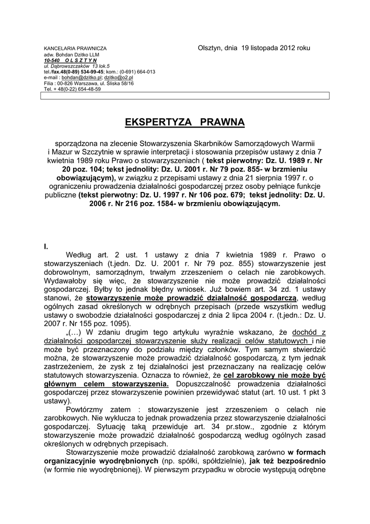 KANCELARIA PRAWNICZA adw. Bohdan Dzitko LLM 10-540 O L S Z T Y N ul. Dąbrowszczaków 13 lok.5 tel./fax.48(0-89) 534-99-45; kom.: (0-691) 664-013 e-mail : [email protected]; [email protected] Filia : 00-826 Warszawa, ul. Śliska 58/16 Tel. + 48(0-22) 654-48-59 Olsztyn, dnia 19 listopada 2012 roku EKSPERTYZA PRAWNA sporządzona na zlecenie Stowarzyszenia Skarbników Samorządowych Warmii i Mazur w Szczytnie w sprawie interpretacji i stosowania przepisów ustawy z dnia 7 kwietnia 1989 roku Prawo o stowarzyszeniach ( tekst pierwotny: Dz. U. 1989 r. Nr 20 poz. 104; tekst jednolity: Dz. U. 2001 r. Nr 79 poz. 855- w brzmieniu obowiązującym), w związku z przepisami ustawy z dnia 21 sierpnia 1997 r. o ograniczeniu prowadzenia działalności gospodarczej przez osoby pełniące funkcje publiczne (tekst pierwotny: Dz. U. 1997 r. Nr 106 poz. 679; tekst jednolity: Dz. U. 2006 r. Nr 216 poz. 1584- w brzmieniu obowiązującym. I. Według art. 2 ust. 1 ustawy z dnia 7 kwietnia 1989 r. Prawo o stowarzyszeniach (t.jedn. Dz. U. 2001 r. Nr 79 poz. 855) stowarzyszenie jest dobrowolnym, samorządnym, trwałym zrzeszeniem o celach nie zarobkowych. Wydawałoby się więc, że stowarzyszenie nie może prowadzić działalności gospodarczej. Byłby to jednak błędny wniosek. Już bowiem art. 34 zd. 1 ustawy stanowi, że stowarzyszenie może prowadzić działalność gospodarczą, według ogólnych zasad określonych w odrębnych przepisach (przede wszystkim według ustawy o swobodzie działalności gospodarczej z dnia 2 lipca 2004 r. (t.jedn.: Dz. U. 2007 r. Nr 155 poz. 1095). „(…) W zdaniu drugim tego artykułu wyraźnie wskazano, że dochód z działalności gospodarczej stowarzyszenie służy realizacji celów statutowych i nie może być przeznaczony do podziału między członków. Tym samym stwierdzić można, że stowarzyszenie może prowadzić działalność gospodarczą, z tym jednak zastrzeżeniem, że zysk z tej działalności jest przeznaczany na realizację celów statutowych stowarzyszenia. Oznacza to również, że cel zarobkowy nie może być głównym celem stowarzyszenia. Dopuszczalność prowadzenia działalności gospodarczej przez stowarzyszenie powinien przewidywać statut (art. 10 ust. 1 pkt 3 ustawy). Powtórzmy zatem : stowarzyszenie jest zrzeszeniem o celach nie zarobkowych. Nie wyklucza to jednak prowadzenia przez stowarzyszenie działalności gospodarczej. Sytuację taką przewiduje art. 34 pr.stow., zgodnie z którym stowarzyszenie może prowadzić działalność gospodarczą według ogólnych zasad określonych w odrębnych przepisach. Stowarzyszenie może prowadzić działalność zarobkową zarówno w formach organizacyjnie wyodrębnionych (np. spółki, spółdzielnie), jak też bezpośrednio (w formie nie wyodrębnionej). W pierwszym przypadku w obrocie występują odrębne od stowarzyszenia podmioty, np. spółki handlowe, spółdzielnie, w których stowarzyszenie ma udziały i akcje. Sytuacja taka jednak Stow.Skarb.Sam. WiM nie dotyczy, natomiast mamy do czynienia z działalnością działalności nie wyodrębnioną kiedy w obrocie występuje samo stowarzyszenie. Prowadzenie działalności gospodarczej przez stowarzyszenie odbywa się według ogólnych zasad określonych w odrębnych przepisach. Są to w wypadku działalności nie wyodrębnionej np. przepisy ustawy z 2 lipca 2004 r. o swobodzie działalności gospodarczej i ustawy o Krajowym Rejestrze Sądowym, w wypadku działalności organizacyjnie wyodrębnionej - również przepisy ustrojowe określające strukturę i funkcjonowanie określonych podmiotów (np. Kodeks spółek handlowych, Prawo spółdzielcze). Są to także przepisy prawa administracyjnego, podatkowego, celnego. Sporne było w orzecznictwie, czy stowarzyszenie prowadzące działalność gospodarczą było podmiotem gospodarczym (przedsiębiorcą) w rozumieniu ustawy z 23 grudnia 1988 r. o działalności gospodarczej. W wyrokach z 25 listopada 1993 r., SA/Po 1844/93, i z 24 marca 1994 r., SA/P. 1851/93, Naczelny Sąd Administracyjny przyjął, że stowarzyszenia nie były podmiotami prowadzącymi działalność gospodarczą w rozumieniu art. 2 ust. 2 ustawy z 23 grudnia 1988 r. o działalności gospodarczej. Stanowisko to zostało zakwestionowane w glosie do drugiego z wyroków. Sąd Najwyższy zajął odmienne stanowisko. W uzasadnieniu postanowienia z 19 czerwca 1996 r., III CZP 66/96, uznał, że stowarzyszenia prowadzące działalność gospodarczą były podmiotami gospodarczymi mającymi zdolność upadłościową. Po wejściu w życie ustawy z 19 listopada 1999 r. - Prawo działalności gospodarczej oraz ustawy z 20 sierpnia 1997 r. o Krajowym Rejestrze Sądowym nie można mieć wątpliwości, że stowarzyszenia prowadzące działalność gospodarczą, w zakresie tej działalności, były przedsiębiorcami w rozumieniu tych ustaw. Tak też jest w przypadku Stow.Skarb.Sam. WiM. Artykuł 2 Prawa działalności gospodarczej definiował przedsiębiorcę jako osobę fizyczną, osobę prawną oraz nie mającą osobowości prawnej spółkę prawa handlowego, zawodowo, we własnym imieniu podejmującą i wykonującą działalność gospodarczą, przez którą rozumie się zarobkową działalność wytwórczą, handlową, budowlaną, usługową oraz poszukiwanie, rozpoznawanie i eksploatację zasobów naturalnych, wykonywaną w sposób zorganizowany i ciągły. Za przedsiębiorcę uznano zarówno podmioty prowadzące działalność gospodarczą jako działalność główną, jak i te, dla których była to działalność uboczna. Definicję powyższą utrzymano w ustawie z 2 lipca 2004 r. o swobodzie działalności gospodarczej. Określono w niej, że przedsiębiorcą w rozumieniu ustawy jest osoba fizyczna, osoba prawna i jednostka organizacyjna nie będąca osobą prawną, której odrębna ustawa przyznaje zdolność prawną - wykonująca we własnym imieniu działalność gospodarczą, przez którą rozumie się zarobkową działalność wytwórcz