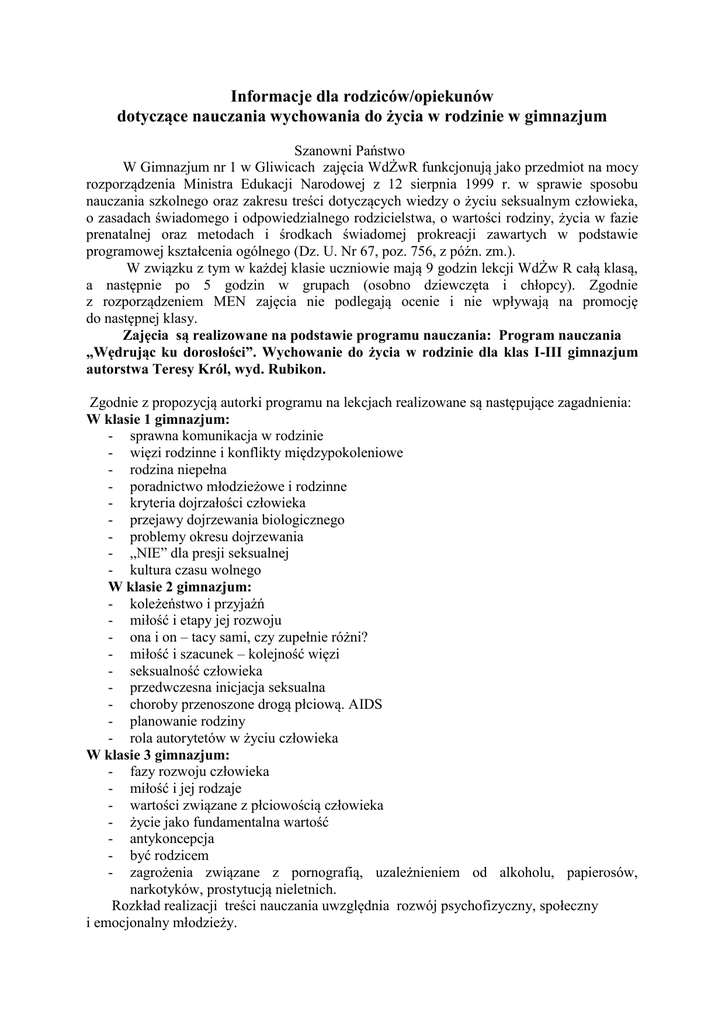 Informacje dla rodziców/opiekunów dotyczące nauczania wychowania do życia w rodzinie w gimnazjum Szanowni Państwo W Gimnazjum nr 1 w Gliwicach zajęcia WdŻwR funkcjonują jako przedmiot na mocy rozporządzenia Ministra Edukacji Narodowej z 12 sierpnia 1999 r. w sprawie sposobu nauczania szkolnego oraz zakresu treści dotyczących wiedzy o życiu seksualnym człowieka, o zasadach świadomego i odpowiedzialnego rodzicielstwa, o wartości rodziny, życia w fazie prenatalnej oraz metodach i środkach świadomej prokreacji zawartych w podstawie programowej kształcenia ogólnego (Dz. U. Nr 67, poz. 756, z późn. zm.). W związku z tym w każdej klasie uczniowie mają 9 godzin lekcji WdŻw R całą klasą, a następnie po 5 godzin w grupach (osobno dziewczęta i chłopcy). Zgodnie z rozporządzeniem MEN zajęcia nie podlegają ocenie i nie wpływają na promocję do następnej klasy. Zajęcia są realizowane na podstawie programu nauczania: Program nauczania „Wędrując ku dorosłości”. Wychowanie do życia w rodzinie dla klas I-III gimnazjum autorstwa Teresy Król, wyd. Rubikon. Zgodnie z propozycją autorki programu na lekcjach realizowane są następujące zagadnienia: W klasie 1 gimnazjum: - sprawna komunikacja w rodzinie - więzi rodzinne i konflikty międzypokoleniowe - rodzina niepełna - poradnictwo młodzieżowe i rodzinne - kryteria dojrzałości człowieka - przejawy dojrzewania biologicznego - problemy okresu dojrzewania - „NIE” dla presji seksualnej - kultura czasu wolnego W klasie 2 gimnazjum: - koleżeństwo i przyjaźń - miłość i etapy jej rozwoju - ona i on – tacy sami, czy zupełnie różni? - miłość i szacunek – kolejność więzi - seksualność człowieka - przedwczesna inicjacja seksualna - choroby przenoszone drogą płciową. AIDS - planowanie rodziny - rola autorytetów w życiu człowieka W klasie 3 gimnazjum: - fazy rozwoju człowieka - miłość i jej rodzaje - wartości związane z płciowością człowieka - życie jako fundamentalna wartość - antykoncepcja - być rodzicem - zagrożenia związane z pornografią, uzależnieniem od alkoholu, papierosów, narkotyków, prostytucją nieletnich. Rozkład realizacji treści nauczania uwzględnia rozwój psychofizyczny, społeczny i emocjonalny młodzieży.