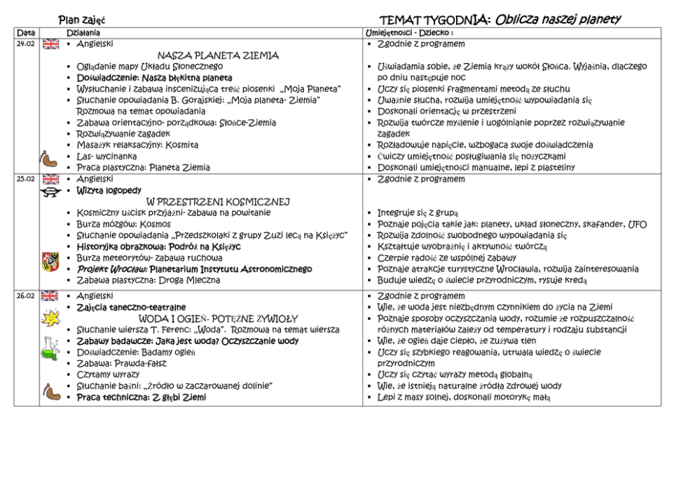 TEMAT TYGODNIA: Plan zajęć Data 24.02 Działania Umiejętności - Dziecko : Angielski Zgodnie z programem 25.02 26.02 NASZA PLANETA ZIEMIA Oglądanie mapy Układu Słonecznego Doświadczenie: Nasza błękitna planeta Wysłuchanie i zabawa inscenizująca treść piosenki „Moja Planeta” Słuchanie opowiadania B. Gorajskiej: „Moja planeta- Ziemia” Rozmowa na temat opowiadania Zabawa orientacyjno- porządkowa: Słońce-Ziemia Rozwiązywanie zagadek Masażyk relaksacyjny: Kosmita Las- wycinanka Praca plastyczna: Planeta Ziemia Angielski Wizyta logopedy W PRZESTRZENI KOSMICZNEJ Kosmiczny uścisk przyjaźni- zabawa na powitanie Burza mózgów: Kosmos Słuchanie opowiadania „Przedszkolaki z grupy Zuzi lecą na Księżyc” Historyjka obrazkowa: Podróż na Księżyc Burza meteorytów- zabawa ruchowa Projekt Wrocław: Planetarium Instytutu Astronomicznego Zabawa plastyczna: Droga Mleczna Angielski Zajęcia taneczno-teatralne WODA I OGIEŃ- POTĘŻNE ŻYWIOŁY Słuchanie wiersza T. Ferenc: „Woda”. Rozmowa na temat wiersza Zabawy badawcze: Jaka jest woda? Oczyszczanie wody Doświadczenie: Badamy ogień Zabawa: Prawda-fałsz Czytamy wyrazy Słuchanie baśni: „Źródło w zaczarowanej dolinie” Praca techniczna: Z głębi Ziemi Oblicza naszej planety Uświadamia sobie, że Ziemia krąży wokół Słońca. Wyjaśnia, dlaczego po dniu następuje noc Uczy się piosenki fragmentami metodą ze słuchu Uważnie słucha, rozwija umiejętność wypowiadania się Doskonali orientację w przestrzeni Rozwija twórcze myślenie i uogólnianie poprzez rozwiązywanie zagadek Rozładowuje napięcie, wzbogaca swoje doświadczenia Ćwiczy umiejętność posługiwania się nożyczkami Doskonali umiejętności manualne, lepi z plasteliny Zgodnie z programem Integruje się z grupą Poznaje pojęcia takie jak: planety, układ słoneczny, skafander, UFO Rozwija zdolność swobodnego wypowiadania się Kształtuje wyobraźnię i aktywność twórczą Czerpie radość ze wspólnej zabawy Poznaje atrakcje turystyczne Wrocławia, rozwija zainteresowania Buduje wiedzę o świecie przyrodniczym, rysuje kredą Zgodnie z programem Wie, że woda jest niezbędnym czynnikiem do życia na Ziemi Poznaje sposoby oczyszczania wody, rozumie że rozpuszczalność różnych materiałów zależy od temperatury i rodzaju substancji Wie, że ogień daje ciepło, że zużywa tlen Uczy się szybkiego reagowania, utrwala wiedzę o świecie przyrodniczym Uczy się czytać wyrazy metodą globalną Wie, że istnieją naturalne źródła zdrowej wody Lepi z masy solnej, doskonali motorykę małą 27.02 Angielski Rytmika Zgodnie z programem ZABAWY Z POWIETRZEM Powitalny wierszyk: „Pobawić się z powietrzem” Wieje wiatr- ćwiczenia słuchowe Zabawa ruchowa: Wiatr czarodziej Ekspresja plastyczna: Czarodziejska różdżka wiatru Słuchanie wiersza L.J. Kerna: „Piotruś i powietrze” Powietrze wokół nas- zabawy badawcze Zabawy balonami Angielski Słucha dźwięków dobiegających z otoczenia, rozpoznaje i nazywa te dźwięki Reaguje odpowiednim ruchem na sygnał muzyczny Rozwija kreatywność i wyobraźnię Poznaje pomocne człowiekowi i niebezpieczne siły przyrody Aktywnie uczestniczy w doświadczeniach, poznaje właściwości powietrza, poszerza wiedzę Ozdabia balon według własnego pomysłu Zgodnie z programem 27.02 Basen- zajęcia fakultatywne WYPRAWA TROPICIELI W KOSMOS Zabawa z wycinaniem: Mój bilet w kosmos Odczytanie listu od Kosmoludka Opowieść ruchowa: Lecimy w kosmos Tropiciele na tropie wymyślonych planet Zwiedzamy kosmos- zabawa grupowa Zabawa plastyczna: Moja rakieta Wycina gwiazdę ze swoim imieniem, przykleja na rakietę Tropi po śladach list od Kosmoludka Doskonali koordynację wzrokowo-ruchowa Wykonuje różne zadania, aby dostać się na kolejne planety Aktywnie uczestniczy we wspólnej zabawie, współpracuje z grupą Doskonali umiejętności manualne
