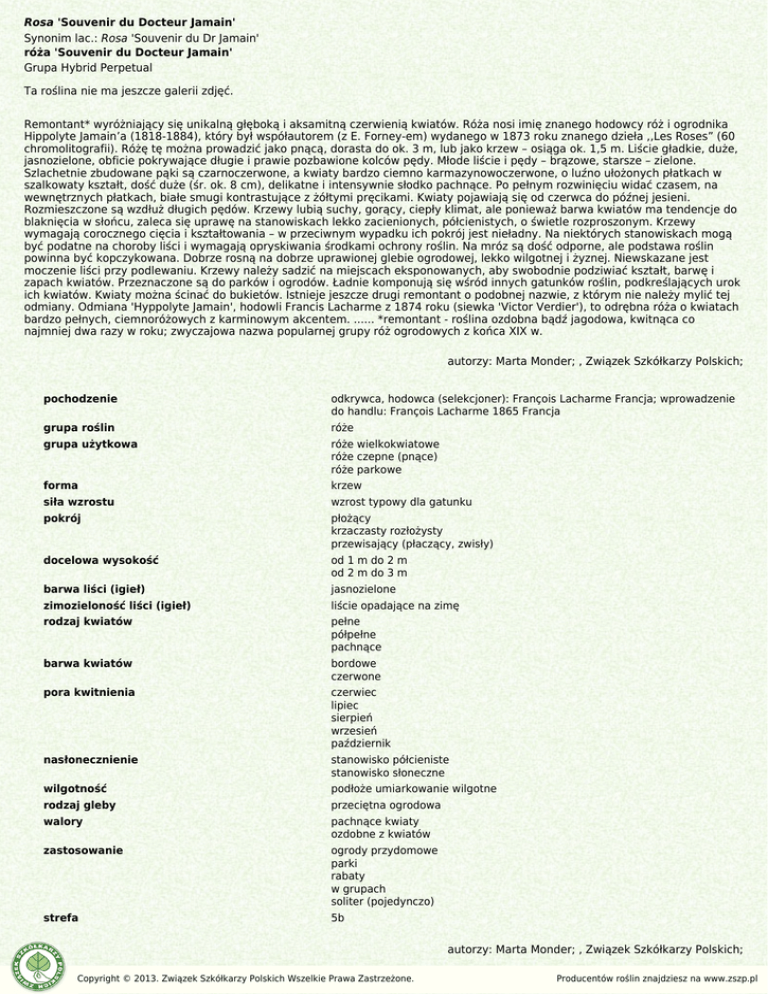 Rosa 'Souvenir du Docteur Jamain' Synonim lac.: Rosa 'Souvenir du Dr Jamain' róża 'Souvenir du Docteur Jamain' Grupa Hybrid Perpetual Ta roślina nie ma jeszcze galerii zdjęć. Remontant* wyróżniający się unikalną głęboką i aksamitną czerwienią kwiatów. Róża nosi imię znanego hodowcy róż i ogrodnika Hippolyte Jamain’a (1818-1884), który był współautorem (z E. Forney-em) wydanego w 1873 roku znanego dzieła ,,Les Roses” (60 chromolitografii). Różę tę można prowadzić jako pnącą, dorasta do ok. 3 m, lub jako krzew – osiąga ok. 1,5 m. Liście gładkie, duże, jasnozielone, obficie pokrywające długie i prawie pozbawione kolców pędy. Młode liście i pędy – brązowe, starsze – zielone. Szlachetnie zbudowane pąki są czarnoczerwone, a kwiaty bardzo ciemno karmazynowoczerwone, o luźno ułożonych płatkach w szalkowaty kształt, dość duże (śr. ok. 8 cm), delikatne i intensywnie słodko pachnące. Po pełnym rozwinięciu widać czasem, na wewnętrznych płatkach, białe smugi kontrastujące z żółtymi pręcikami. Kwiaty pojawiają się od czerwca do późnej jesieni. Rozmieszczone są wzdłuż długich pędów. Krzewy lubią suchy, gorący, ciepły klimat, ale ponieważ barwa kwiatów ma tendencje do blaknięcia w słońcu, zaleca się uprawę na stanowiskach lekko zacienionych, półcienistych, o świetle rozproszonym. Krzewy wymagają corocznego cięcia i kształtowania – w przeciwnym wypadku ich pokrój jest nieładny. Na niektórych stanowiskach mogą być podatne na choroby liści i wymagają opryskiwania środkami ochrony roślin. Na mróz są dość odporne, ale podstawa roślin powinna być kopczykowana. Dobrze rosną na dobrze uprawionej glebie ogrodowej, lekko wilgotnej i żyznej. Niewskazane jest moczenie liści przy podlewaniu. Krzewy należy sadzić na miejscach eksponowanych, aby swobodnie podziwiać kształt, barwę i zapach kwiatów. Przeznaczone są do parków i ogrodów. Ładnie komponują się wśród innych gatunków roślin, podkreślających urok ich kwiatów. Kwiaty można ścinać do bukietów. Istnieje jeszcze drugi remontant o podobnej nazwie, z którym nie należy mylić tej odmiany. Odmiana 'Hyppolyte Jamain', hodowli Francis Lacharme z 1874 roku (siewka 'Victor Verdier'), to odrębna róża o kwiatach bardzo pełnych, ciemnoróżowych z karminowym akcentem. ...... *remontant - roślina ozdobna bądź jagodowa, kwitnąca co najmniej dwa razy w roku; zwyczajowa nazwa popularnej grupy róż ogrodowych z końca XIX w. autorzy: Marta Monder; , Związek Szkółkarzy Polskich; pochodzenie odkrywca, hodowca (selekcjoner): François Lacharme Francja; wprowadzenie do handlu: François Lacharme 1865 Francja grupa roślin róże grupa użytkowa róże wielkokwiatowe róże czepne (pnące) róże parkowe forma krzew siła wzrostu wzrost typowy dla gatunku pokrój płożący krzaczasty rozłożysty przewisający (płaczący, zwisły) docelowa wysokość od 1 m do 2 m od 2 m do 3 m barwa liści (igieł) jasnozielone zimozieloność liści (igieł) liście opadające na zimę rodzaj kwiatów pełne półpełne pachnące barwa kwiatów bordowe czerwone pora kwitnienia czerwiec lipiec sierpień wrzesień październik nasłonecznienie stanowisko półcieniste stanowisko słoneczne wilgotność podłoże umiarkowanie wilgotne rodzaj gleby przeciętna ogrodowa walory pachnące kwiaty ozdobne z kwiatów zastosowanie ogrody przydomowe parki rabaty w grupach soliter (pojedynczo) strefa 5b autorzy: Marta Monder; , Związek Szkółkarzy Polskich; Copyright © 2013. Związek Szkółkarzy Polskich Wszelkie Prawa Zastrzeżone. Producentów roślin znajdziesz na www.zszp.pl Copyright © 2013. Związek Szkółkarzy Polskich Wszelkie Prawa Zastrzeżone. Producentów roślin znajdziesz na www.zszp.pl