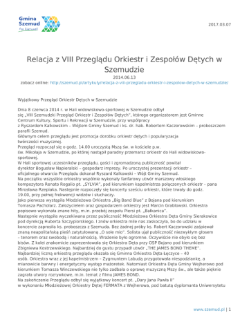 2017.03.07 Relacja z VIII Przeglądu Orkiestr i Zespołów Dętych w Szemudzie 2014.06.13 zobacz online: http://szemud.pl/artykuly/relacja-z-viii-przegladu-orkiestr-i-zespolow-detych-w-szemudzie/ Wyjątkowy Przegląd Orkiestr Dętych w Szemudzie Dnia 8 czerwca 2014 r. w Hali widowiskowo-sportowej w Szemudzie odbył się „VIII Szemudzki Przegląd Orkiestr i Zespołów Dętych”, którego organizatorem jest Gminne Centrum Kultury, Sportu i Rekreacji w Szemudzie, przy współpracy z Ryszardem Kalkowskim – Wójtem Gminy Szemud i ks. dr. hab. Robertem Kaczorowskim – proboszczem parafii Szemud. Głównym celem przeglądu jest promocja dorobku orkiestr dętych i popularyzacja twórczości muzycznej. Przegląd rozpoczął się o godz. 14.00 uroczystą Mszą św. w kościele p.w. św. Mikołaja w Szemudzie, po której nastąpił paradny przemarsz orkiestr do Hali widowiskowosportowej. W Hali sportowej uczestników przeglądu, gości i zgromadzoną publiczność powitał dyrektor Bogusław Napieralski – gospodarz imprezy. Po uroczystej prezentacji orkiestr – oficjalnego otwarcia Przeglądu dokonał Ryszard Kalkowski – Wójt Gminy Szemud. Na początku wszystkie orkiestry wspólnie wykonały fanfarowy utwór marszowy włoskiego kompozytora Renato Rogalio pt. „SYLVIA”, pod kierunkiem kapelmistrza połączonych orkiestr – pana Mirosława Rzepiaka. Następnie rozpoczęły się koncerty sześciu orkiestr, które trwały do godz. 19.00, przy pełnej frekwencji widzów i słuchaczy. Jako pierwsza wystąpiła Młodzieżowa Orkiestra „Big Band Blue” z Bojana pod kierunkiem Tomasza Pacholarz. Założycielem oraz gospodarzem orkiestry jest Marcin Grablowski. Orkiestra popisowo wykonała znane hity, m.in. przebój zespołu Piersi pt. „Bałkanica”. Następnie wystąpiła wyczekiwana przez publiczność Młodzieżowa Orkiestra Dęta Gminy Sierakowice pod dyrekcją Huberta Szczypiorskiego. I znów orkiestra mile nas zaskoczyła, bo do udziału w koncercie zaprosiła ks. proboszcza z Szemuda. Bez żadnej próby ks. Robert Kaczorowski zaśpiewał znaną neapolitańską pieśń zatytułowaną „O sole mio”. Solista ujął publiczność niezwykłym głosem – tenorem oraz swobodą i naturalnością. Wrażenie było ogromne. Oczywiście nie obyło się bez bisów. Z kolei znakomicie zaprezentowała się Orkiestra Dęta przy OSP Bojano pod kierunkiem Zbigniewa Kostrzewskiego. Najbardziej do gustu przypadł utwór „THE JAMES BOND THEME”. Najbardziej liczną orkiestrą przeglądu okazała się Gminna Orkiestra Dęta Łęczyce – 40 osób. Orkiestra wraz z jej kapelmistrzem – Zygmuntem Labudą przygotowała niespodziankę, a mianowicie barwny i energetyczny występ mażoretek. Natomiast Orkiestra Dęta Gminy Wejherowo pod kierunkiem Tomasza Winczewskiego nie tylko zadbała o oprawę muzyczną Mszy św., ale także pięknie zagrała utwory rozrywkowe, m.in. temat z filmu JAMES BOND. Na zakończenie Przeglądu odbył się wyjątkowy koncert pt. „Dary Jana Pawła II” w wykonaniu Młodzieżowej Orkiestry Dętej FERMATA z Wejherowa, pod batutą dyplomanta Uniwersytetu www.szemud.pl | 1 2017.03.07 Muzycznego im. Fryderyka Chopina w Warszawie – Dawida Runtz. Koncert poświęcony był Świętemu Janowi Pawłowi II. W ten sposób Organizatorzy i Orkiestra uczcili świętość i kanonizację Największego naszego Rodaka. W programie koncertu usłyszeliśmy utwory najwybitniejszych polskich kompozytorów. Gościnnie w koncercie wystąpił Wojciech Rybakowski – reżyser Misterium Męki Pańskiej. Każda orkiestra po występie uhonorowana została za udział w przeglądzie pamiątkowym dyplomem oraz pucharem, które wręczali goście honorowi: ks. dr hab. Robert Kaczorowski i Joanna Panek – Zastępca Wójta Gminy Szemud. Przegląd kolejny raz potwierdził, że orkiestry dęte mają swój niepowtarzalny urok i niesamowity klimat. Na koniec, w imieniu Organizatorów, pragnę serdecznie podziękować wszystkim, którzy pomogli przy organizacji lub wsparli finansowo nasz Przegląd, tj. p. Jolancie Malinowskiej, p. Stanisławie Hirsz, p. Stefanowi Halman, p. Stanisławowi Kowalewskiemu, p. Robertowi Pstrągowskiemu – prezesowi firmy „ARMET BIS”, dyrekcji Banku Rumia Spółdzielczego, dh Pawłowi Milewczyk i strażakom OSP Szemud oraz wolontariuszkom, a także wspaniałym paniom z KGW Głazica za przygotowane ciasta i innych słodkości. Należy podkreślić, że Przegląd został dofinansowany z budżetu Gminy Szemud i Powiatu Wejherowskiego. Leszek Walkowiak Fot. Karina Treder www.szemud.pl | 2