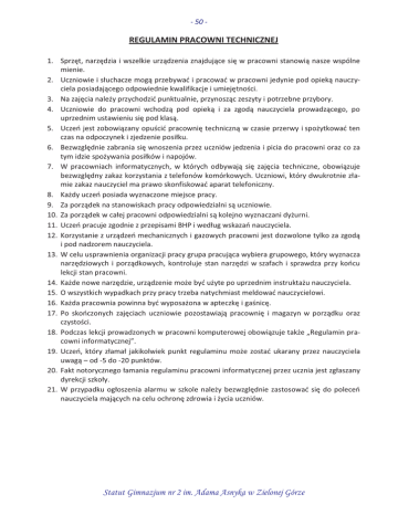- 50 - REGULAMIN PRACOWNI TECHNICZNEJ 1. Sprzęt, narzędzia i wszelkie urządzenia znajdujące się w pracowni stanowią nasze wspólne mienie. 2. Uczniowie i słuchacze mogą przebywać i pracować w pracowni jedynie pod opieką nauczyciela posiadającego odpowiednie kwalifikacje i umiejętności. 3. Na zajęcia należy przychodzić punktualnie, przynosząc zeszyty i potrzebne przybory. 4. Uczniowie do pracowni wchodzą pod opieką i za zgodą nauczyciela prowadzącego, po uprzednim ustawieniu się pod klasą. 5. Uczeń jest zobowiązany opuścić pracownię techniczną w czasie przerwy i spożytkować ten czas na odpoczynek i zjedzenie posiłku. 6. Bezwzględnie zabrania się wnoszenia przez uczniów jedzenia i picia do pracowni oraz co za tym idzie spożywania posiłków i napojów. 7. W pracowniach informatycznych, w których odbywają się zajęcia techniczne, obowiązuje bezwzględny zakaz korzystania z telefonów komórkowych. Uczniowi, który dwukrotnie złamie zakaz nauczyciel ma prawo skonfiskować aparat telefoniczny. 8. Każdy uczeń posiada wyznaczone miejsce pracy. 9. Za porządek na stanowiskach pracy odpowiedzialni są uczniowie. 10. Za porządek w całej pracowni odpowiedzialni są kolejno wyznaczani dyżurni. 11. Uczeń pracuje zgodnie z przepisami BHP i według wskazań nauczyciela. 12. Korzystanie z urządzeń mechanicznych i gazowych pracowni jest dozwolone tylko za zgodą i pod nadzorem nauczyciela. 13. W celu usprawnienia organizacji pracy grupa pracująca wybiera grupowego, który wyznacza narzędziowych i porządkowych, kontroluje stan narzędzi w szafach i sprawdza przy końcu lekcji stan pracowni. 14. Każde nowe narzędzie, urządzenie może być użyte po uprzednim instruktażu nauczyciela. 15. O wszystkich wypadkach przy pracy trzeba natychmiast meldować nauczycielowi. 16. Każda pracownia powinna być wyposażona w apteczkę i gaśnicę. 17. Po skończonych zajęciach uczniowie pozostawiają pracownię i magazyn w porządku oraz czystości. 18. Podczas lekcji prowadzonych w pracowni komputerowej obowiązuje także „Regulamin pracowni informatycznej”. 19. Uczeń, który złamał jakikolwiek punkt regulaminu może zostać ukarany przez nauczyciela uwagą – od -5 do -20 punktów. 20. Fakt notorycznego łamania regulaminu pracowni informatycznej przez ucznia jest zgłaszany dyrekcji szkoły. 21. W przypadku ogłoszenia alarmu w szkole należy bezwzględnie zastosować się do poleceń nauczyciela mających na celu ochronę zdrowia i życia uczniów. Statut Gimnazjum nr 2 im. Adama Asnyka w Zielonej Górze