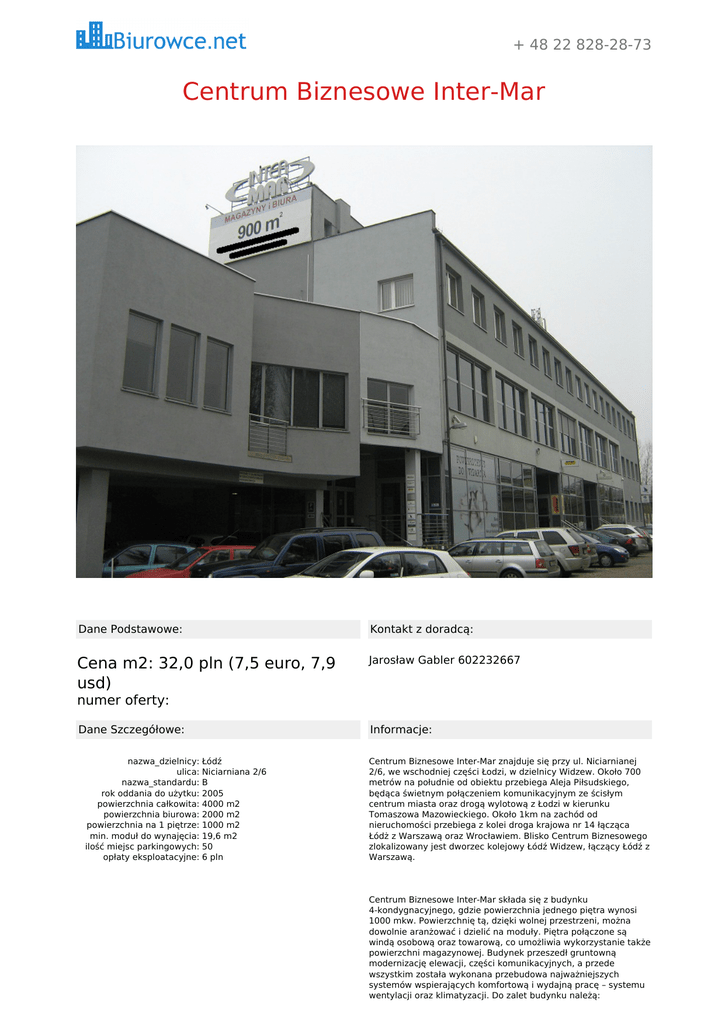 + 48 22 828-28-73 Centrum Biznesowe Inter-Mar Dane Podstawowe: Kontakt z doradcą: Cena m2: 32,0 pln (7,5 euro, 7,9 usd) Jarosław Gabler 602232667 numer oferty: Dane Szczegółowe: nazwa_dzielnicy: Łódź ulica: Niciarniana 2/6 nazwa_standardu: B rok oddania do użytku: 2005 powierzchnia całkowita: 4000 m2 powierzchnia biurowa: 2000 m2 powierzchnia na 1 piętrze: 1000 m2 min. moduł do wynajęcia: 19,6 m2 ilość miejsc parkingowych: 50 opłaty eksploatacyjne: 6 pln Informacje: Centrum Biznesowe Inter-Mar znajduje się przy ul. Niciarnianej 2/6, we wschodniej części Łodzi, w dzielnicy Widzew. Około 700 metrów na południe od obiektu przebiega Aleja Piłsudskiego, będąca świetnym połączeniem komunikacyjnym ze ścisłym centrum miasta oraz drogą wylotową z Łodzi w kierunku Tomaszowa Mazowieckiego. Około 1km na zachód od nieruchomości przebiega z kolei droga krajowa nr 14 łącząca Łódż z Warszawą oraz Wrocławiem. Blisko Centrum Biznesowego zlokalizowany jest dworzec kolejowy Łódź Widzew, łączący Łódź z Warszawą. Centrum Biznesowe Inter-Mar składa się z budynku 4-kondygnacyjnego, gdzie powierzchnia jednego piętra wynosi 1000 mkw. Powierzchnię tą, dzięki wolnej przestrzeni, można dowolnie aranżować i dzielić na moduły. Piętra połączone są windą osobową oraz towarową, co umożliwia wykorzystanie także powierzchni magazynowej. Budynek przeszedł gruntowną modernizację elewacji, części komunikacyjnych, a przede wszystkim została wykonana przebudowa najważniejszych systemów wspierających komfortową i wydajną pracę – systemu wentylacji oraz klimatyzacji. Do zalet budynku należą: - podłoga techniczna; - wykładzina; - podwieszany sufit typu armstrong; - otwierane okna; - zasilanie energetyczne; - instalacja oświetleniowa lastrowa; - instalacja komputerowa; - kilku operatorów telefonicznych; - klimatyzacja i wentylacja; - ogrzewanie centralne z własnej kotłowni; - monitoring obiektu; - recepcja; biurowce.net Adres:ul. Konduktorska 4 lok. 30, Warszawa, [email protected]