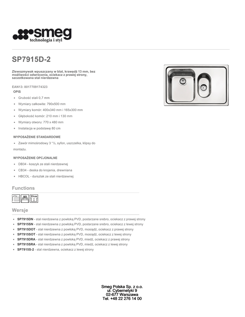 SP7915D-2 Zlewozmywak wpuszczany w blat, krawędź 13 mm, bez możliwości odwrócenia, ociekacz z prawej strony, szczotkowana stal nierdzewna EAN13: 8017709174323 OPIS Grubość stali 0,7 mm Wymiary całkowite: 790x500 mm Wymiary komór: 400x340 mm i 165x300 mm Głębokość komór: 210 mm i 130 mm Wymiary otworu: 770 x 480 mm Instalacja w podstawę 80 cm WYPOSAŻENIE STANDARDOWE Zawór mimośrodowy 3 “½, syfon, uszczelka, klipsy do montażu. WYPOSAŻENIE OPCJONALNE DB34 - koszyk ze stali nierdzewnej CB34 - deska do krojenia, drewniana HBCOL - durszlak ze stali nierdzewnej Functions Wersje SP7915DN - stal nierdzewna z powłoką PVD, postarzane srebro, ociekacz z prawej strony SP7915SN - stal nierdzewna z powłoką PVD, postarzane srebro, ociekacz z lewej strony SP7915DOT - stal nierdzewna z powłoką PVD, mosiądź, ociekacz z prawej strony SP7915SOT - stal nierdzewna z powłoką PVD, mosiądź, ociekacz z lewej strony SP7915DRA - stal nierdzewna z powłoką PVD, miedź, ociekacz z prawej strony SP7915SRA - stal nierdzewna z powłoką PVD, miedź, ociekacz z lewej strony SP7915S-2 - stal nierdzewna, ociekacz z lewej strony Smeg Polska Sp. z o.o. ul. Cybernetyki 9 02-677 Warszawa Tel. +48 22 276 14 00 SP7915D-2 iLOŚĆ KOMÓR: 2 stal nierdzewna 79 cm zlewozmywaki ze stali nierdzewnej wpuszczane w blat INSTALACJA STANDARDOWA: Tradycyjna instalacja nad blatem. 80 CM PODSTAWA: Szerokość szafki/ podstawy wymagana do instalacji - 80 cm GŁEBOKOŚĆ KOMORY: Głębokość komory zależy od modelu i waha się od 16 do 24 cm Smeg Polska Sp. z o.o. ul. Cybernetyki 9 02-677 Warszawa Tel. +48 22 276 14 00 SP7915D-2 iLOŚĆ KOMÓR: 2 stal nierdzewna 79 cm zlewozmywaki ze stali nierdzewnej wpuszczane w blat Smeg Polska Sp. z o.o. ul. Cybernetyki 9 02-677 Warszawa Tel. +48 22 276 14 00