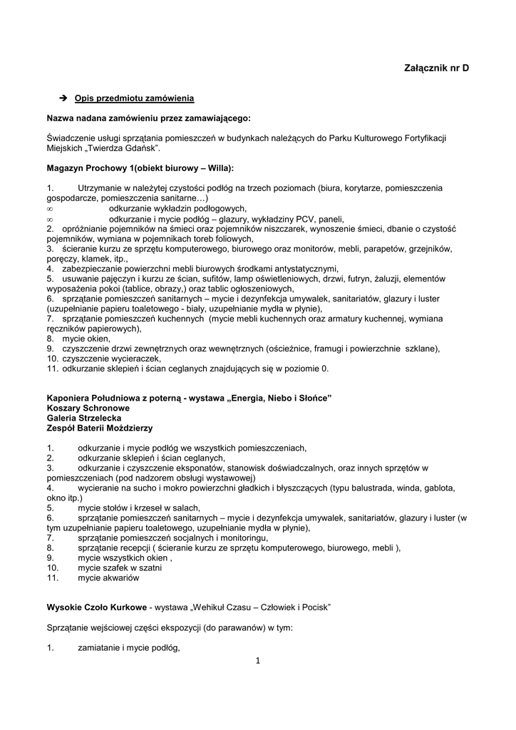 Załącznik nr D Opis przedmiotu zamówienia Nazwa nadana zamówieniu przez zamawiającego: Świadczenie usługi sprzątania pomieszczeń w budynkach naleŜących do Parku Kulturowego Fortyfikacji Miejskich „Twierdza Gdańsk”. Magazyn Prochowy 1(obiekt biurowy – Willa): 1. Utrzymanie w naleŜytej czystości podłóg na trzech poziomach (biura, korytarze, pomieszczenia gospodarcze, pomieszczenia sanitarne…) • odkurzanie wykładzin podłogowych, • odkurzanie i mycie podłóg – glazury, wykładziny PCV, paneli, 2. opróŜnianie pojemników na śmieci oraz pojemników niszczarek, wynoszenie śmieci, dbanie o czystość pojemników, wymiana w pojemnikach toreb foliowych, 3. ścieranie kurzu ze sprzętu komputerowego, biurowego oraz monitorów, mebli, parapetów, grzejników, poręczy, klamek, itp., 4. zabezpieczanie powierzchni mebli biurowych środkami antystatycznymi, 5. usuwanie pajęczyn i kurzu ze ścian, sufitów, lamp oświetleniowych, drzwi, futryn, Ŝaluzji, elementów wyposaŜenia pokoi (tablice, obrazy,) oraz tablic ogłoszeniowych, 6. sprzątanie pomieszczeń sanitarnych – mycie i dezynfekcja umywalek, sanitariatów, glazury i luster (uzupełnianie papieru toaletowego - biały, uzupełnianie mydła w płynie), 7. sprzątanie pomieszczeń kuchennych (mycie mebli kuchennych oraz armatury kuchennej, wymiana ręczników papierowych), 8. mycie okien, 9. czyszczenie drzwi zewnętrznych oraz wewnętrznych (ościeŜnice, framugi i powierzchnie szklane), 10. czyszczenie wycieraczek, 11. odkurzanie sklepień i ścian ceglanych znajdujących się w poziomie 0. Kaponiera Południowa z poterną - wystawa „Energia, Niebo i Słońce” Koszary Schronowe Galeria Strzelecka Zespół Baterii Moździerzy 1. odkurzanie i mycie podłóg we wszystkich pomieszczeniach, 2. odkurzanie sklepień i ścian ceglanych, 3. odkurzanie i czyszczenie eksponatów, stanowisk doświadczalnych, oraz innych sprzętów w pomieszczeniach (pod nadzorem obsługi wystawowej) 4. wycieranie na sucho i mokro powierzchni gładkich i błyszczących (typu balustrada, winda, gablota, okno itp.) 5. mycie stołów i krzeseł w salach, 6. sprzątanie pomieszczeń sanitarnych – mycie i dezynfekcja umywalek, sanitariatów, glazury i luster (w tym uzupełnianie papieru toaletowego, uzupełnianie mydła w płynie), 7. sprzątanie pomieszczeń socjalnych i monitoringu, 8. sprzątanie recepcji ( ścieranie kurzu ze sprzętu komputerowego, biurowego, mebli ), 9. mycie wszystkich okien , 10. mycie szafek w szatni 11. mycie akwariów Wysokie Czoło Kurkowe - wystawa „Wehikuł Czasu – Człowiek i Pocisk” Sprzątanie wejściowej części ekspozycji (do parawanów) w tym: 1. zamiatanie i mycie podłóg, 1 2. 3. 4. odkurzanie okien, parapetów oraz innych elementów części wejściowej, odkurzanie sklepień i ścian ceglanych, mycie szyb parawanów. Sprzątanie części ekspozycyjnej (za parawanem) w tym: 1. 2. 3. zamiatanie i mycie podłóg, odkurzanie wszystkich elementów ekspozycji oraz manekinów, mycie szyb parawanów. Trzy razy do roku gruntowne sprzątanie całej ekspozycji i poszczególnych jej elementów przy uŜyciu środków specjalistycznych (do konserwacji metalu, mosiądzu, drewna oraz skóry). KaŜdy element znajdujący się na ekspozycji powinien zostać zakonserwowany stosownym i przeznaczonym do tego środkiem. Zakres podstawowy usługi sprzątania obejmuje obiekty aktualnie uŜytkowane (sprzątanie podstawowe: 1 450 2 m ). Natomiast zakres dodatkowy dotyczy obiektów planowanych do uŜytkowania w drugiej połowie 2012 r. 2 (2 193 m ), W przypadku wykonywania usługi na powierzchniach dodatkowych w terminach nie przekraczających jednego miesiąca, rozliczenie dokonywane będzie proporcjonalnie do ilości dni, w których była wykonywana usługa. Przedmiot zamówienia obejmuje takŜe zakup i dostawę materiałów i środków niezbędnych do wykonania usługi sprzątania oraz utrzymania w/w pomieszczeń w naleŜytej czystości., takich jak: papier toaletowy, ręczniki, mydło w płynie, odświeŜacze powietrza, środki czyszczące itd. 2